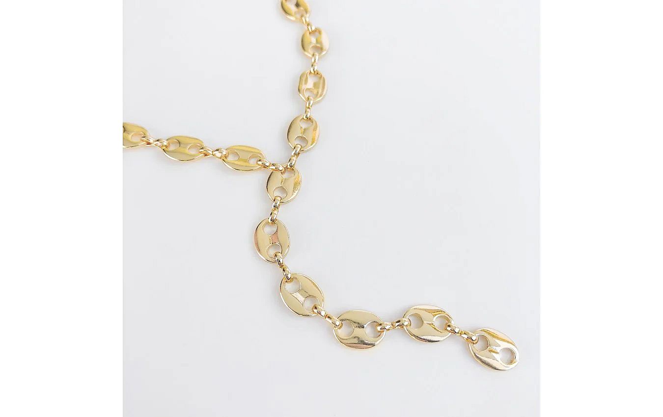 18" gold plated lariat necklace in mix metal chains. Top portion of the necklace is in paperclip chain and the bottom is in mariner chain with a 3" mariner lariat drop.