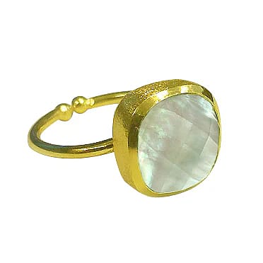 This adjustable ring has a faceted pillow cut Mother of Pearl white stone and is set in18k Gold Plate with a matte finish.