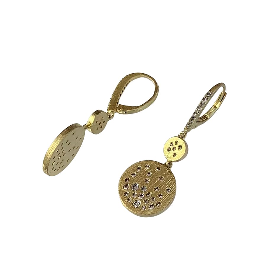 As part of our Little Black Dress Approved Collection; these matte gold earrings feature scattered pave czs set into two discs, 18kt matte plate and pave encrusted hinge ear wires.
