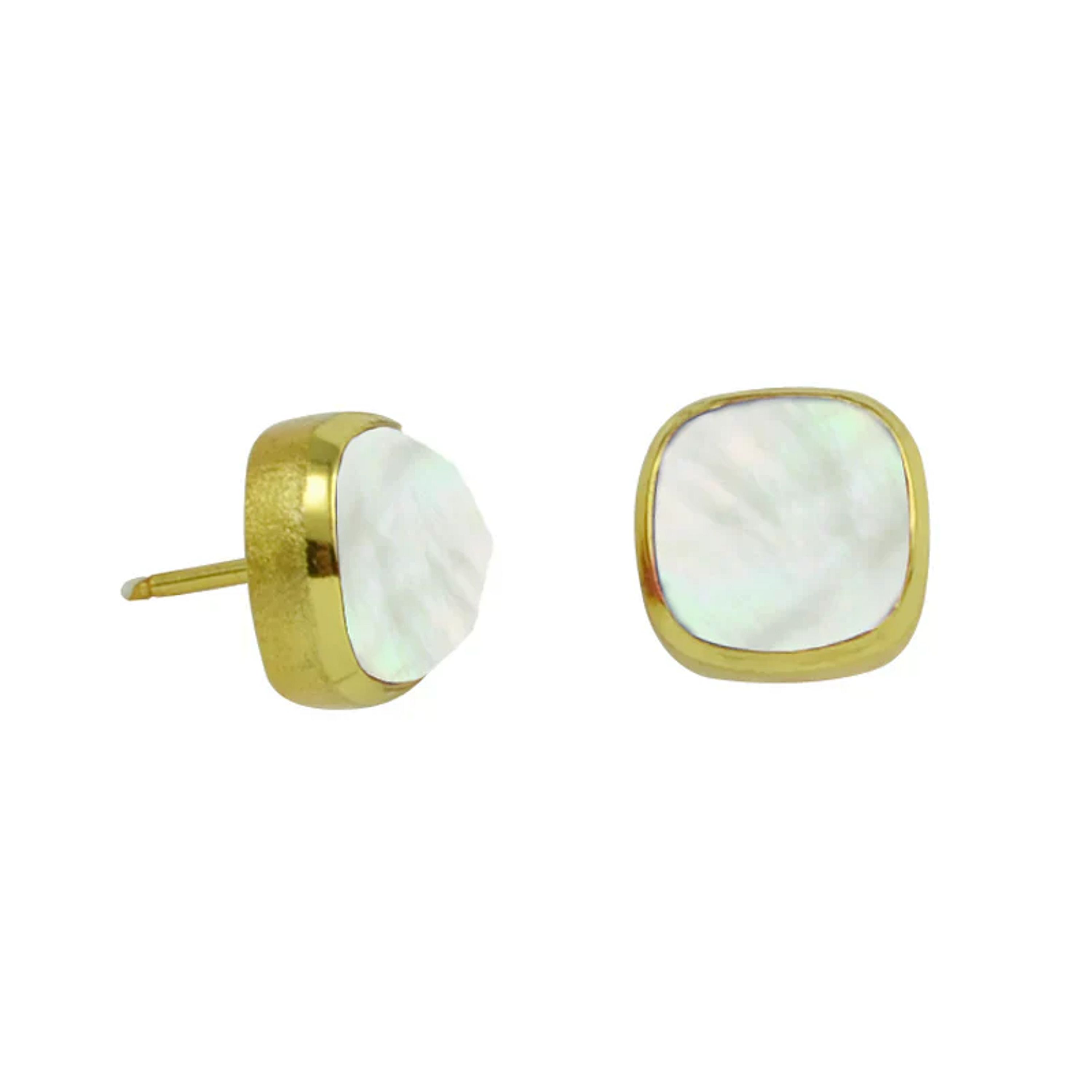 These faceted, pillow cut Mother of Pearl White Stud earrings are set in18k Gold Plate with a matte finish.18k Gold Plated.