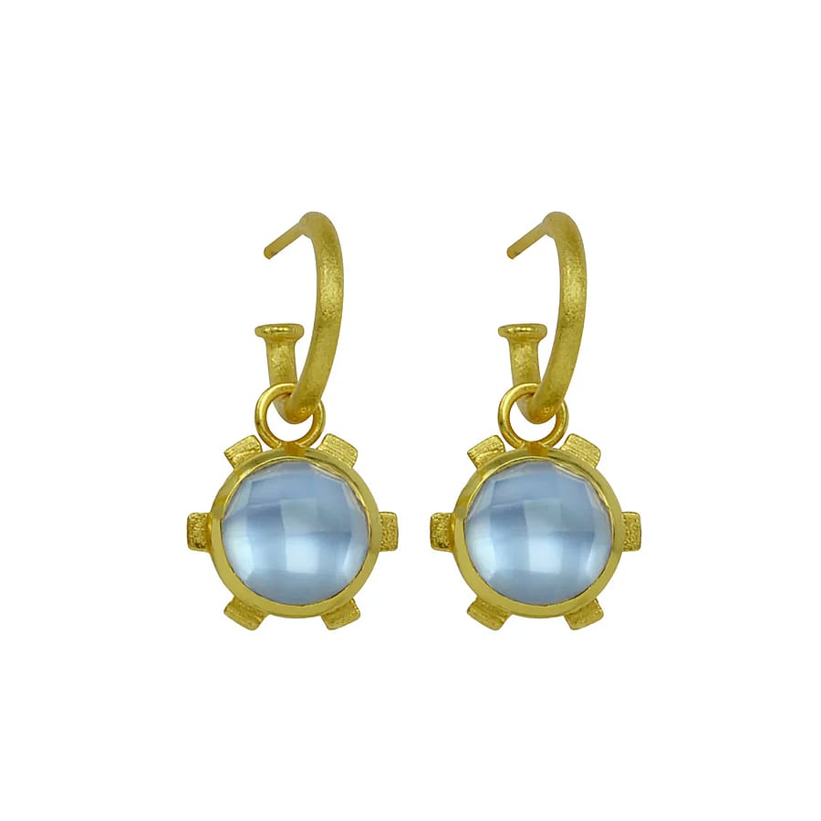 These faceted, round cut tanzanite blue stone drop earrings are set in18k Gold Plate with a matte finish.18k Gold Plated and feature a decorative geometric inspired bloom setting. Push back.