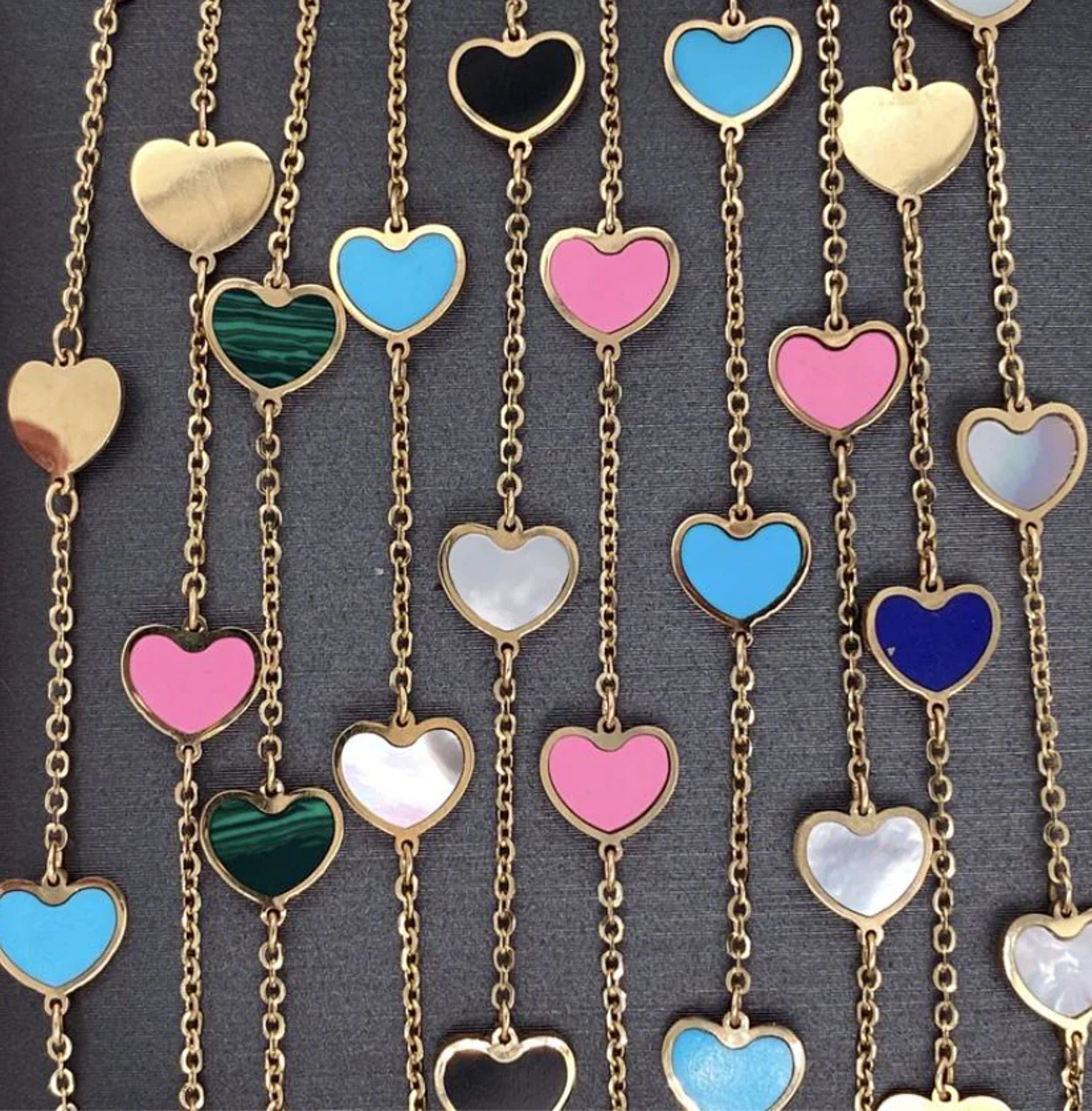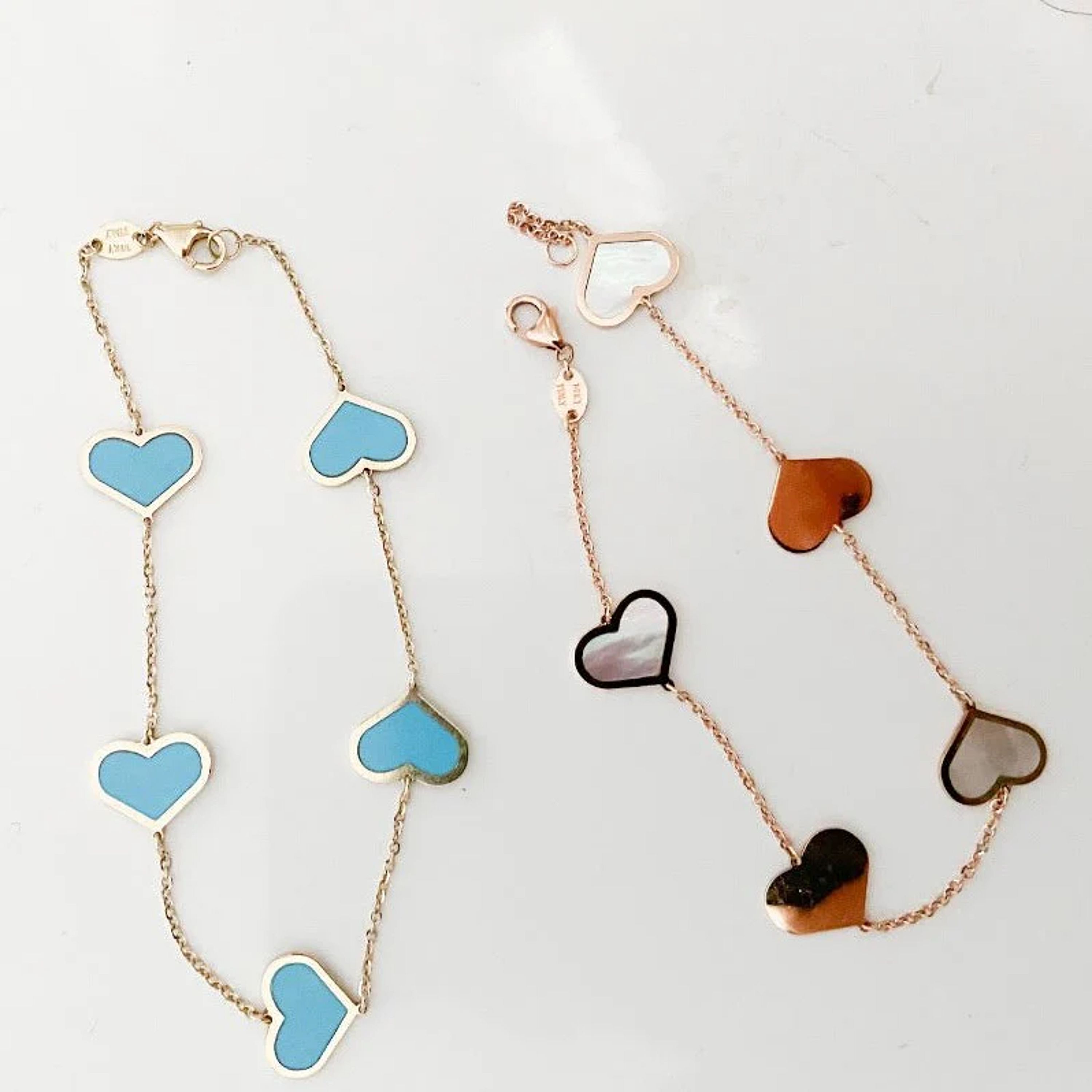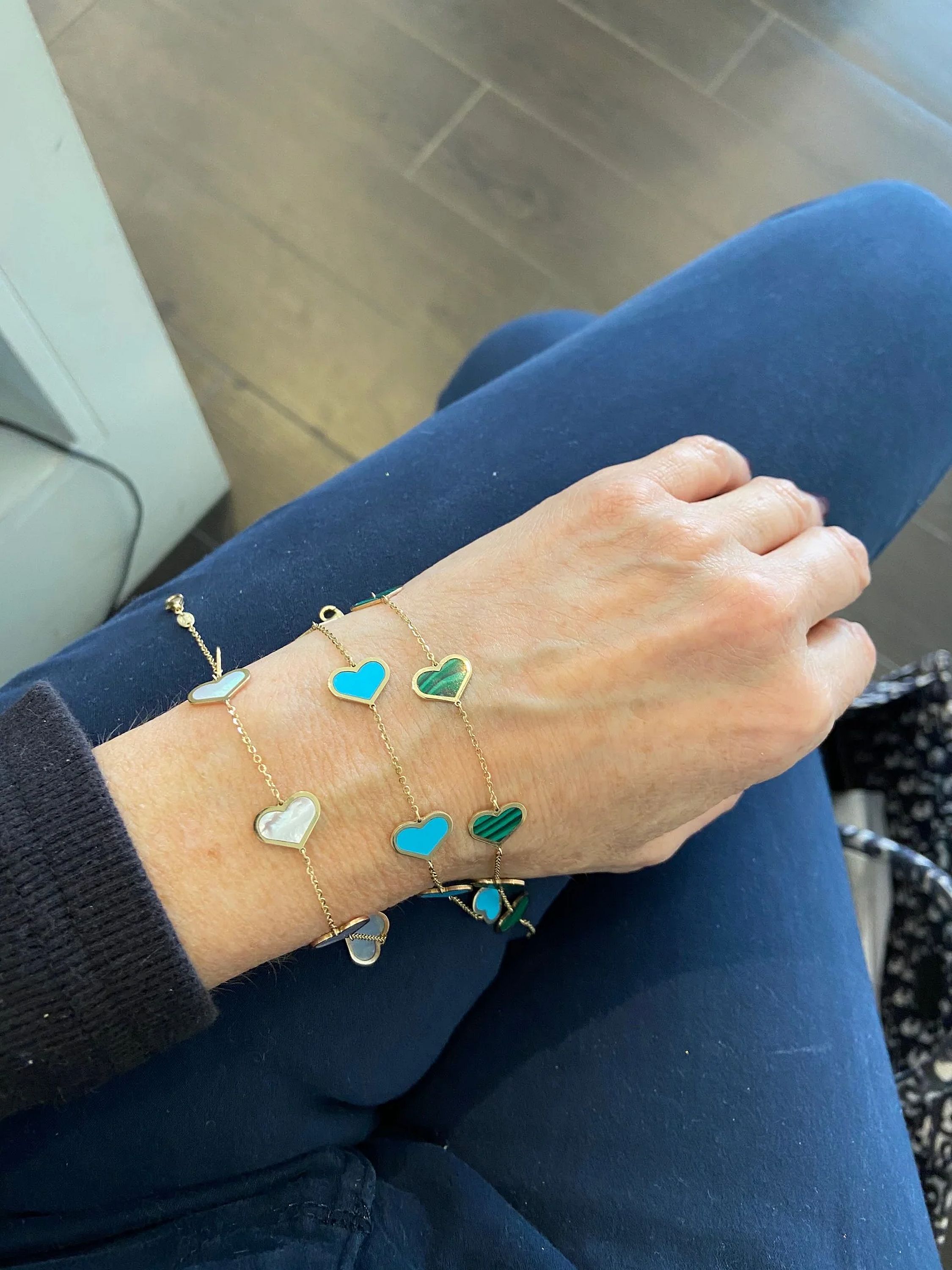 Beautiful Five Heart Bracelets crafted in solid 14 Karat Italian Gold with choices of ♥ Onyx ♥ Mother of Pearl with Onyx Hearts ♥ Mother of Pearl ♥ Turquoise Hearts ♥ Lapis Hearts ♥ Malachite Hearts ♥ Red Coral Hearts. Measurements: 7" bracelete Heart Measurements: 6 mm Height x 7 mm width x 0.7 mm Thickness