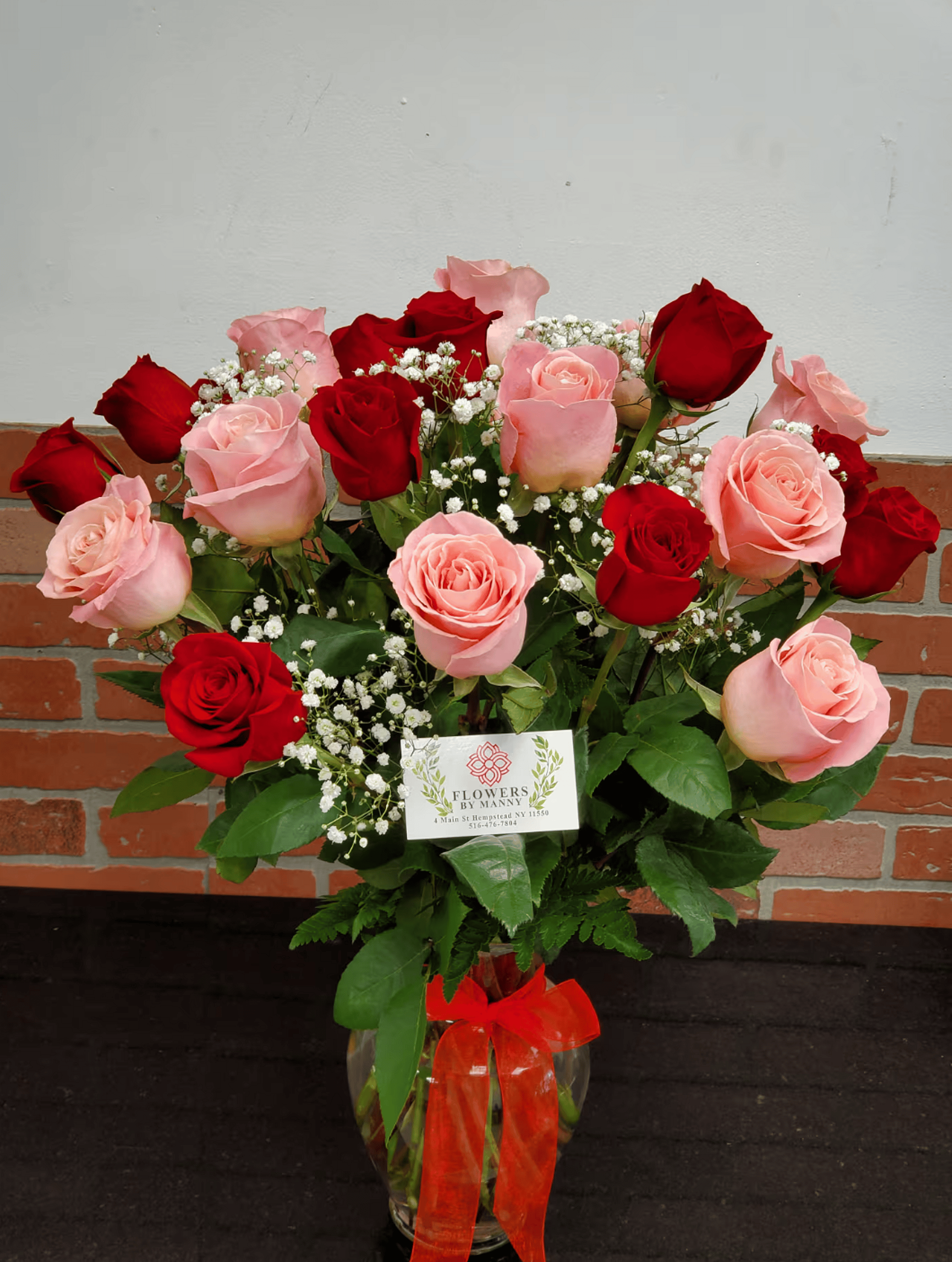 Dozen Red Rose's in a vase with baby breath