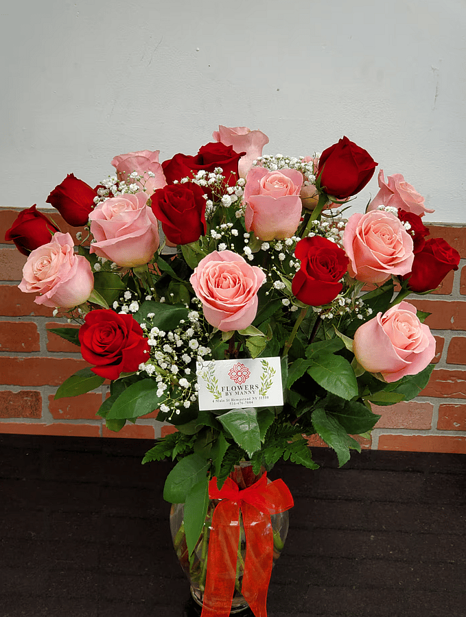 This is a nice combination of 12 light pink and 12 red roses in a vase.