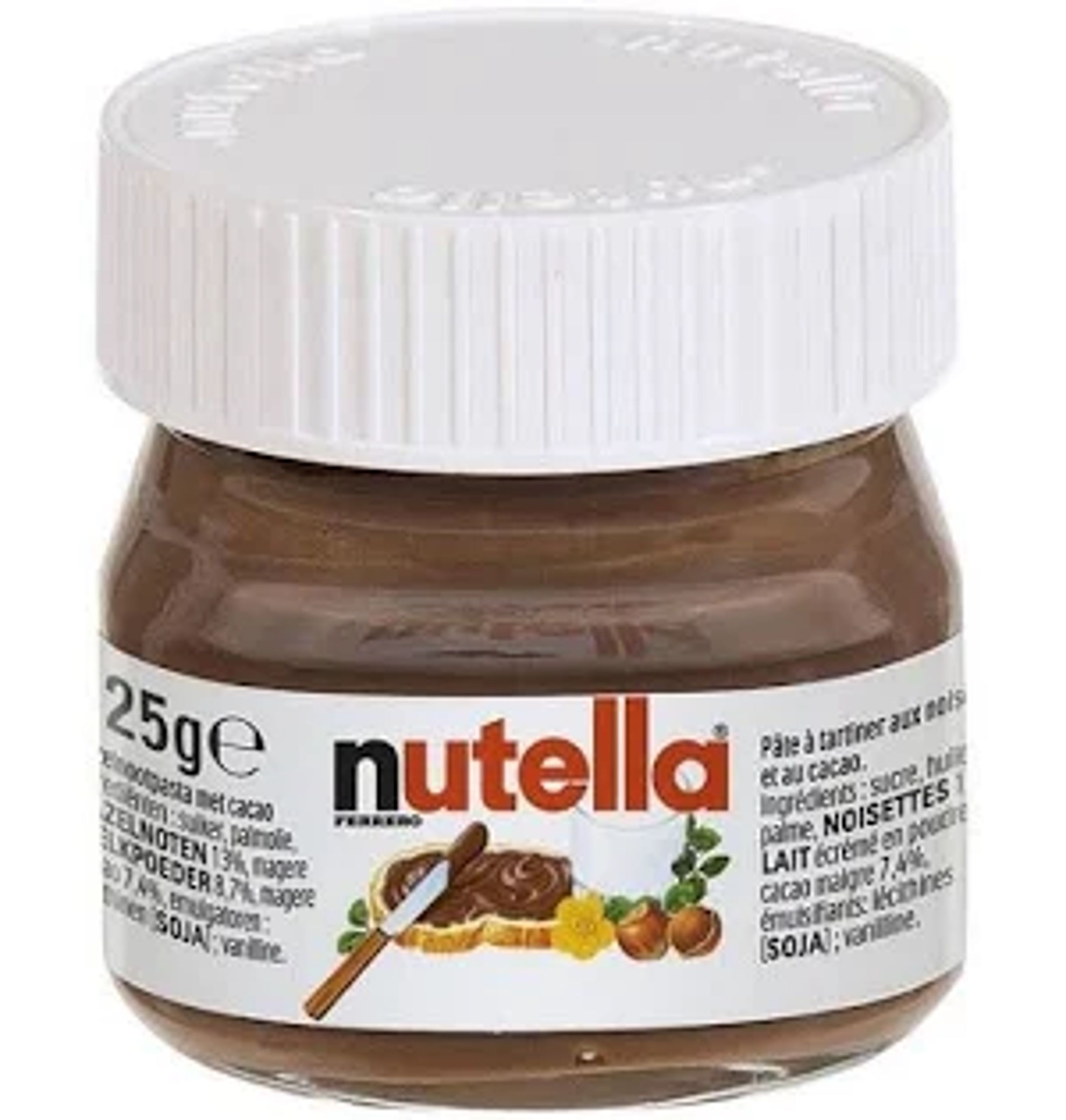 The Ferrero Nutella 25g mini jar is a single-serving,, 0.88 oz container of the iconic hazelnut cocoa spread. Ideal for portion control, travel, or breakfast, these miniature glass jars feature the same smooth, creamy, and rich taste, commonly used for bread, toast, and pancakes.