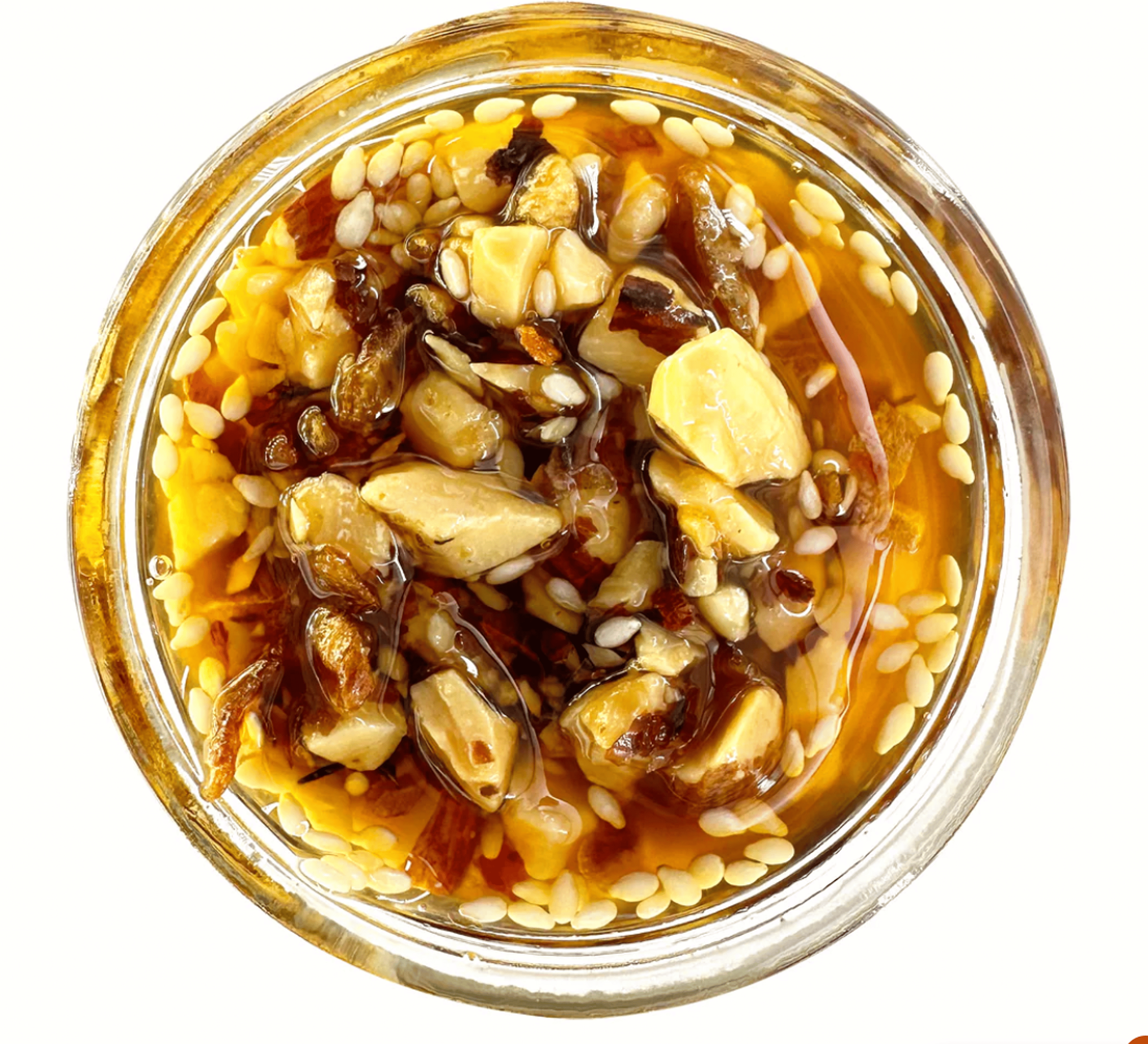 This flavor extraordinaire marries together roasted chunky nuts, crispy fried garlic & fried onions, toasted sesame seeds, and a chef-blend of herbs & spices in high grade grapeseed oil.