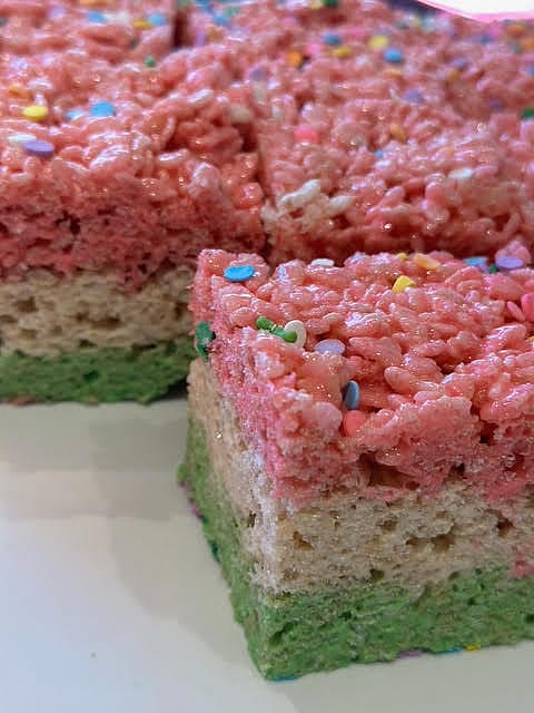 Rice Krispies cereal cooked with marshmallows and butter, finished with confetti sprinkles.