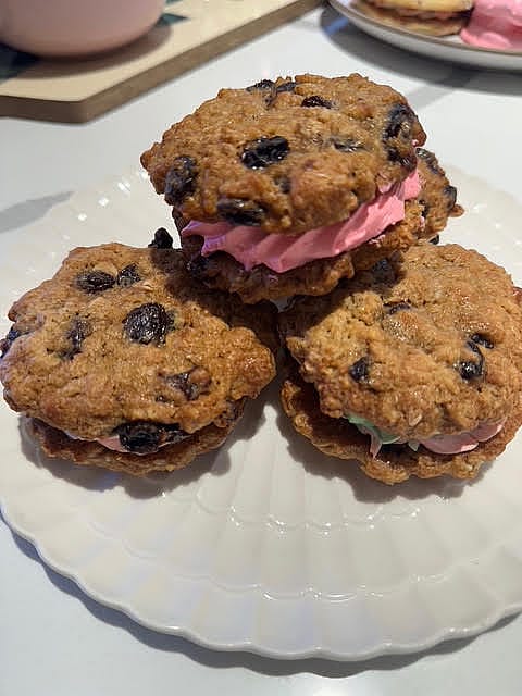 Oatmeal cookie sandwich filled with vanilla butter cream.