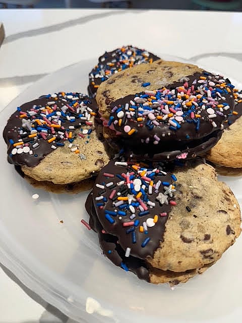 Chocolate chip cookie sandwich filled with butter cream finished with sprinkles.