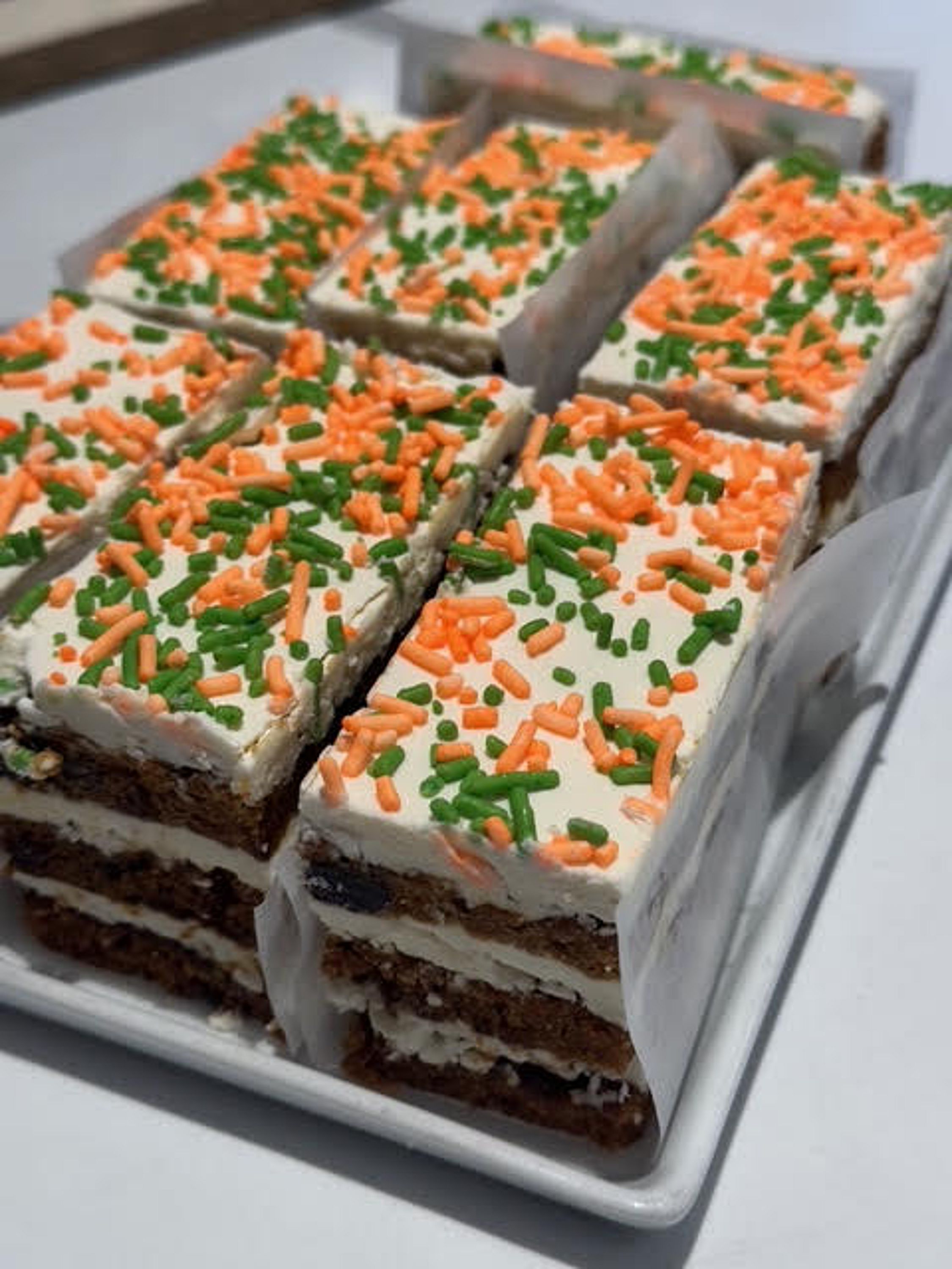 Spicy cinnamon cake blended with shredded carrots, studded with raisins, iced with cream cheese frosting and topped with sprinkles.