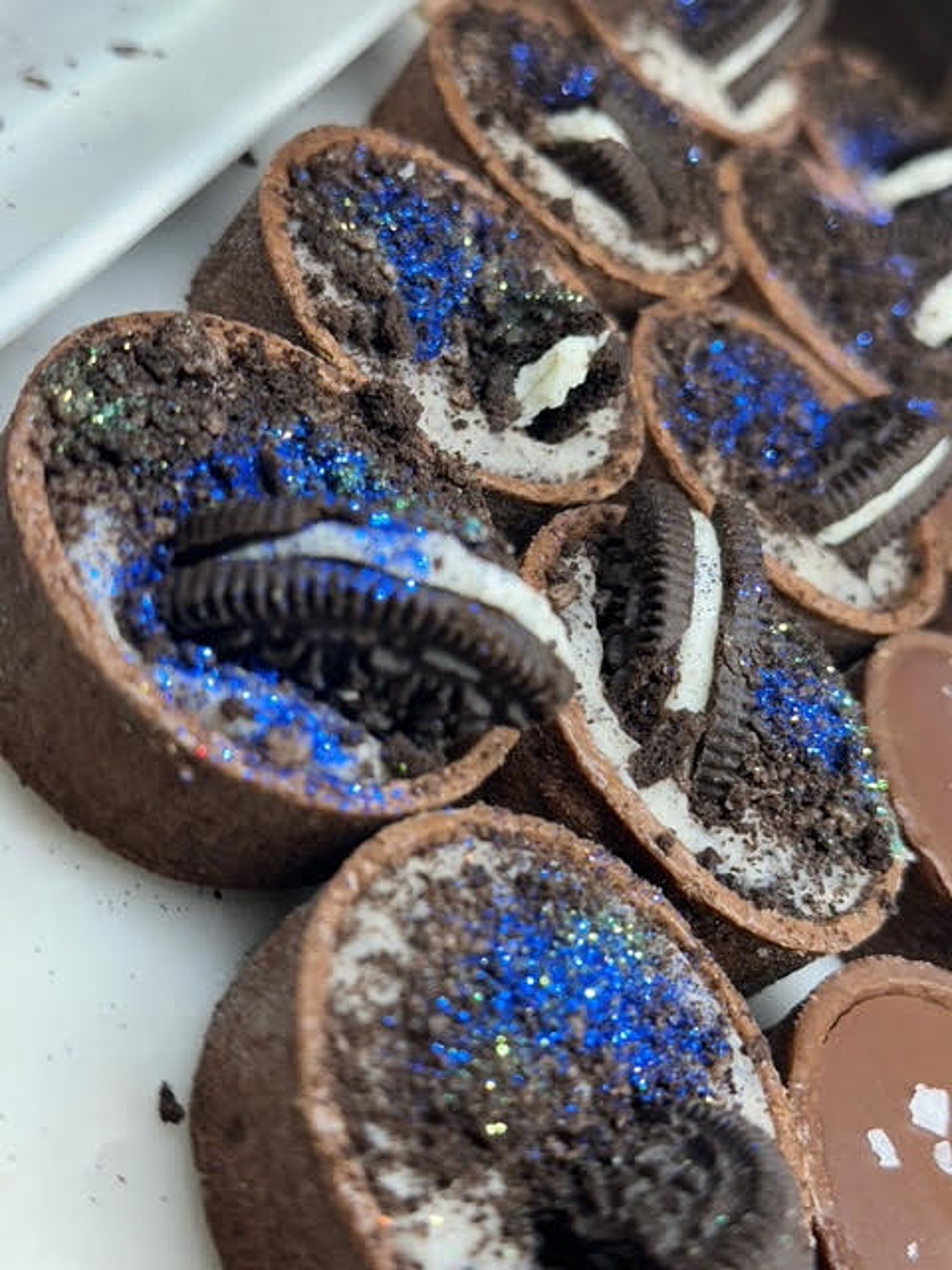 Chocolate shell filled with Cookies and cream ganache, topped with Oreo crumbs.
