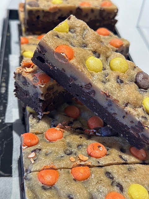 Brownie topped with peanut butter swirled, cookie dough topped with Reeces pieces.