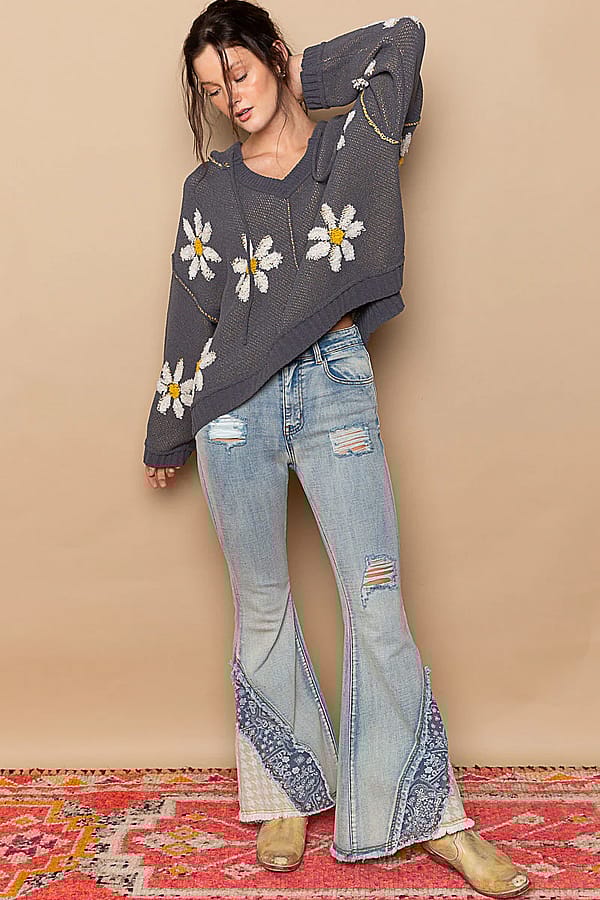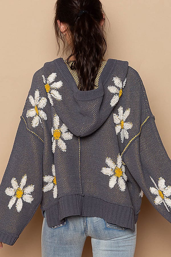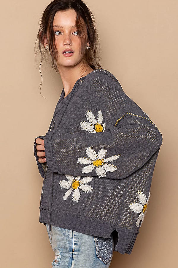 Discover the cozy and stylish Flower Power Hoodie Sweater featuring a V-neck, long sleeves, and a relaxed fit, this chenille sweater is designed with out seam detailing and a berber flower print. The rib band point adds a touch of texture while the side open slit adds a unique detail. Available in solid charcoal color, it's the perfect addition to your winter wardrobe.