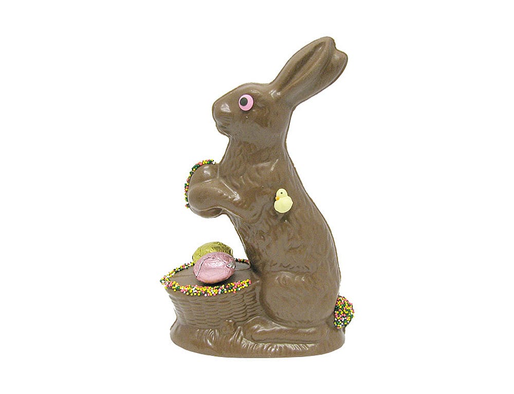 Hollow premium chocolate Easter bunny, available in milk or dark chocolate. Decoration may vary. 9 oz. 7 3/4" x 5".