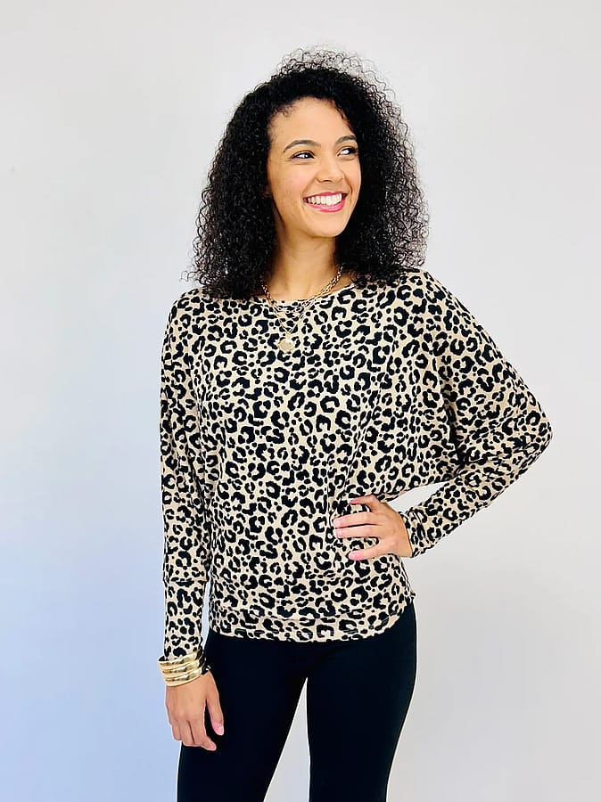 Indulge in luxury with our Cashmere Animal Print Dolman Top. Featuring a boat neck and cuffed dolman sleeves, this top is both stylish and comfortable. The animal print adds a touch of sophistication, while the super soft, luxurious fabrication elevates the overall experience. Treat yourself to this must-have piece! Runs true to size.