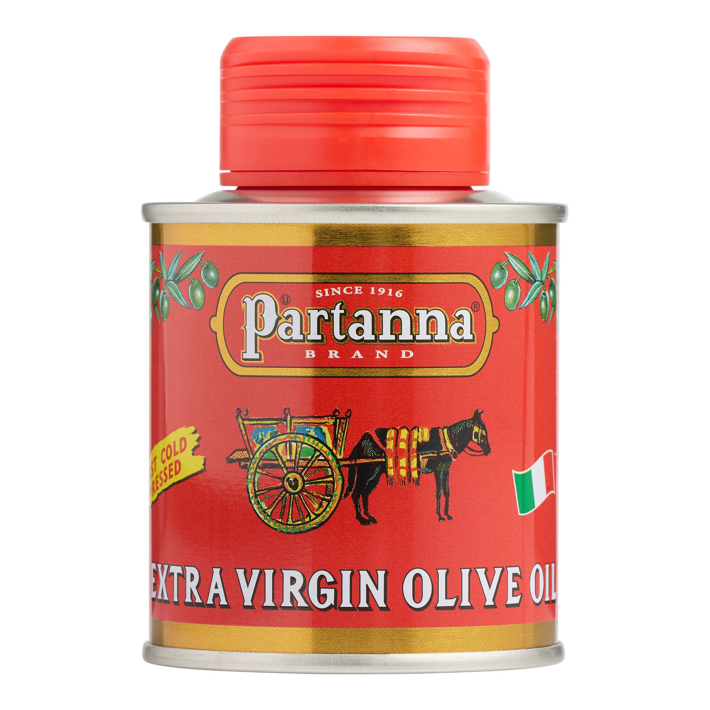 Partanna Extra Virgin Olive Oil in the 100 ML (3.4 fl oz) "Bambino" tin is a premium, cold-pressed Sicilian oil, crafted from 100% Nocellara del Belice olives. Known for a rich, buttery flavor with a peppery finish, this compact tin is ideal for travel, gifting, or as a convenient finishing oil for salads and bread.