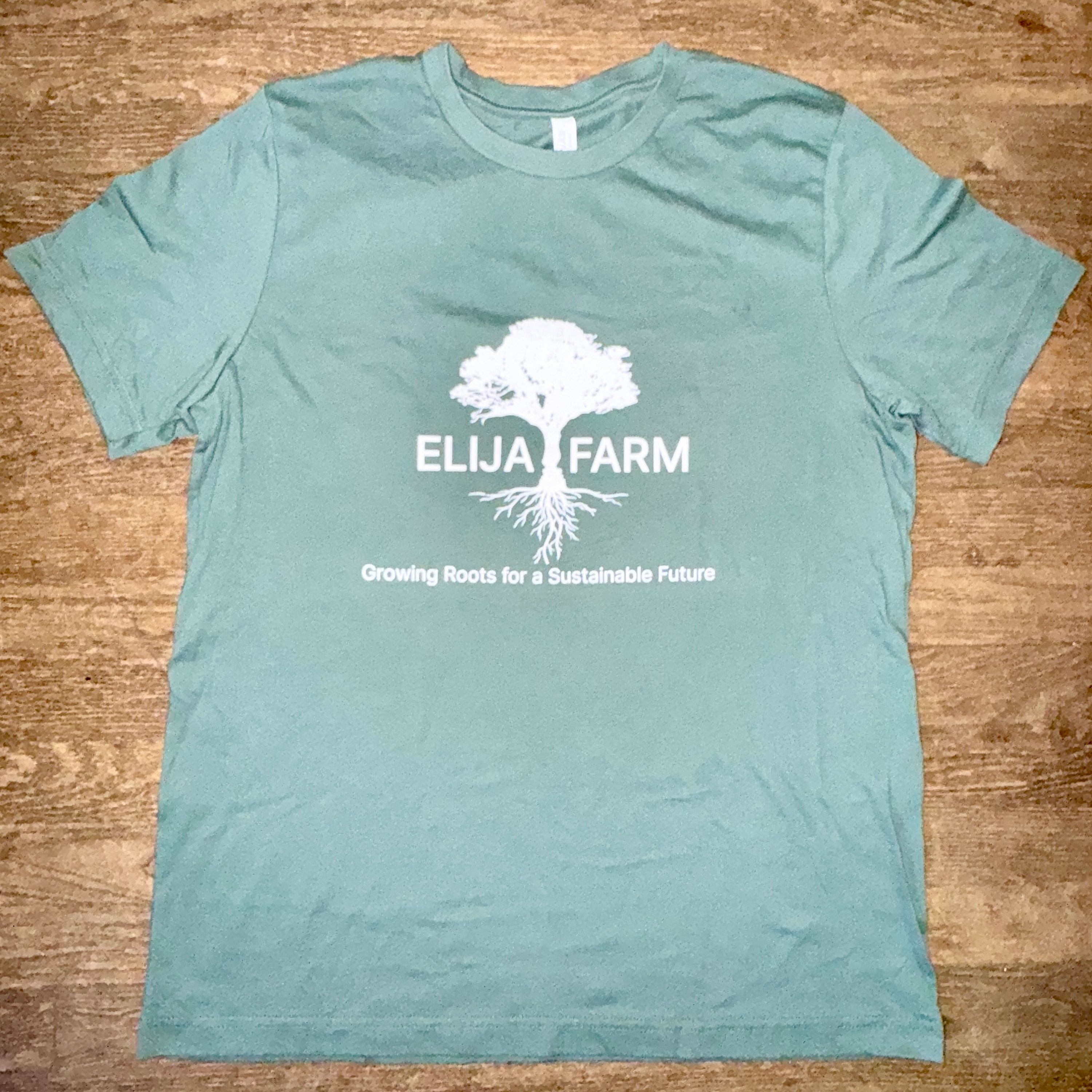 Green cotton t-shirt with white ELIJA Farm logo. #farmfreshfinds