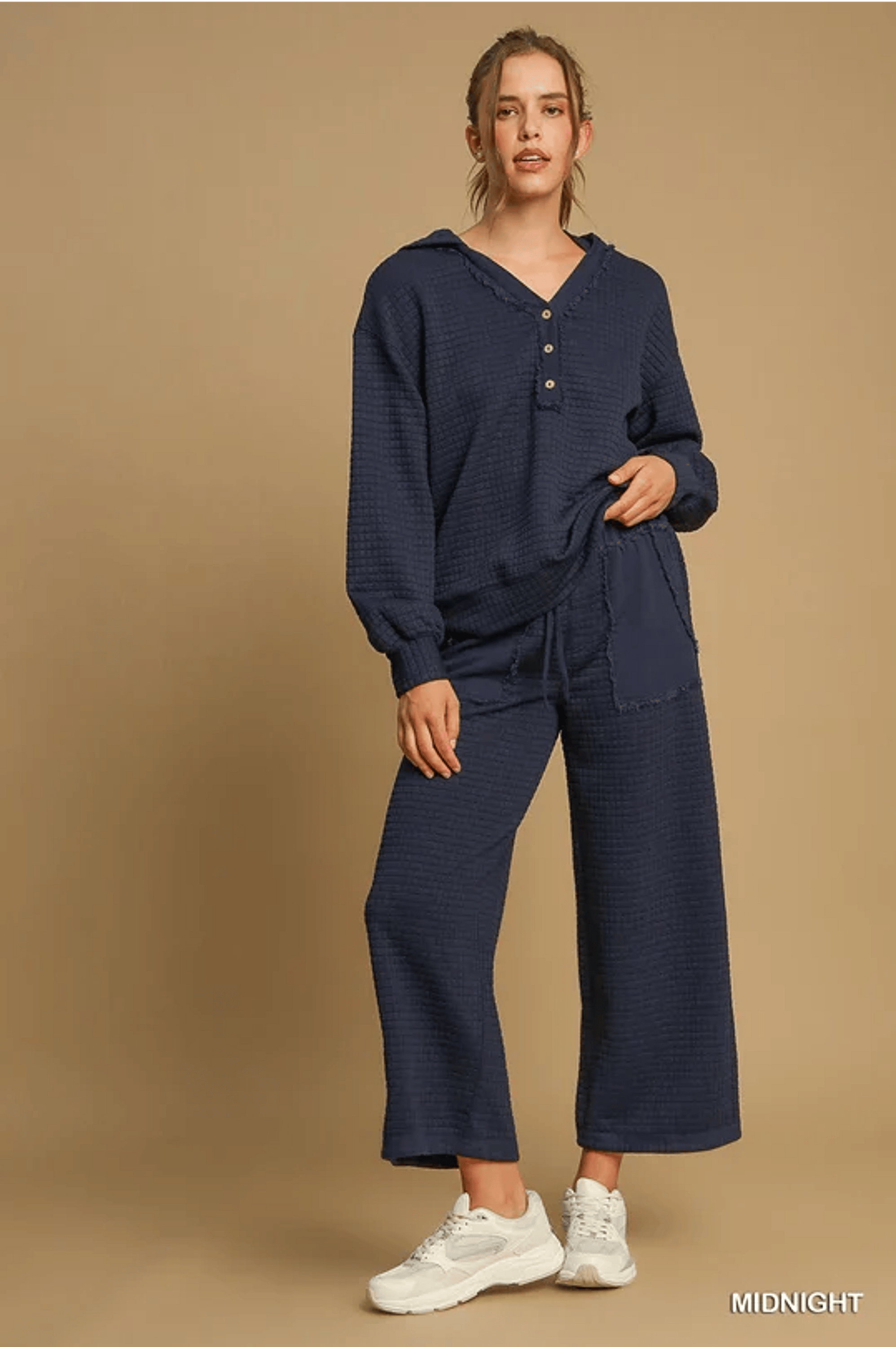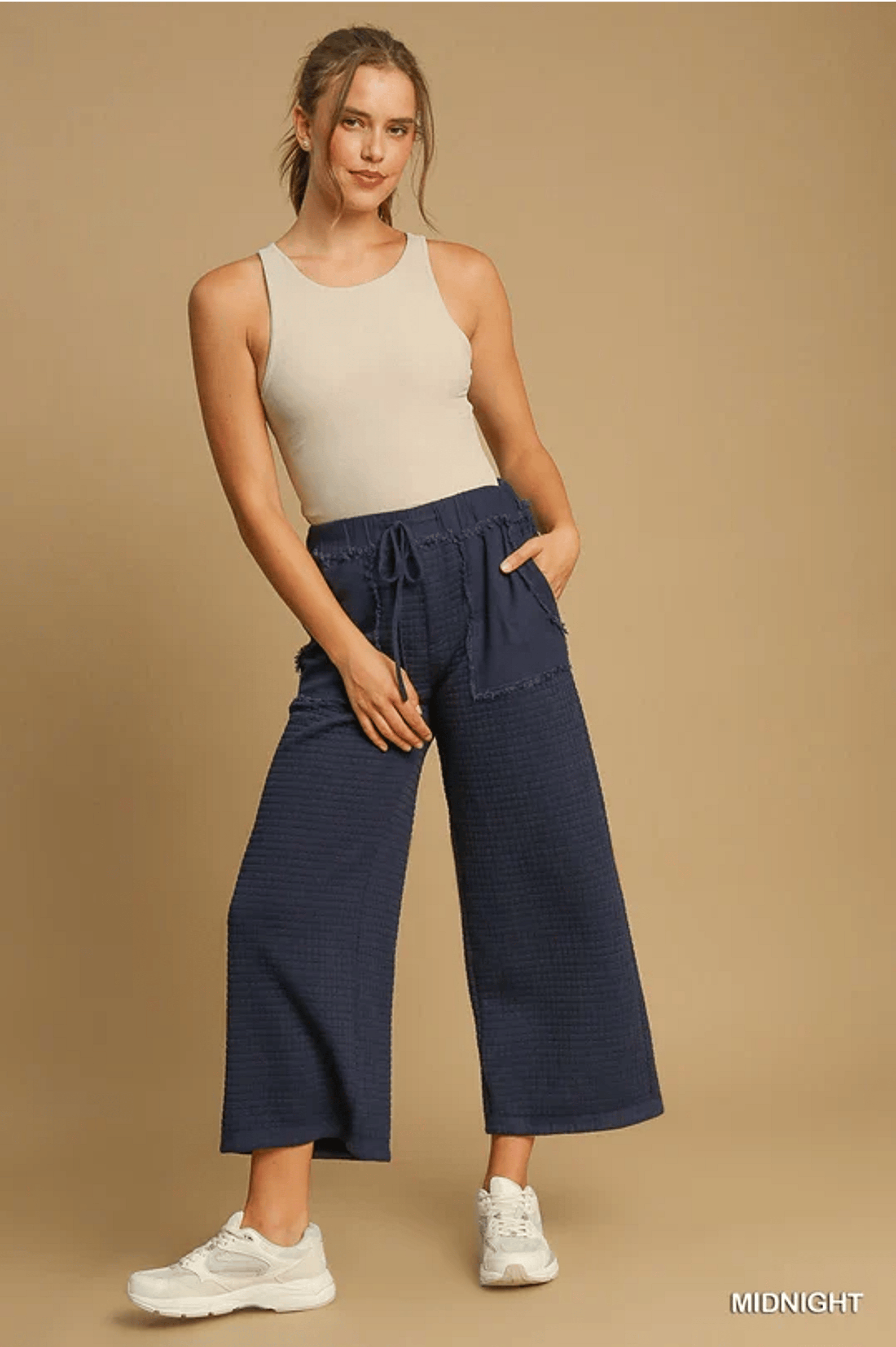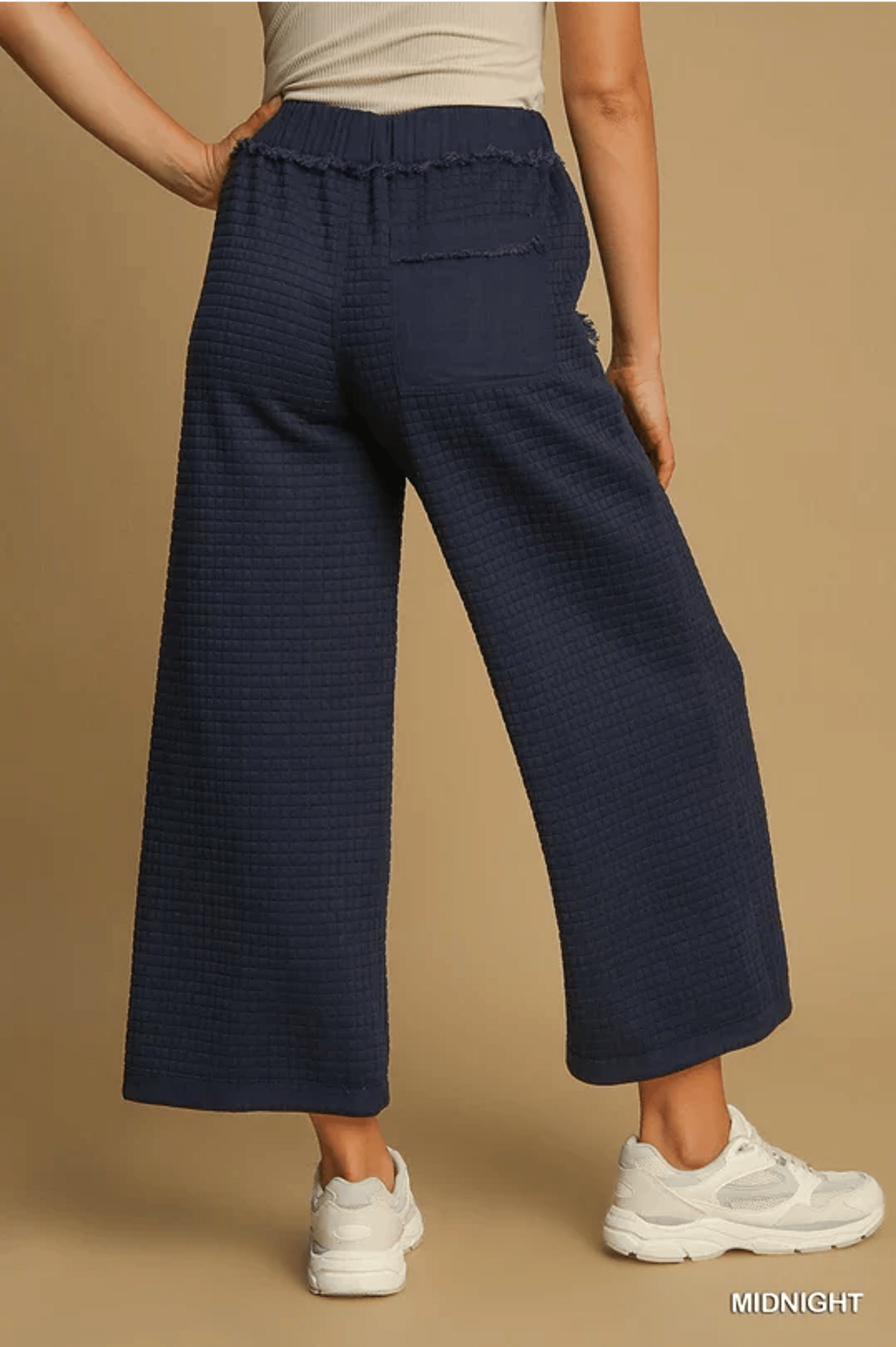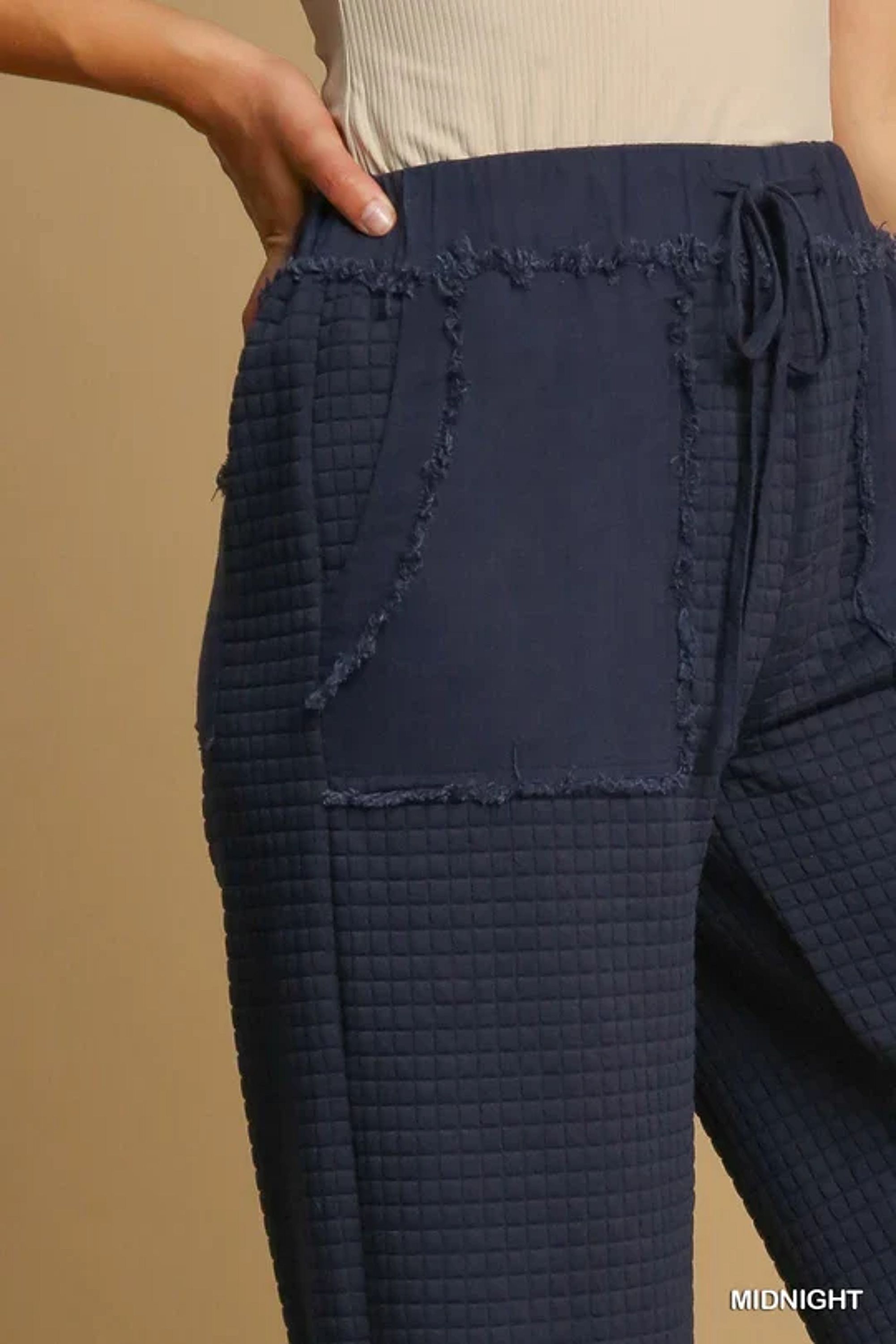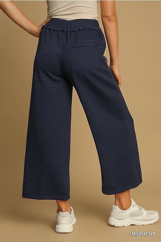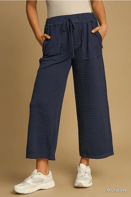 Embrace a stylish and comfortable look with our Quilted Jacquard Pant. Featuring mixed media side pockets and back pocket with frayed trim, this pant also boasts a front tie drawstring elastic waist and a wide leg design for maximum ease of movement. Get ready to make a fashion statement with this must-have piece! Runs true to size.