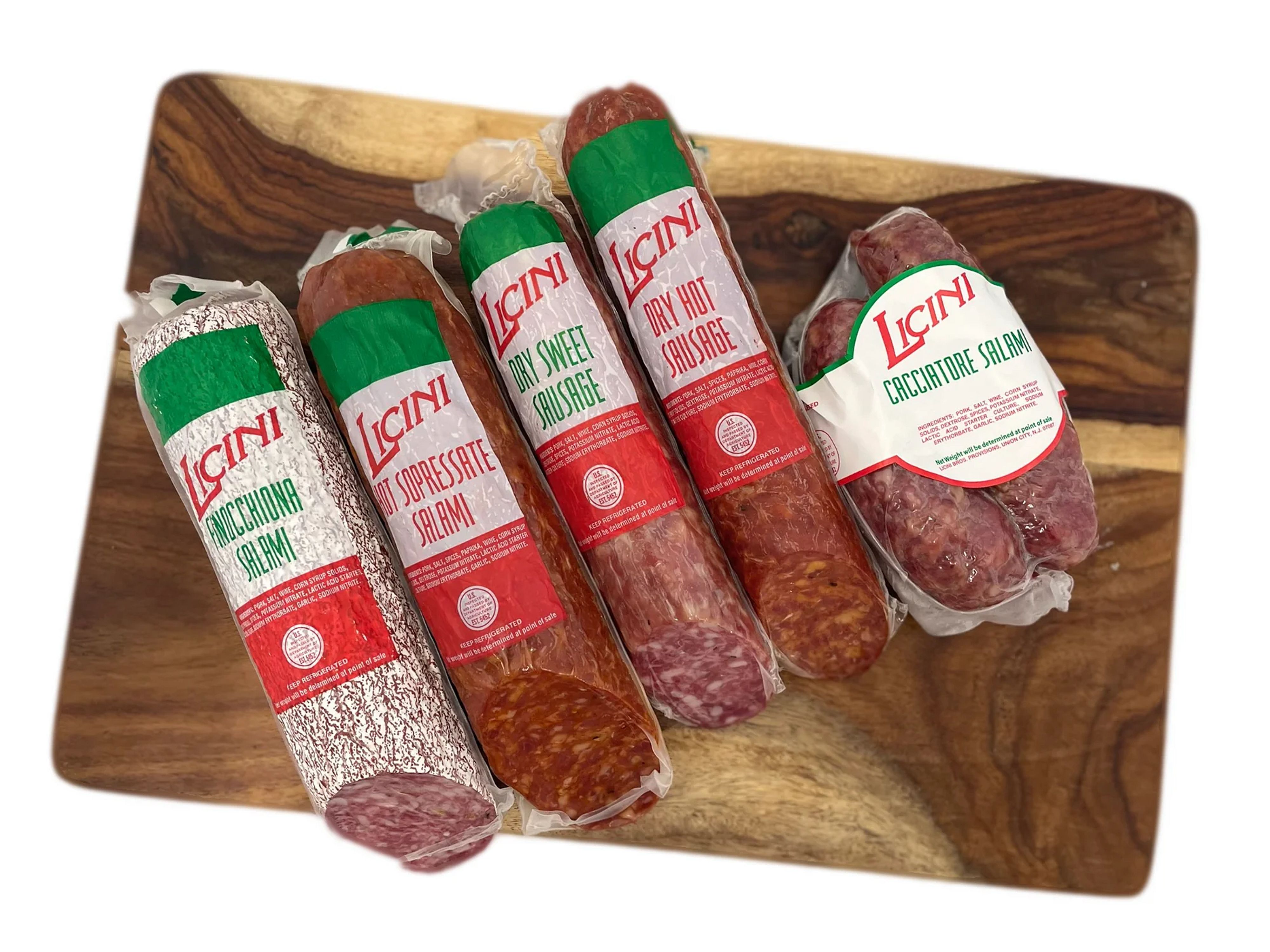 Artisan Salami Sampler - For Meat Lovers & Hosts. A selection of salami for antipasto or charcuterie boards. Contains two Licini sopressata, two Licini dry sausage, and one Licini cacciatore salame.