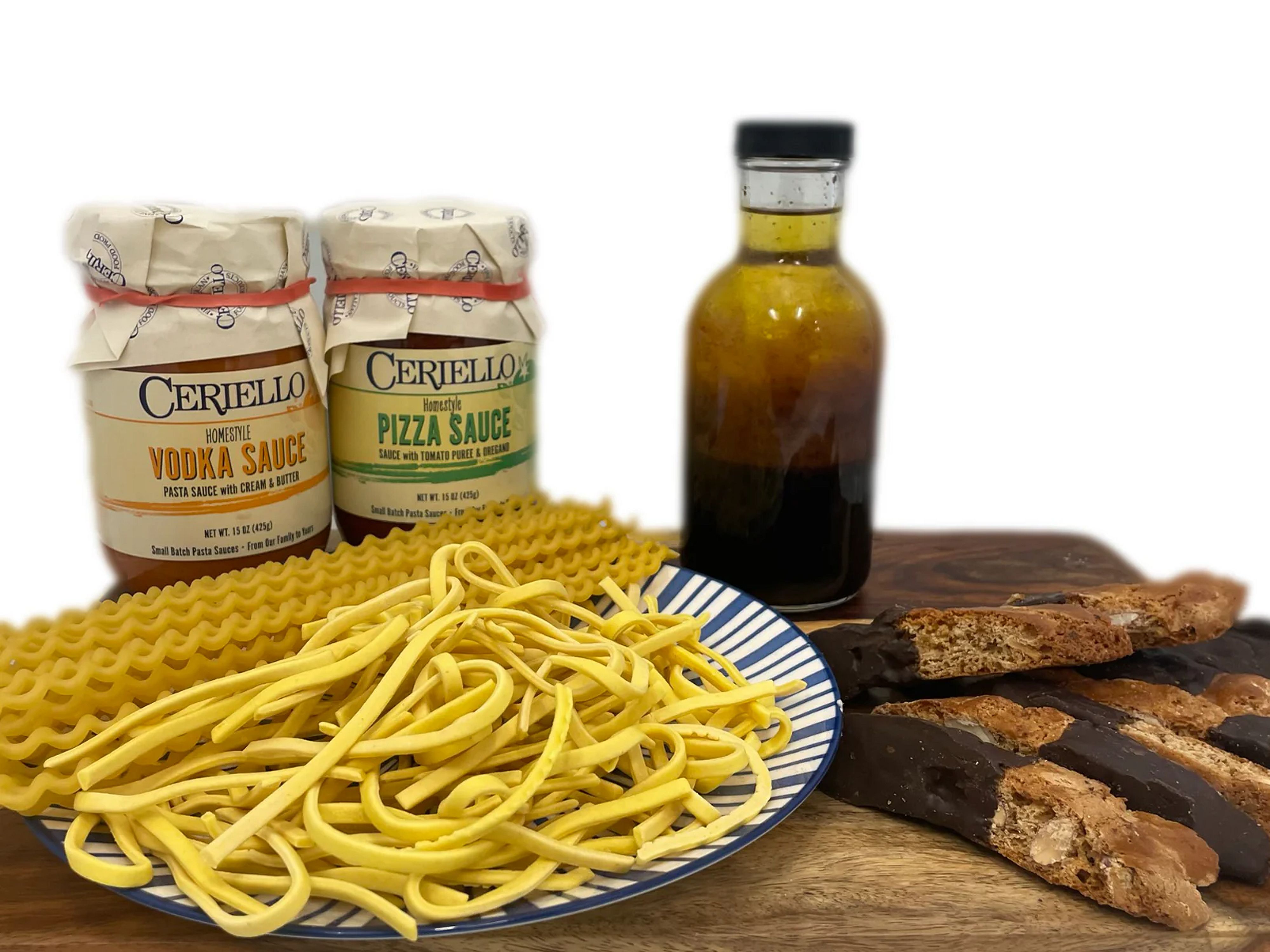 Contains two bottles of Ceriello Pasta Sauces, two packages of Italian Pasta, one Ceriello Homemade Dressing, and one package of sweets (biscotti or chocolate).