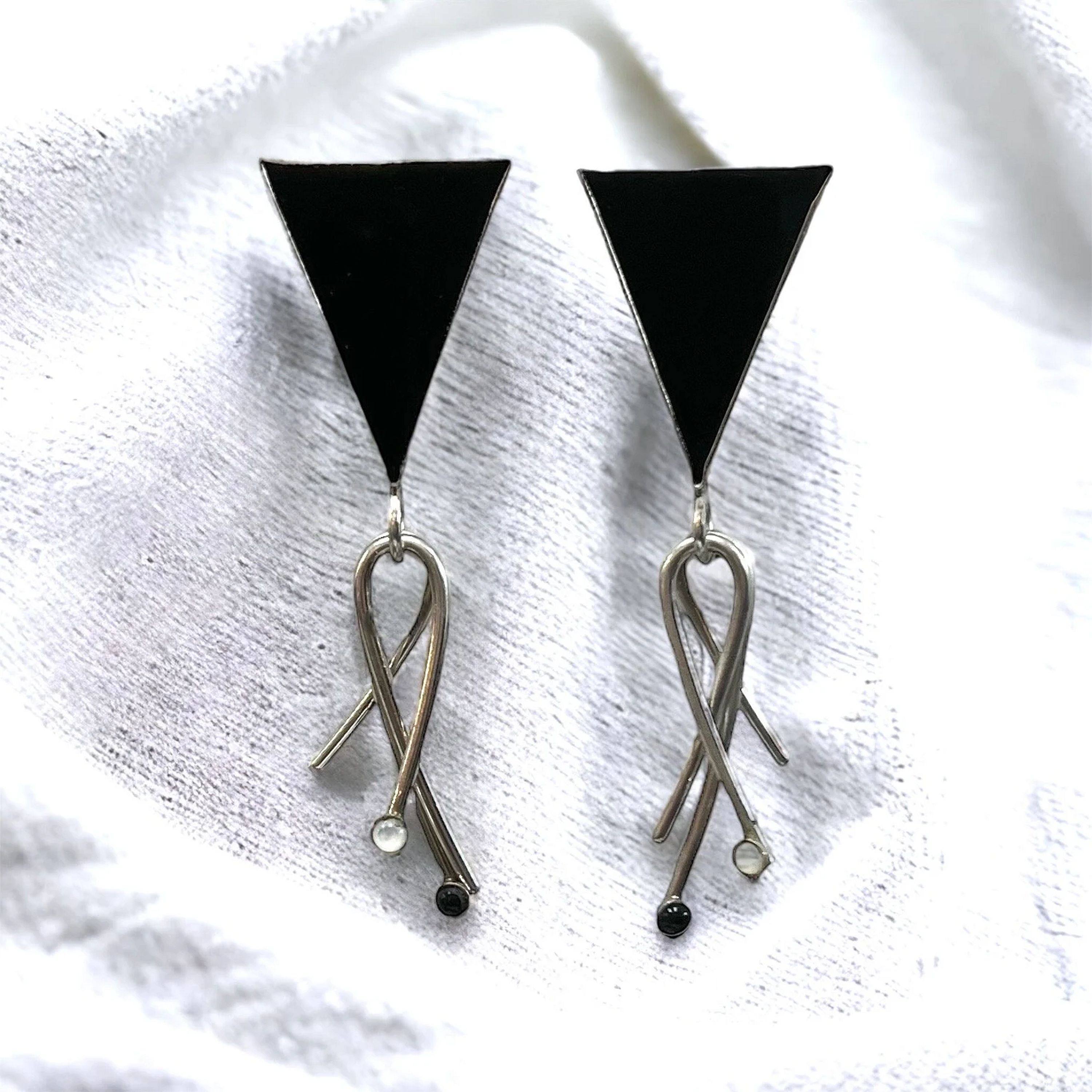 With their sleek design and chic modernist appeal, these earrings are a statement piece from an era where fashion was a daring playground of self-expression. The onyx stones exude an air of mystery and elegance, reflecting the boldness of the '80s fashion scene.