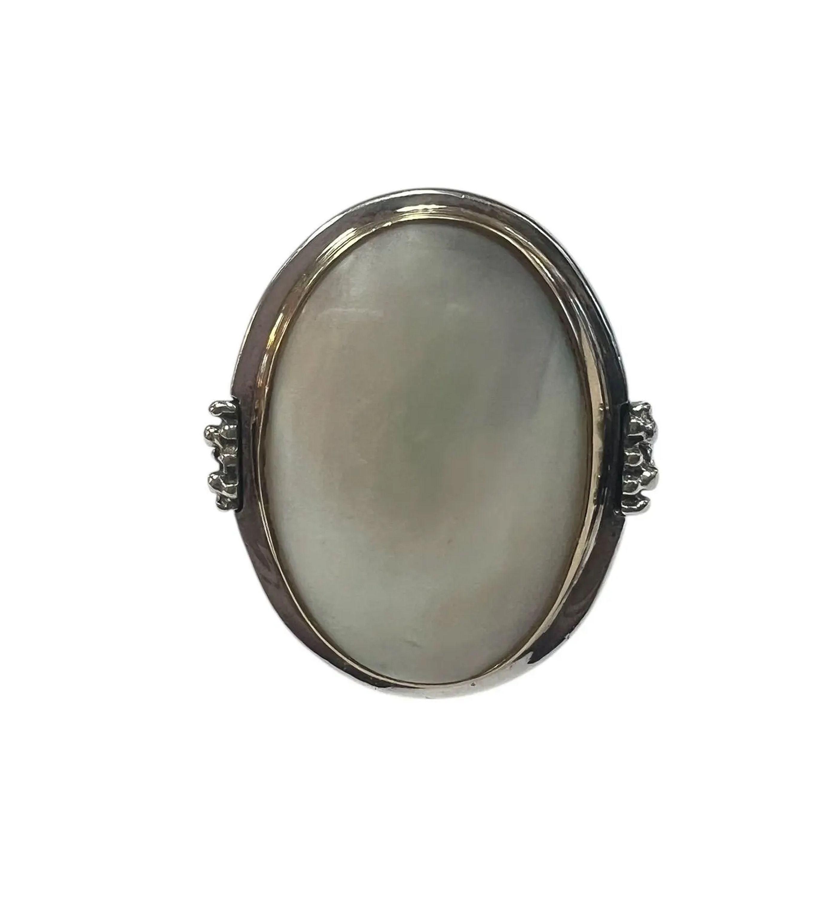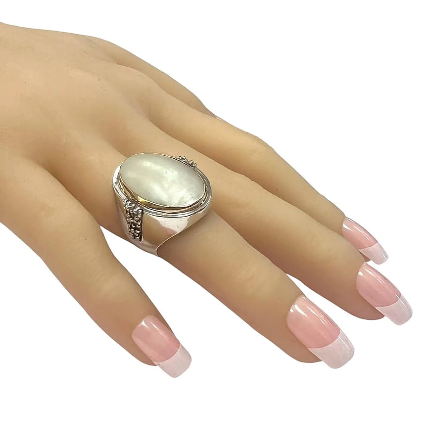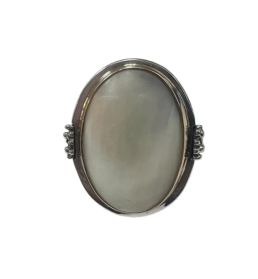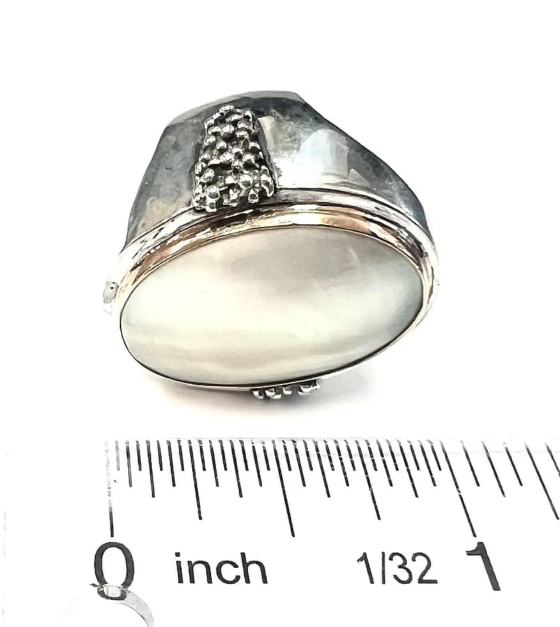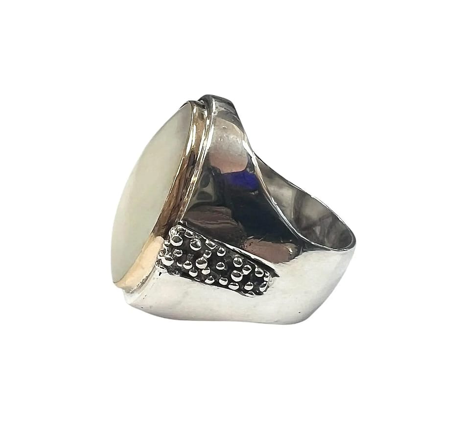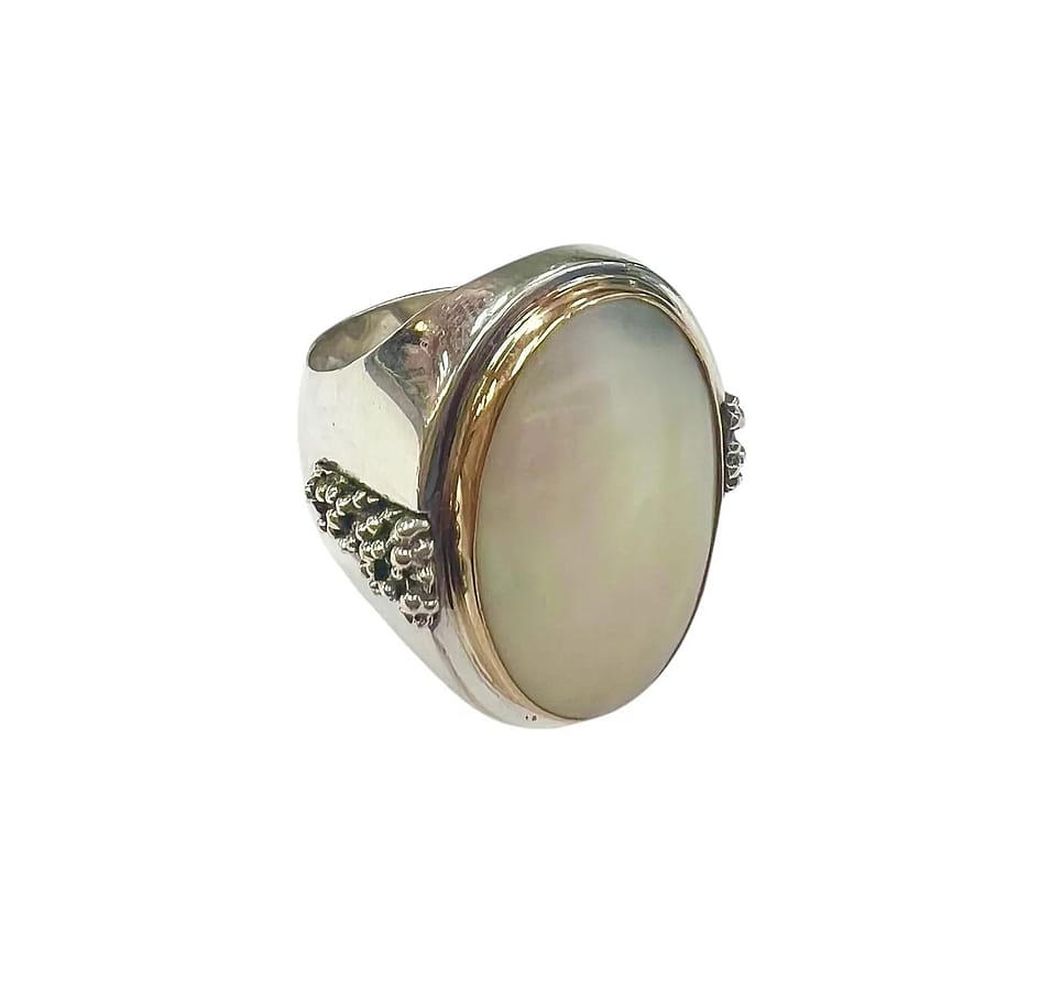 Michael Hawkins created a beautiful ring consisting of a center mother of pearl stone bezel set in gold overlay. The rest of the ring is sterling silver with a textured design stemming from his stary night collection on each side.