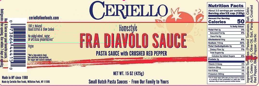 Fra Diavolo (also known as Arrabiata) Sauce has chunks of San Marzano tomatoes simmered with red hot peppers and spices for our own spicy sauce. It’s perfect with fried calamari, shrimp, or vegetables as a dipping sauce. It is easily “toned down” when mixed with our Marinara sauce for a milder, but still spicy sauce.