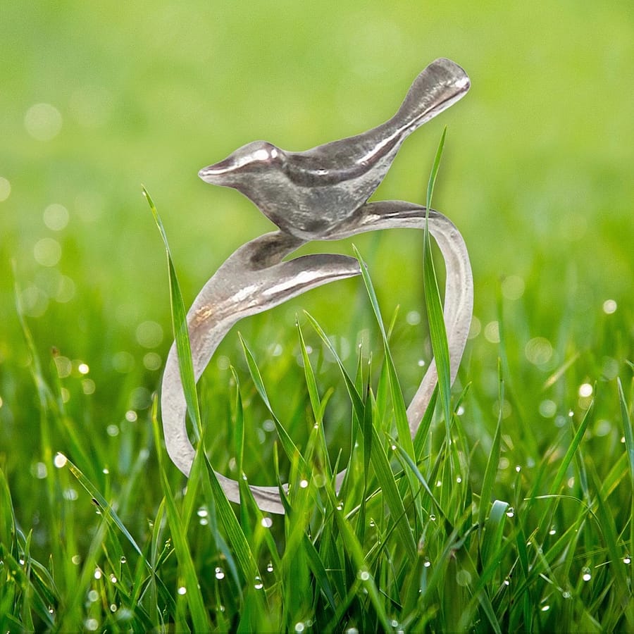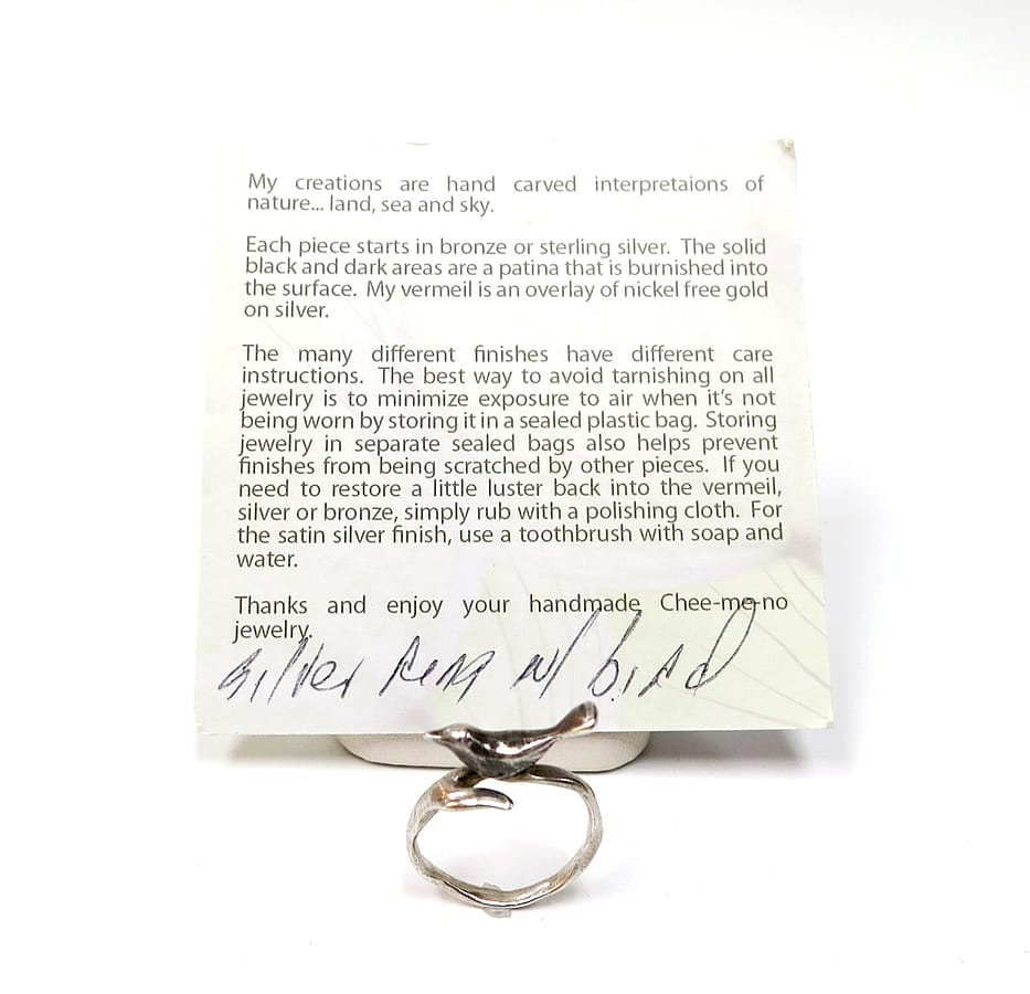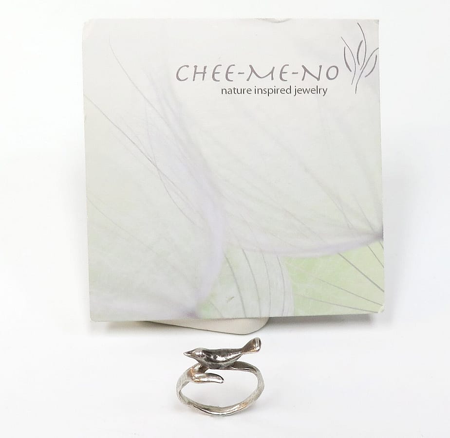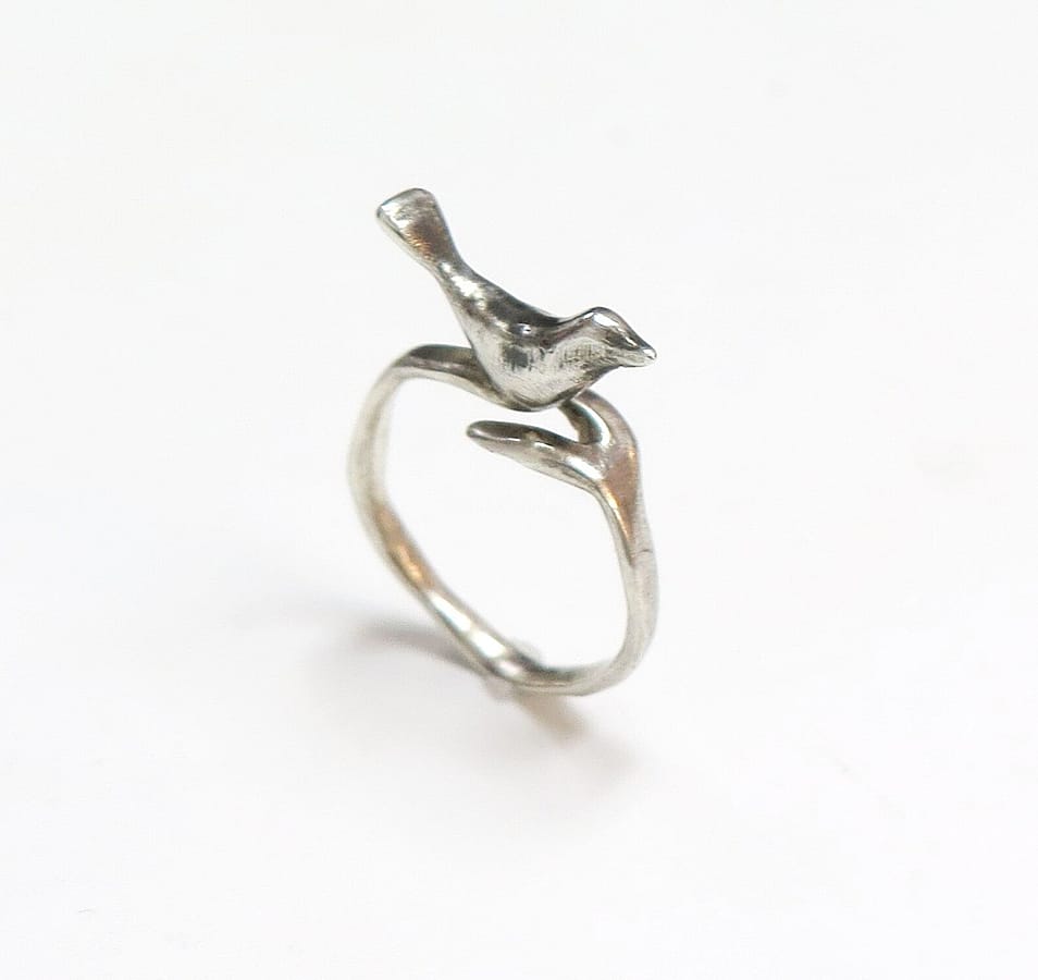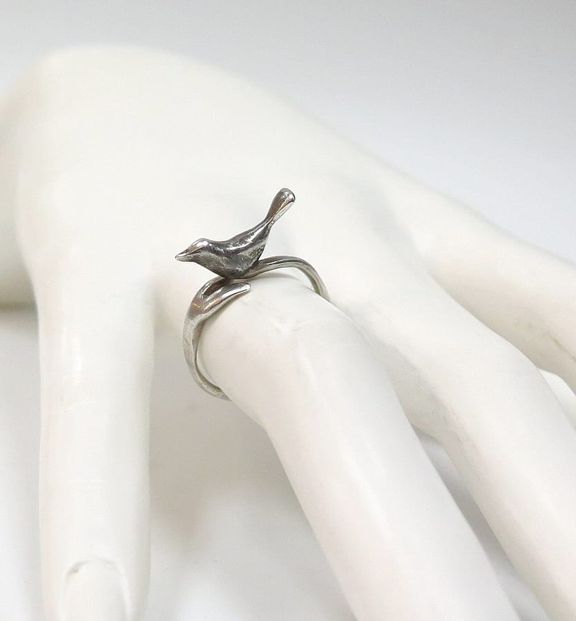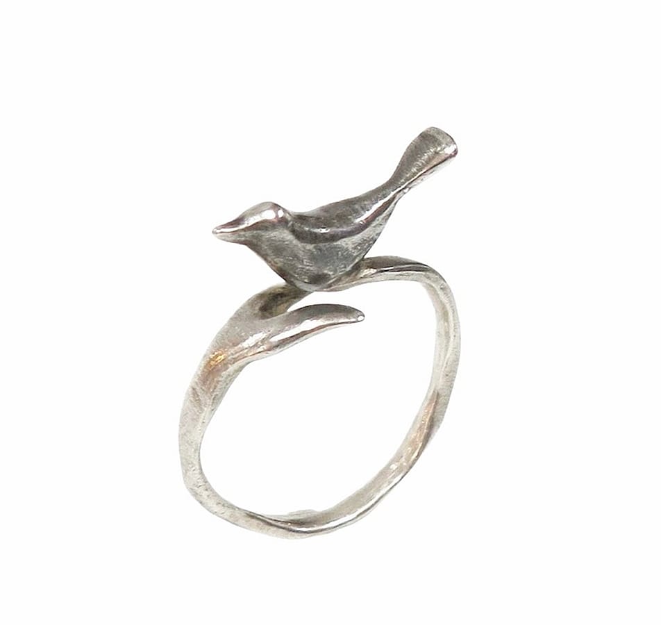This Bird Ring by Lisa Cimino is handcrafted in sterling silver with a bird perched in the center.