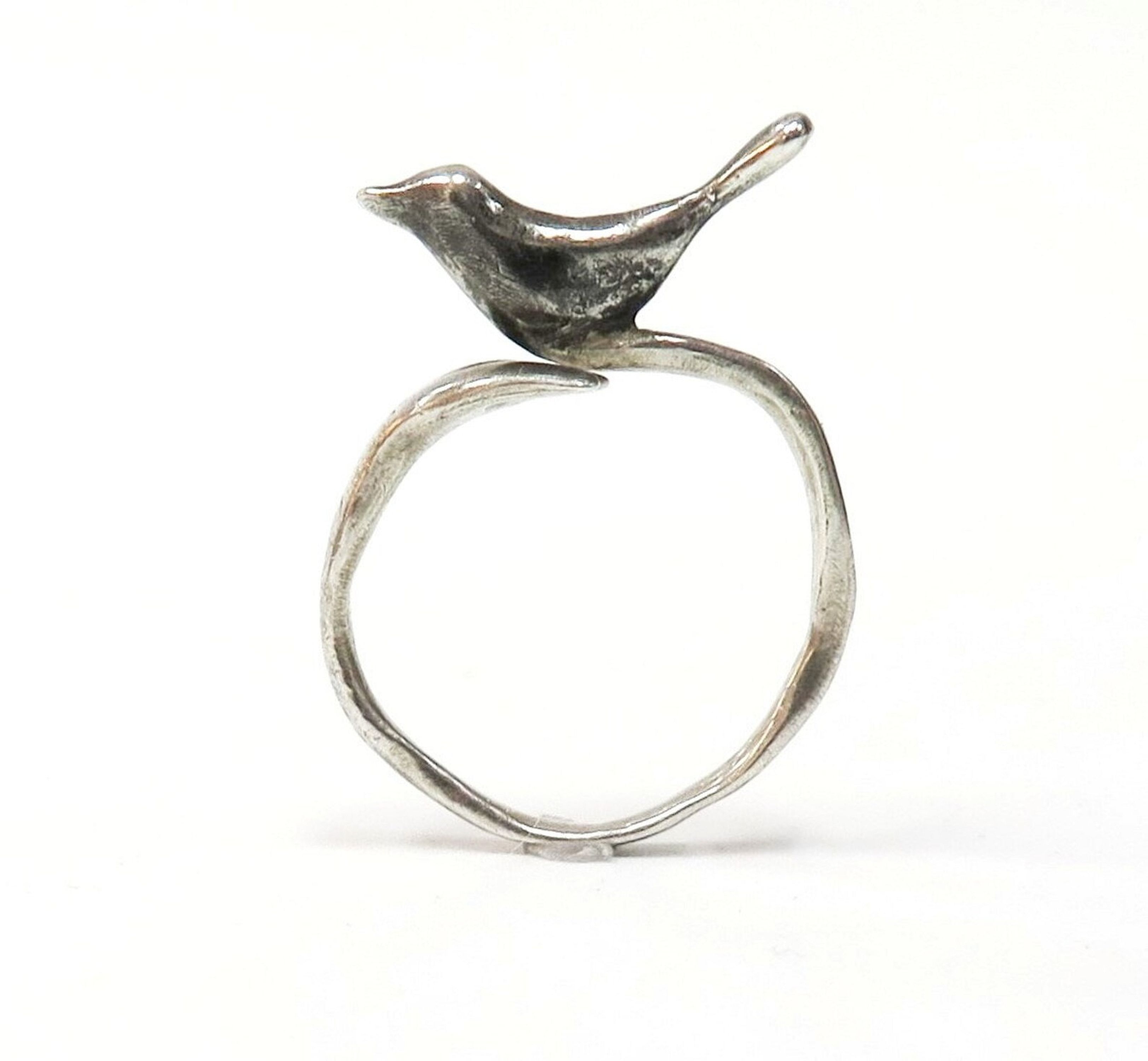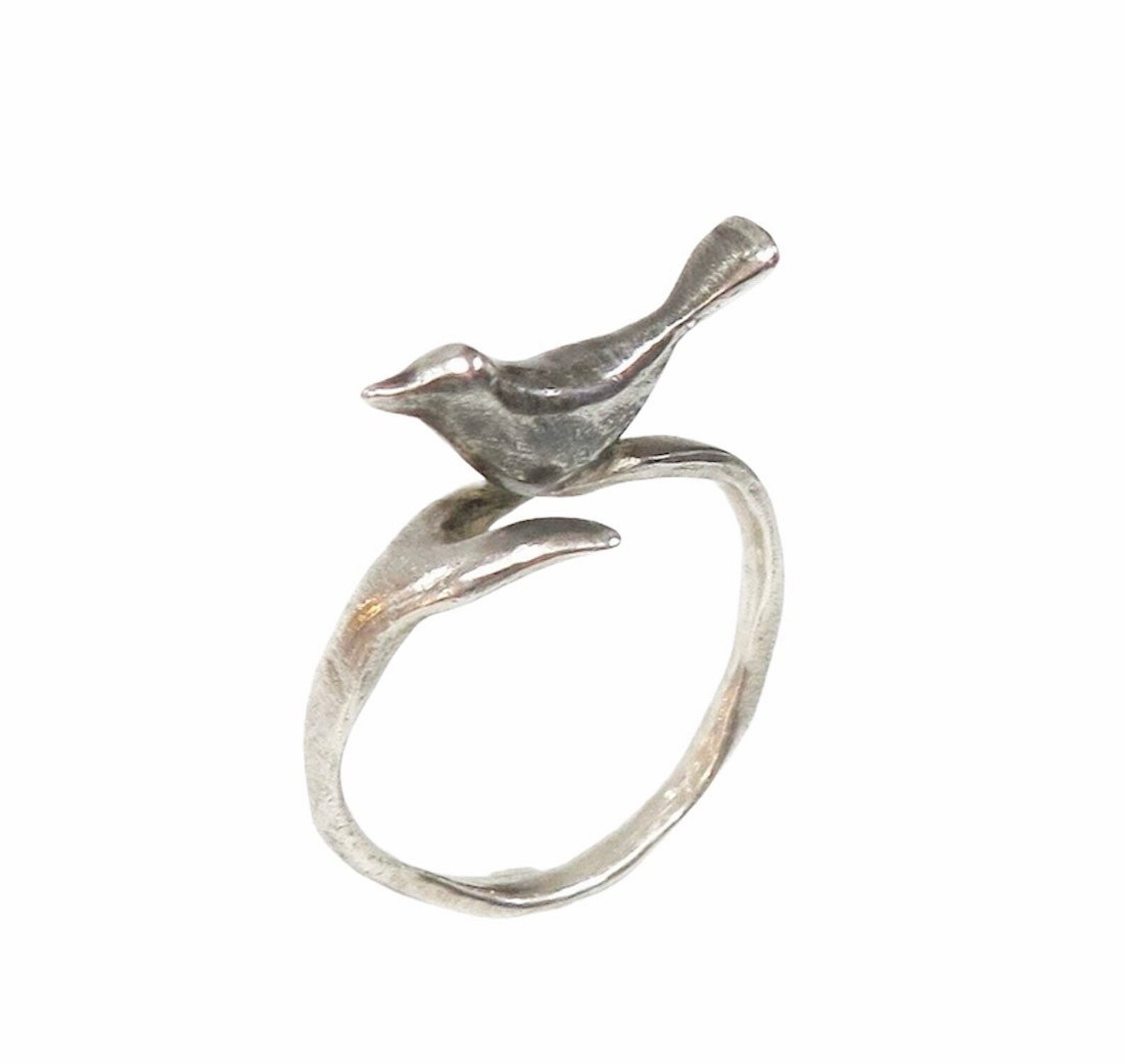 This adorable ring is adjustable, and this cute bird sits about 3/8" above the ring, and his length is about 3/34"