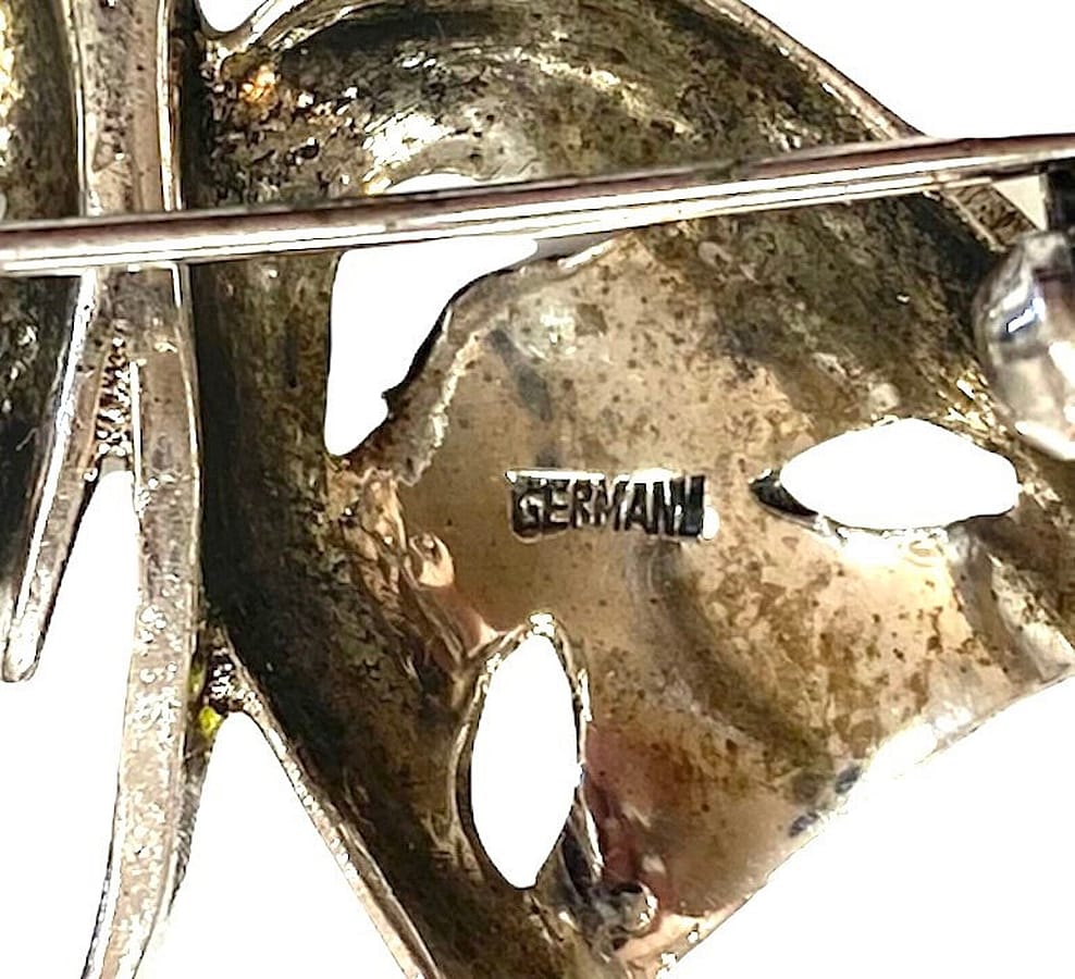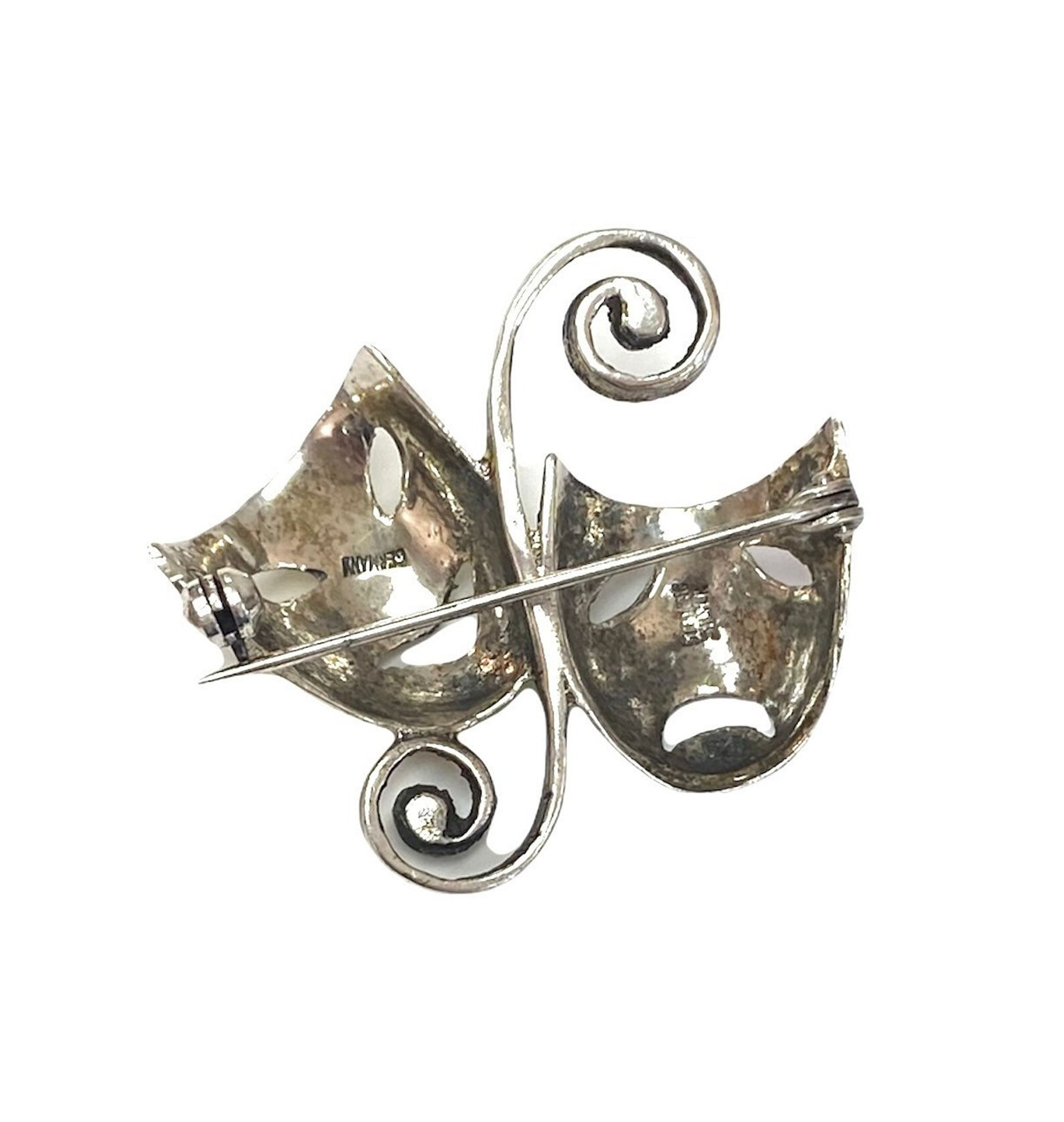 This 1940's comedy and tragedy mask pin is marked GERMANY STERLING SILVER. It has green and purple enamel and the noses are studded with marcasites. Measures approximately 1-5/16" by 1-3/8". Weighs 7.8 grams. Great condition.