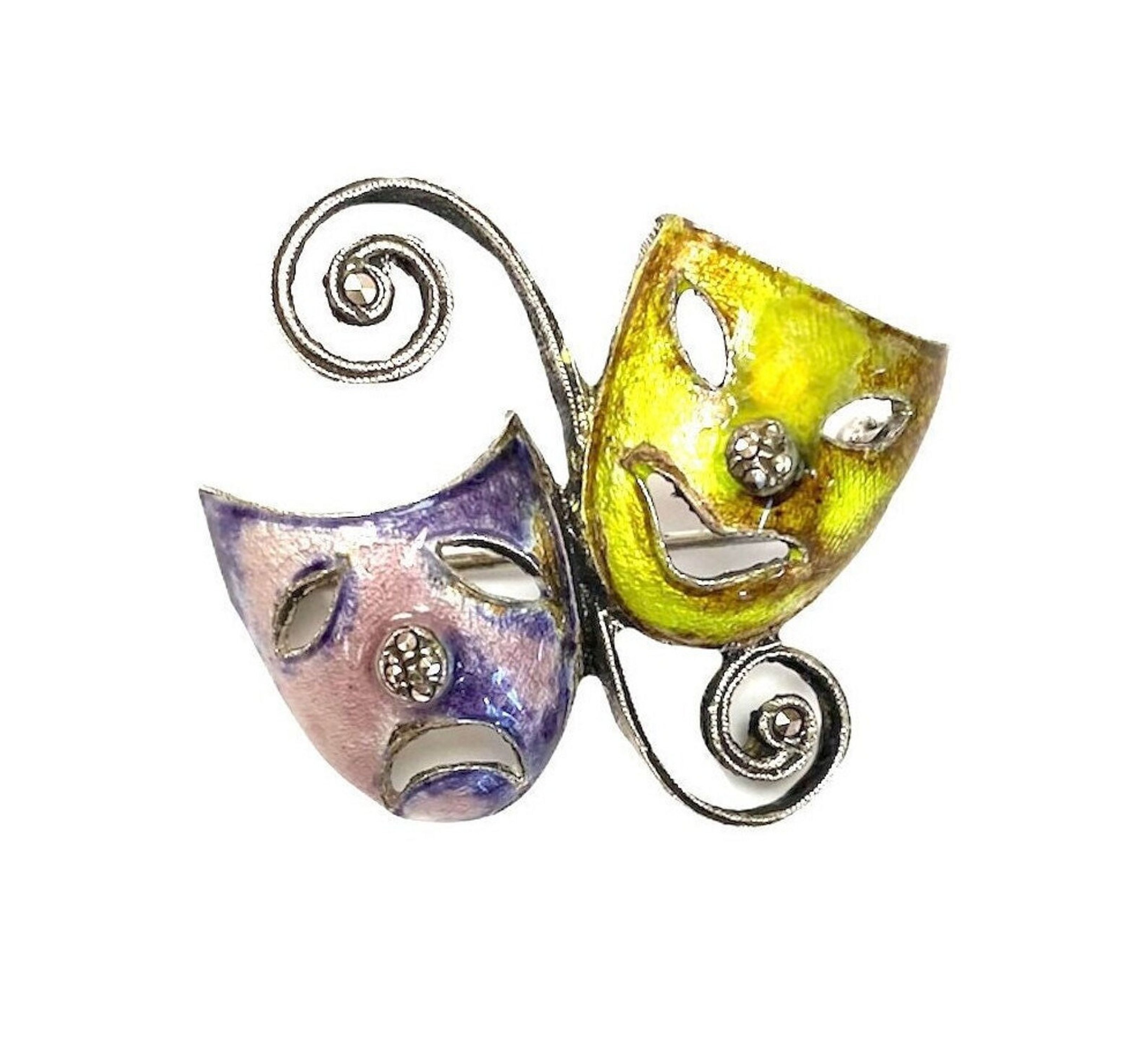 Vintage Comedy Tragedy - 1940's Vintage Comedy Tragedy Sterling Enamel and Marcasite Pin