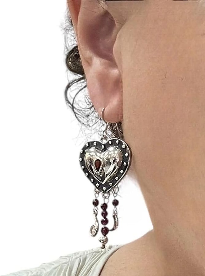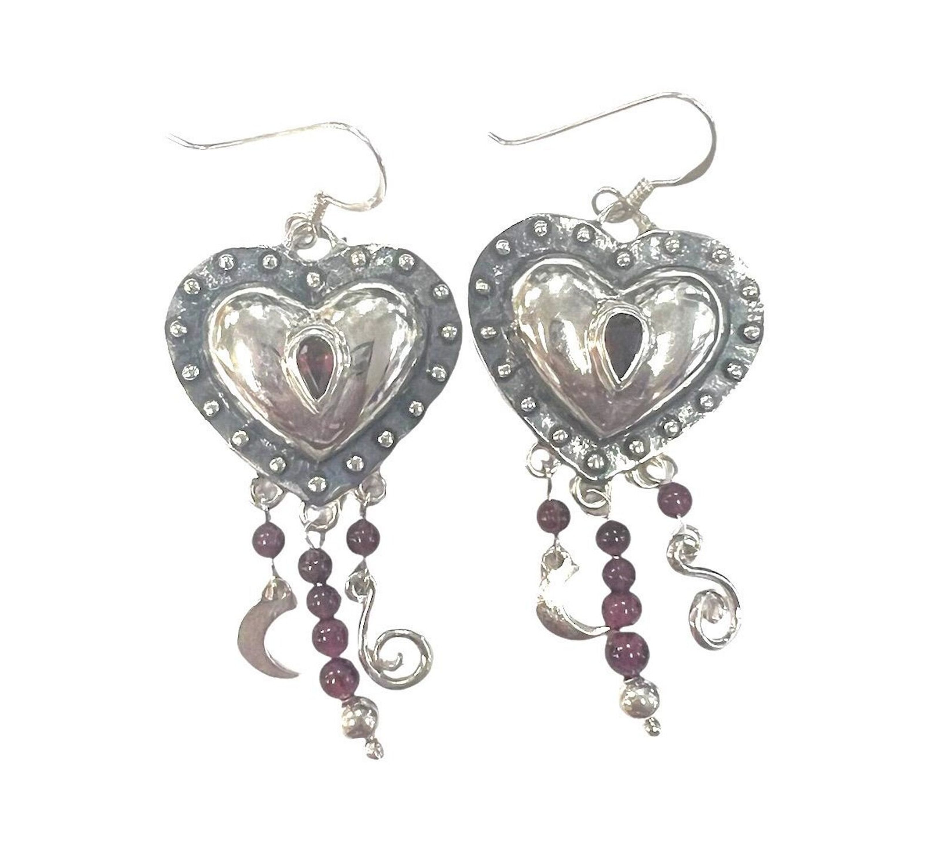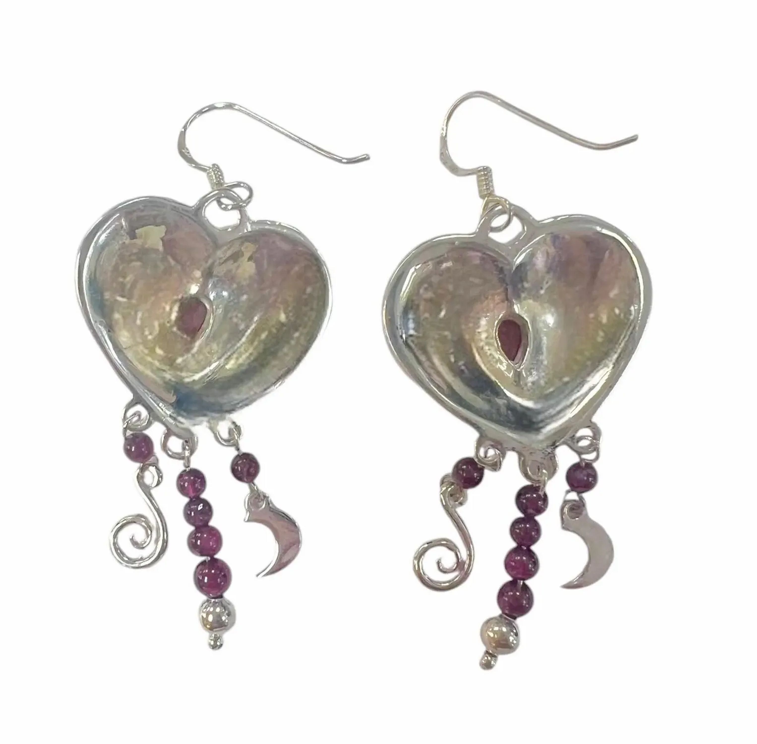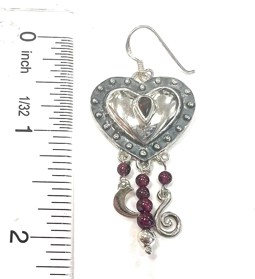 Heart Shaped dangling earrings on wires with Garnets in sterling silver