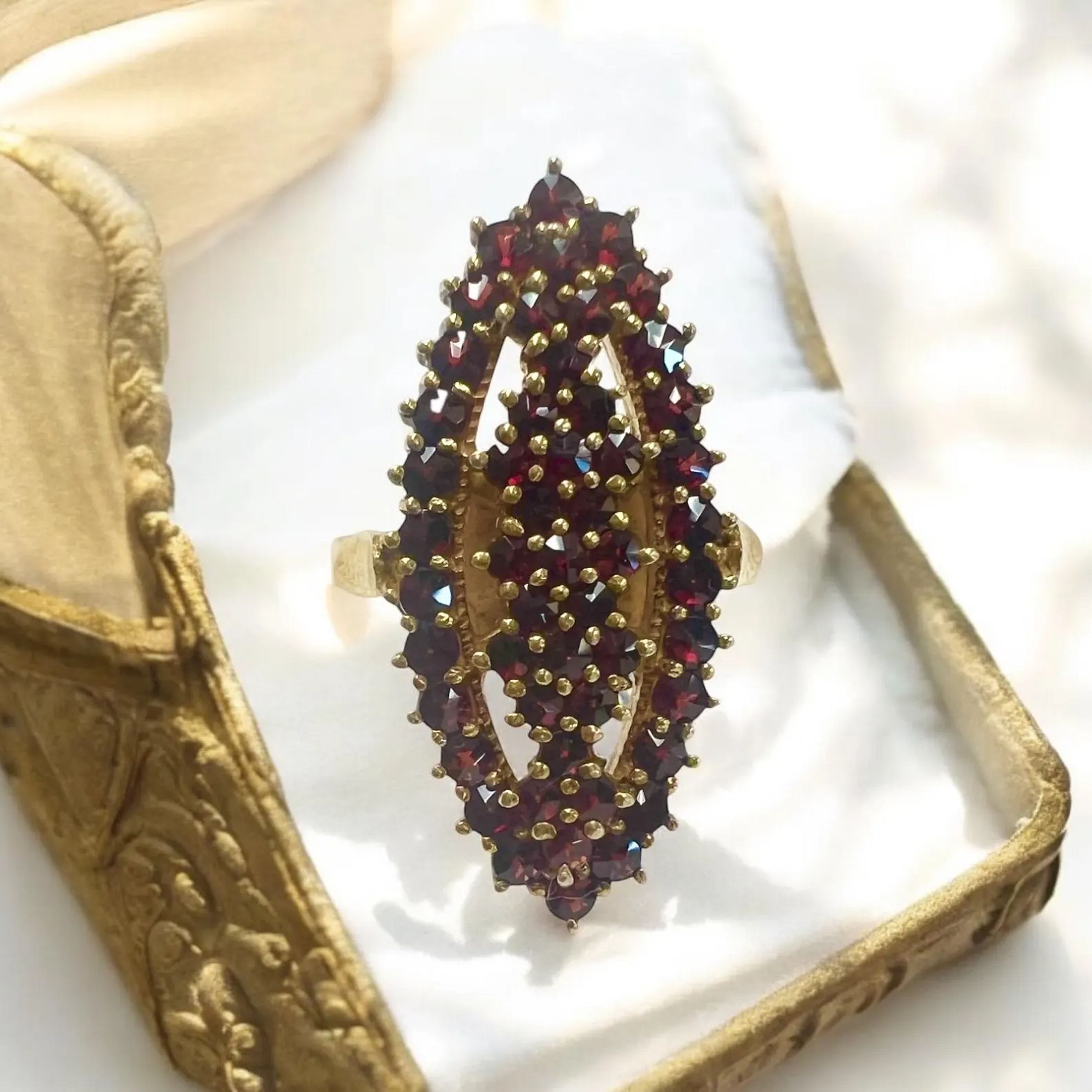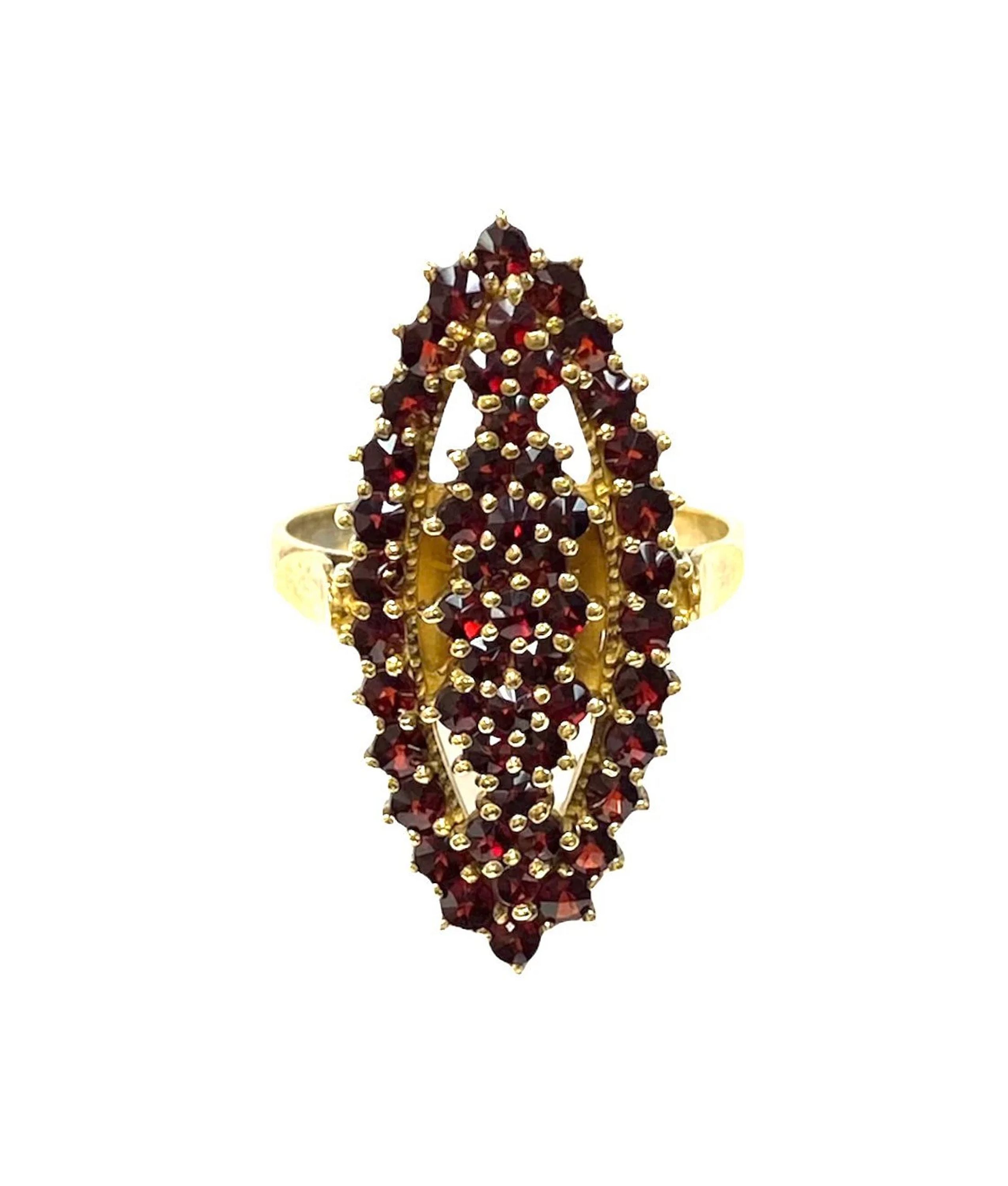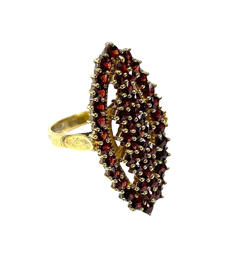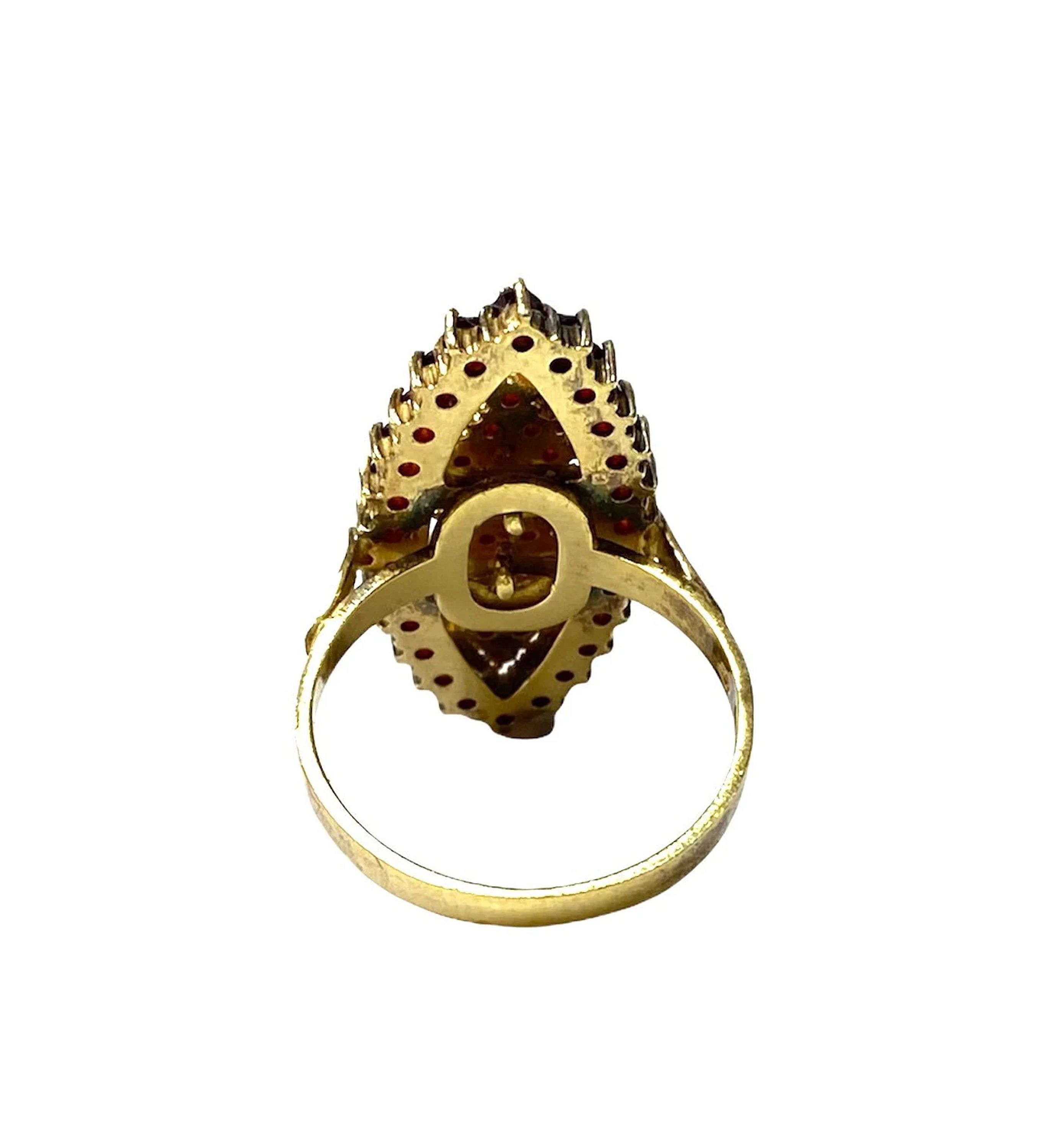 This elongated garnet ring has faceted rose cut garnets called bohemian garnets. The garnets are a rich red wine color and encased in a marked 900 silver setting with gold gilt over the silver.