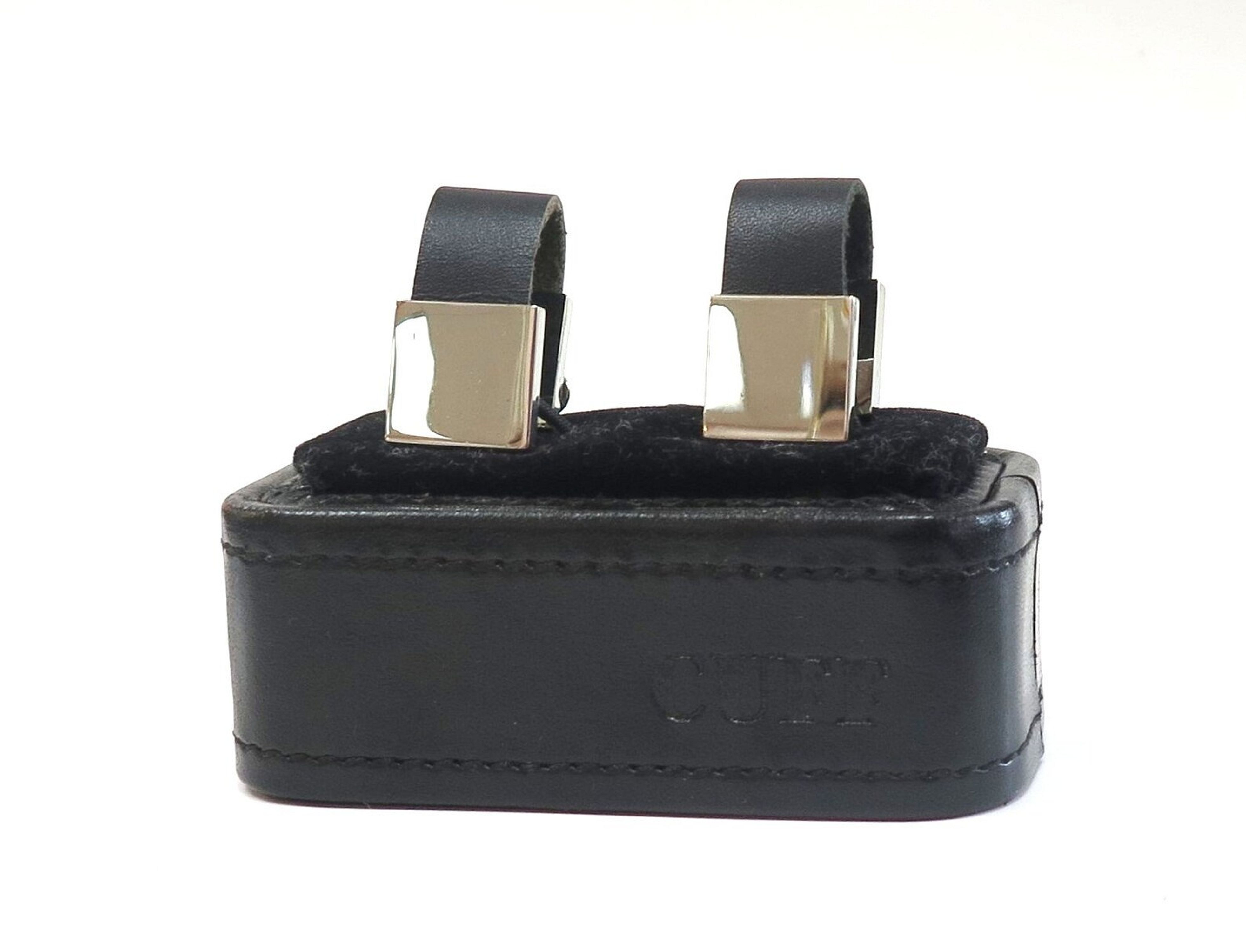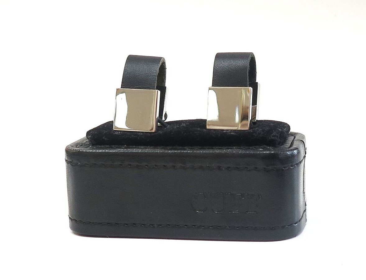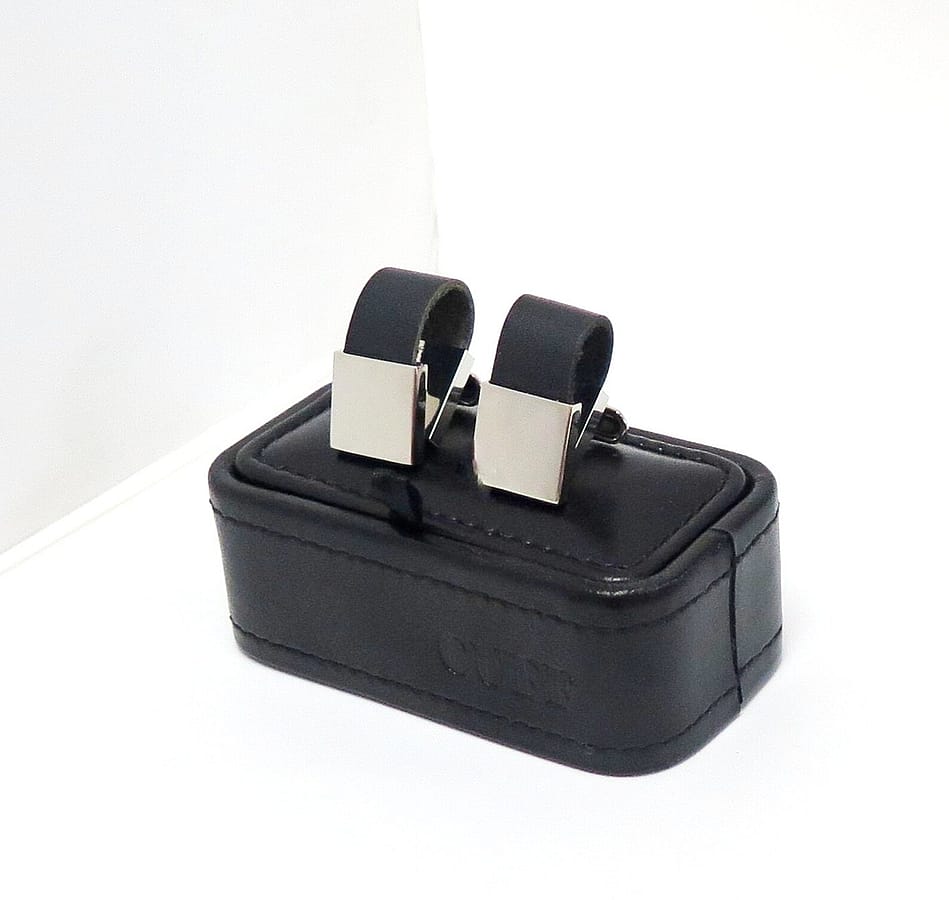 These attractive looking cuff links are black leather with stainless steel. The come in a black leather box by the company CUFF. The measurements for the front part of the square are 1/2" x 1/2". They can be engraved by our jeweler.