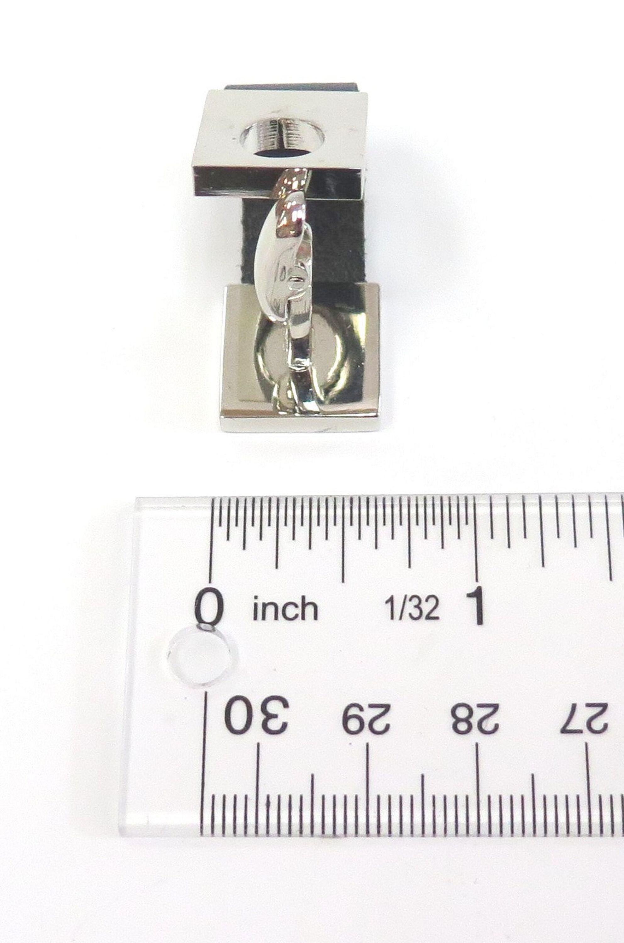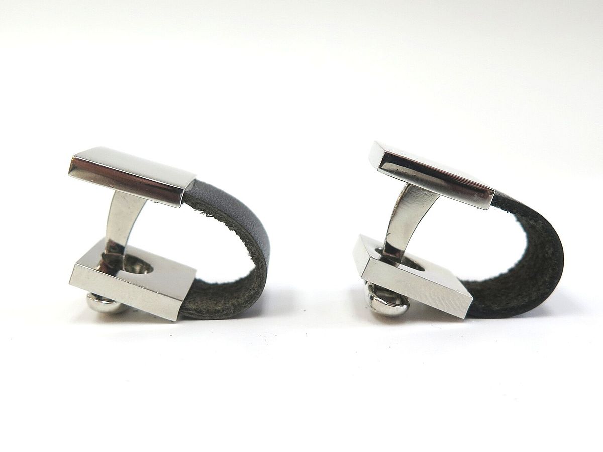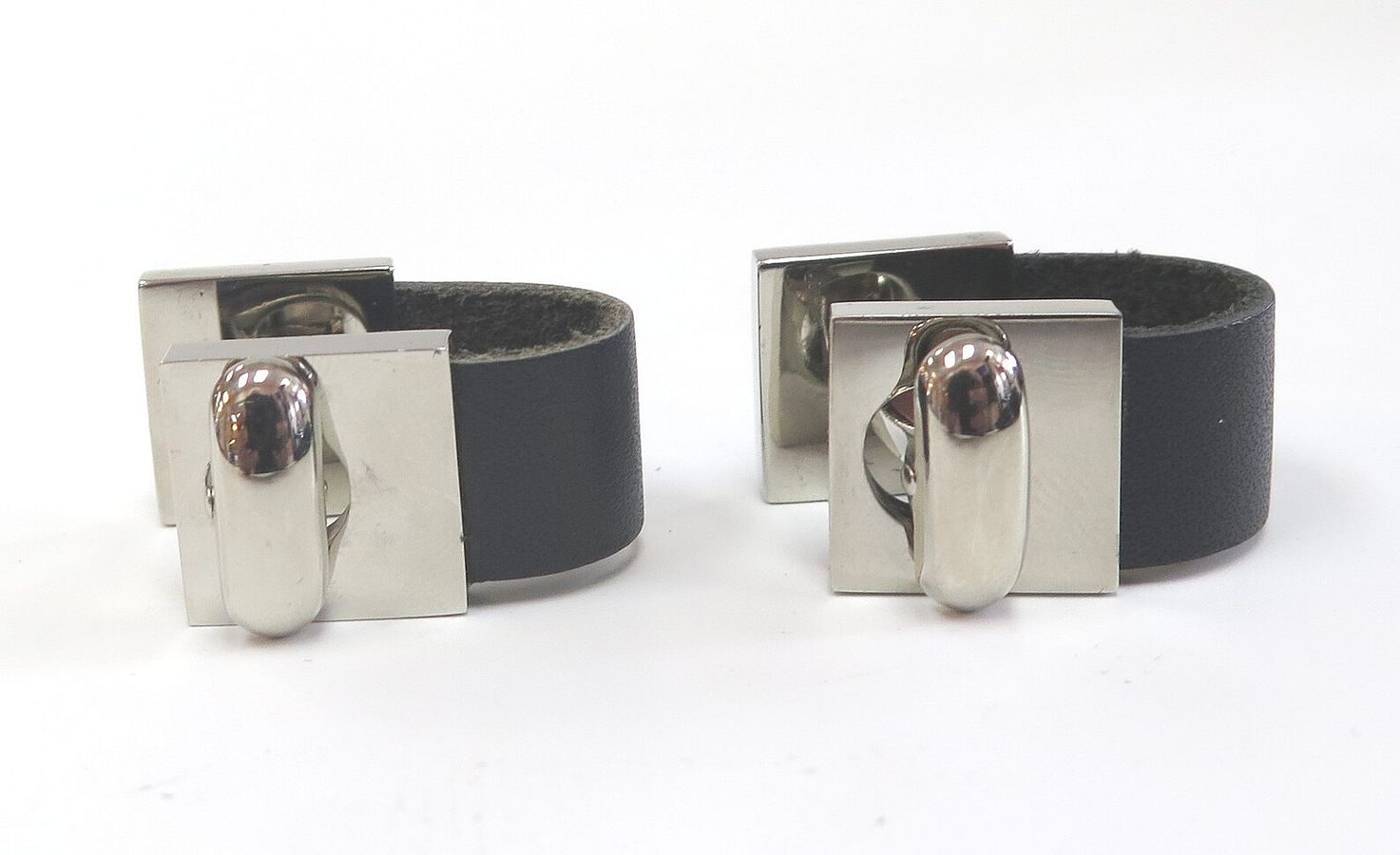 These attractive looking cuff links are black leather with stainless steel. The come in a black leather box by the company CUFF. The measurements for the front part of the square are 1/2" x 1/2". They can be engraved by our jeweler.