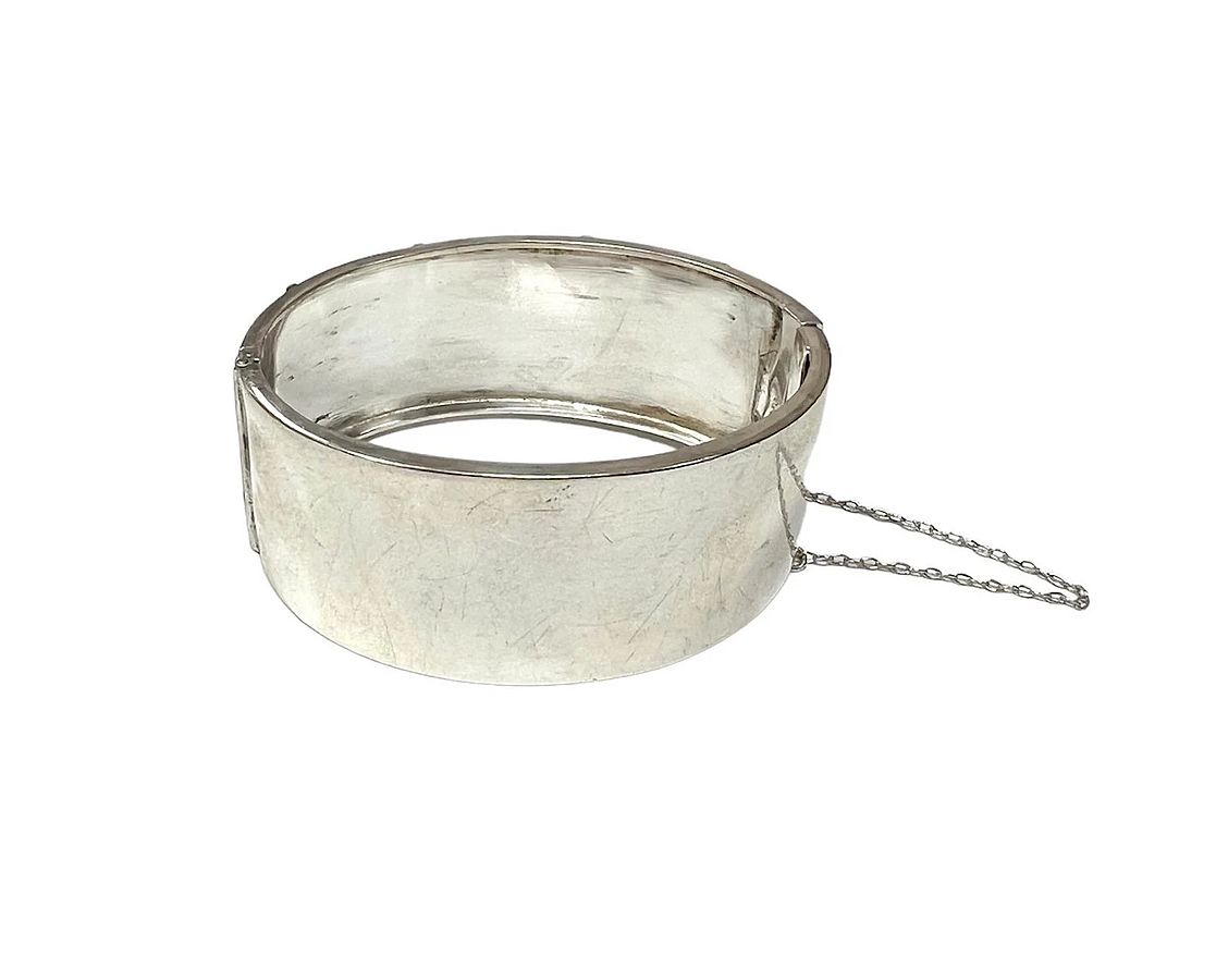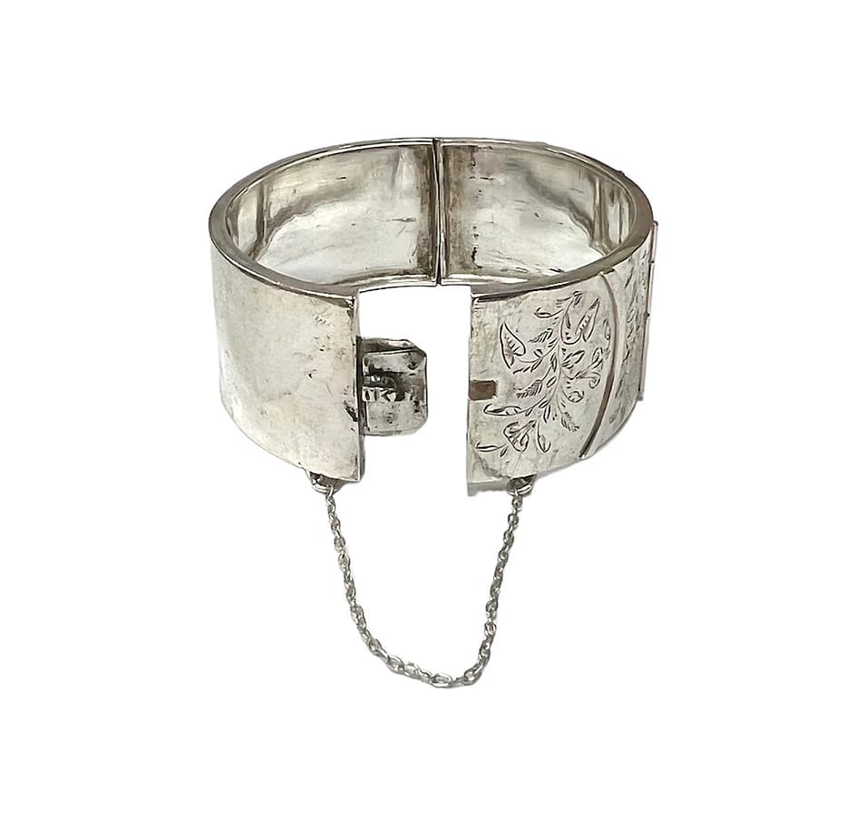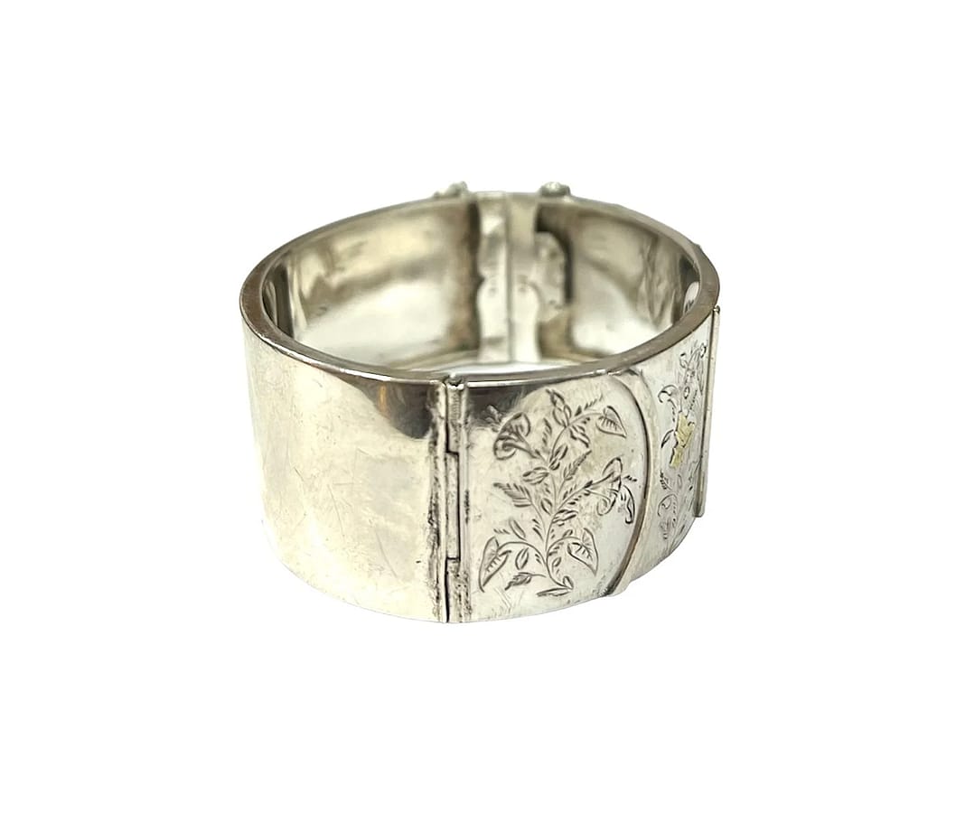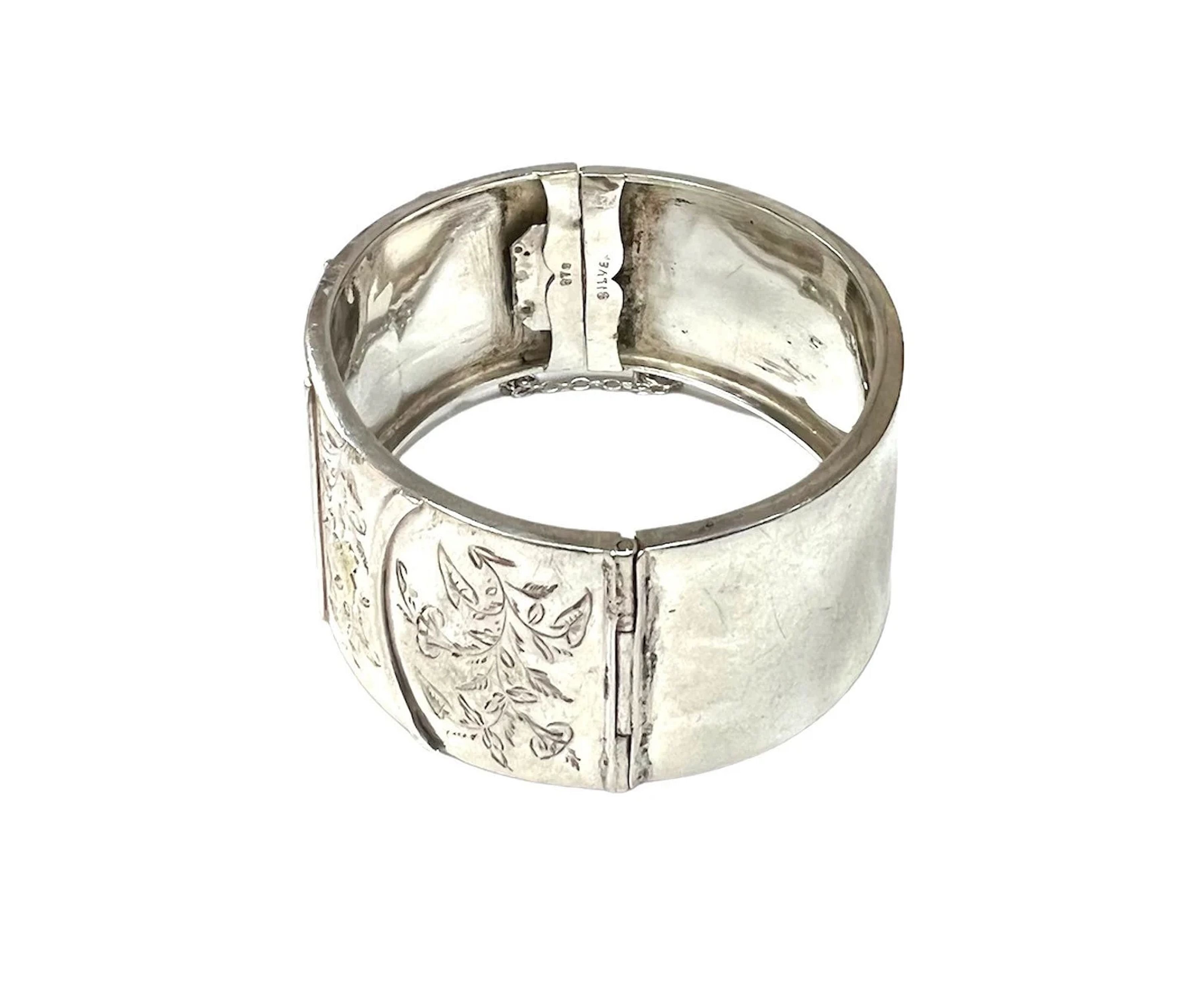 This antique Victorian silver bangle was handcrafted in or around 1890. Light and lovely, this romantic and sentimental bracelet is 1 inch wide and weighs 22.6 grams. It is very comfortable to wear, fitting a wrist up to 7 inches.