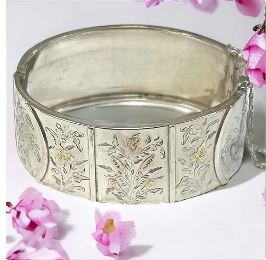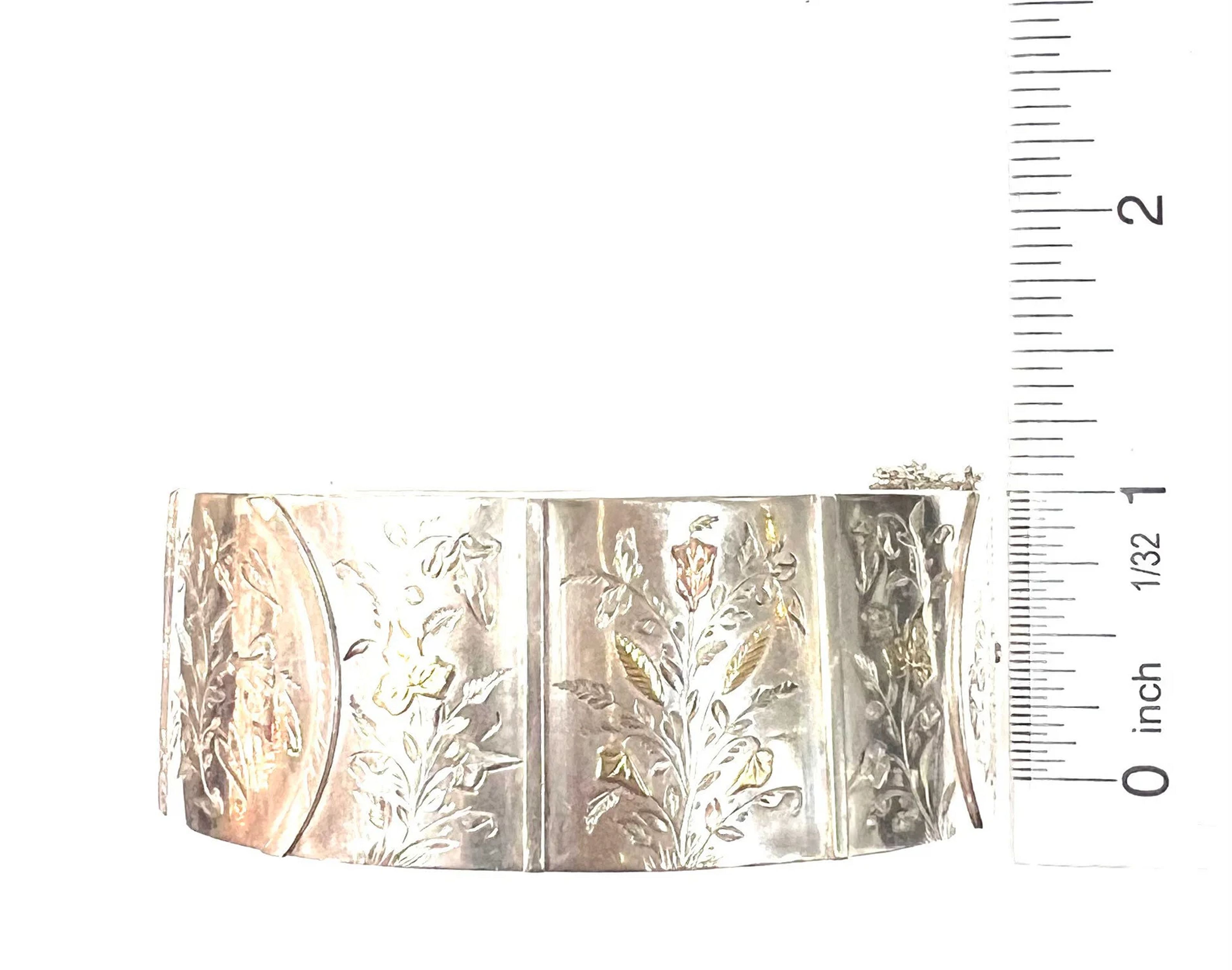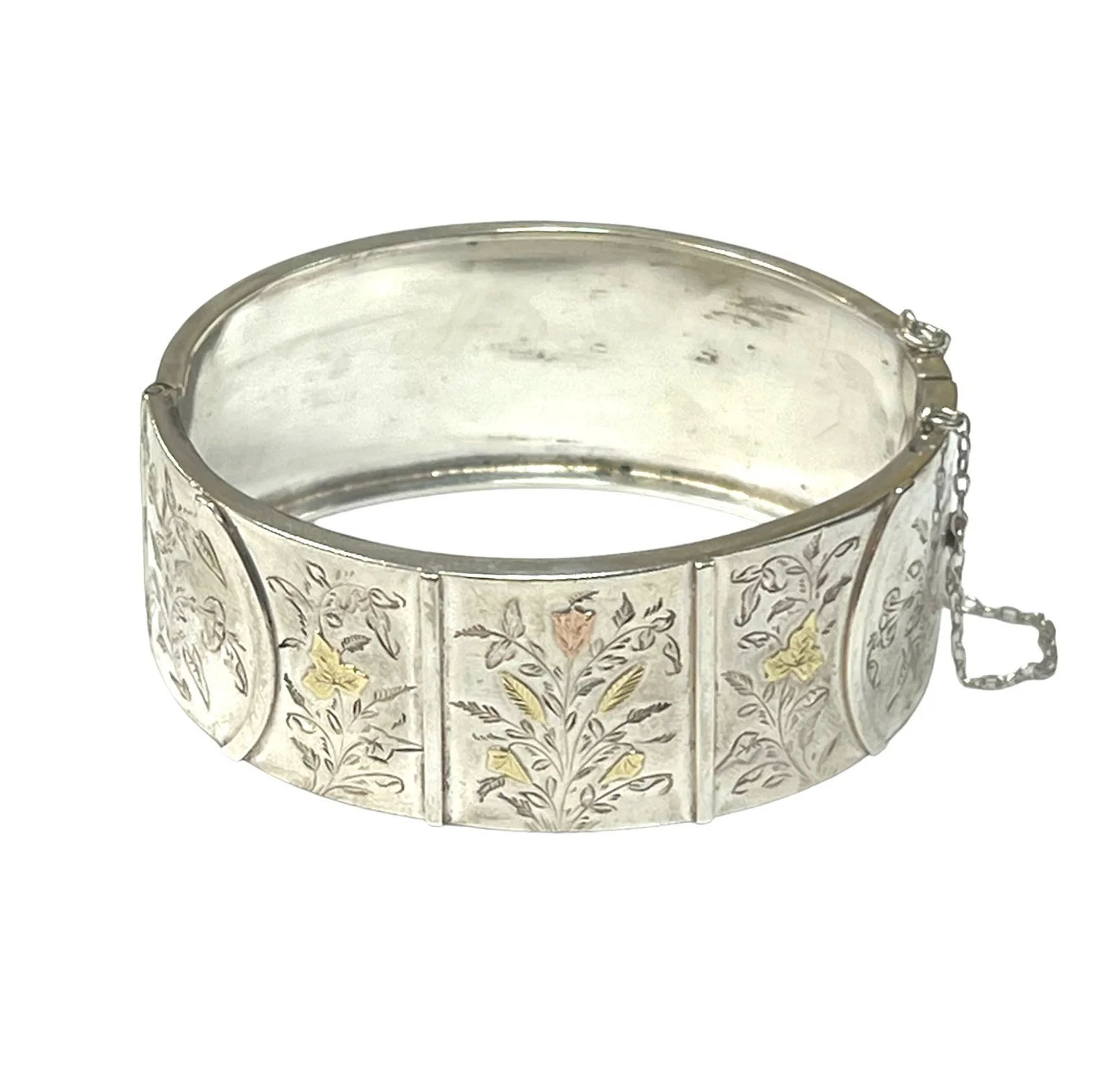 1890s Victorian Mixed Metal Bangle in Sterling Silver with applications of a pink gold rose and yellow gold leaves that are applied over the engraved design.