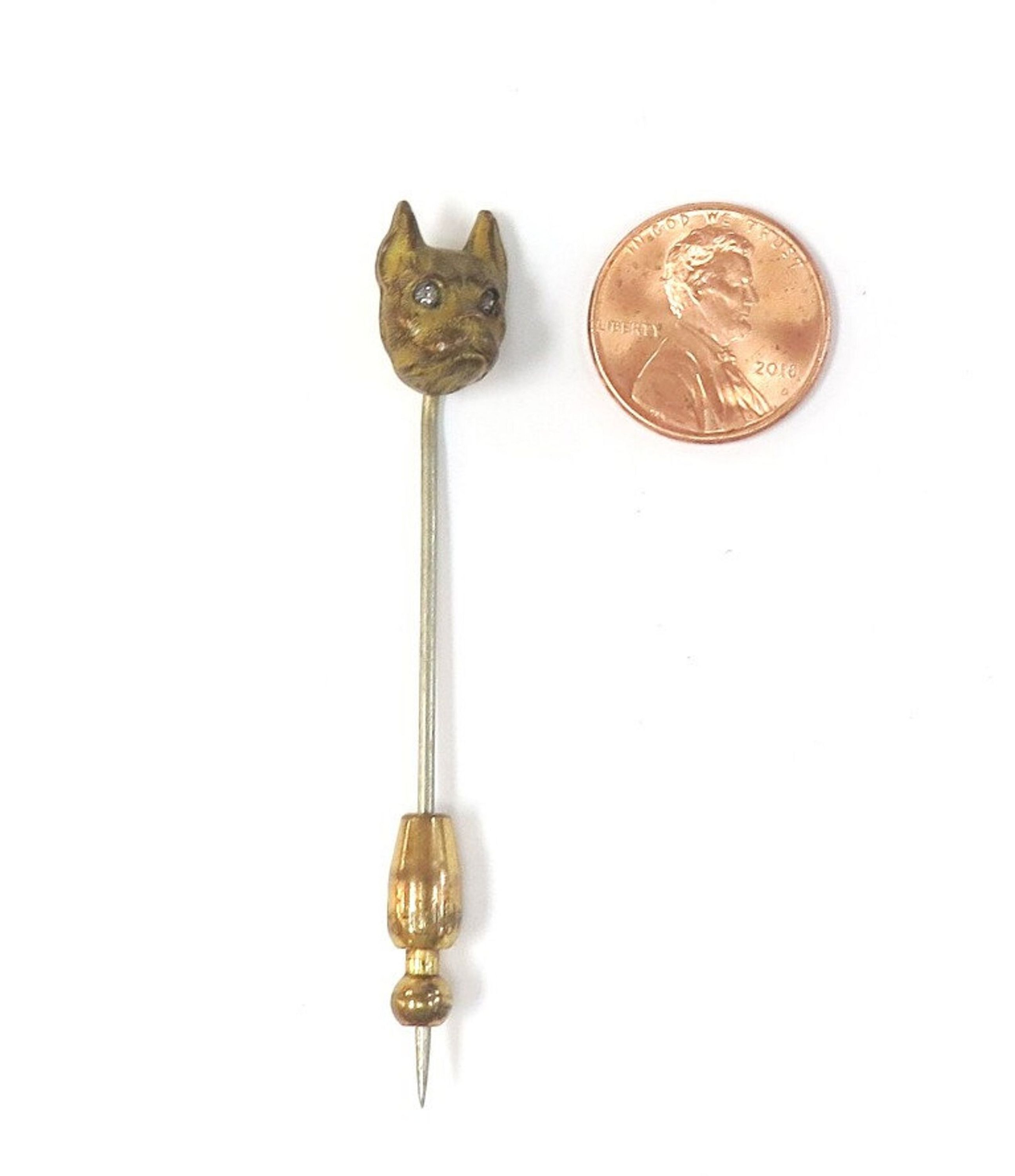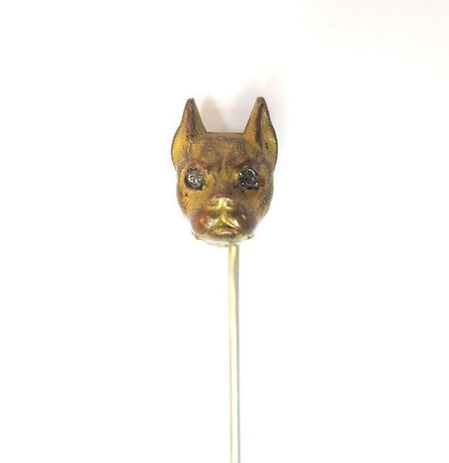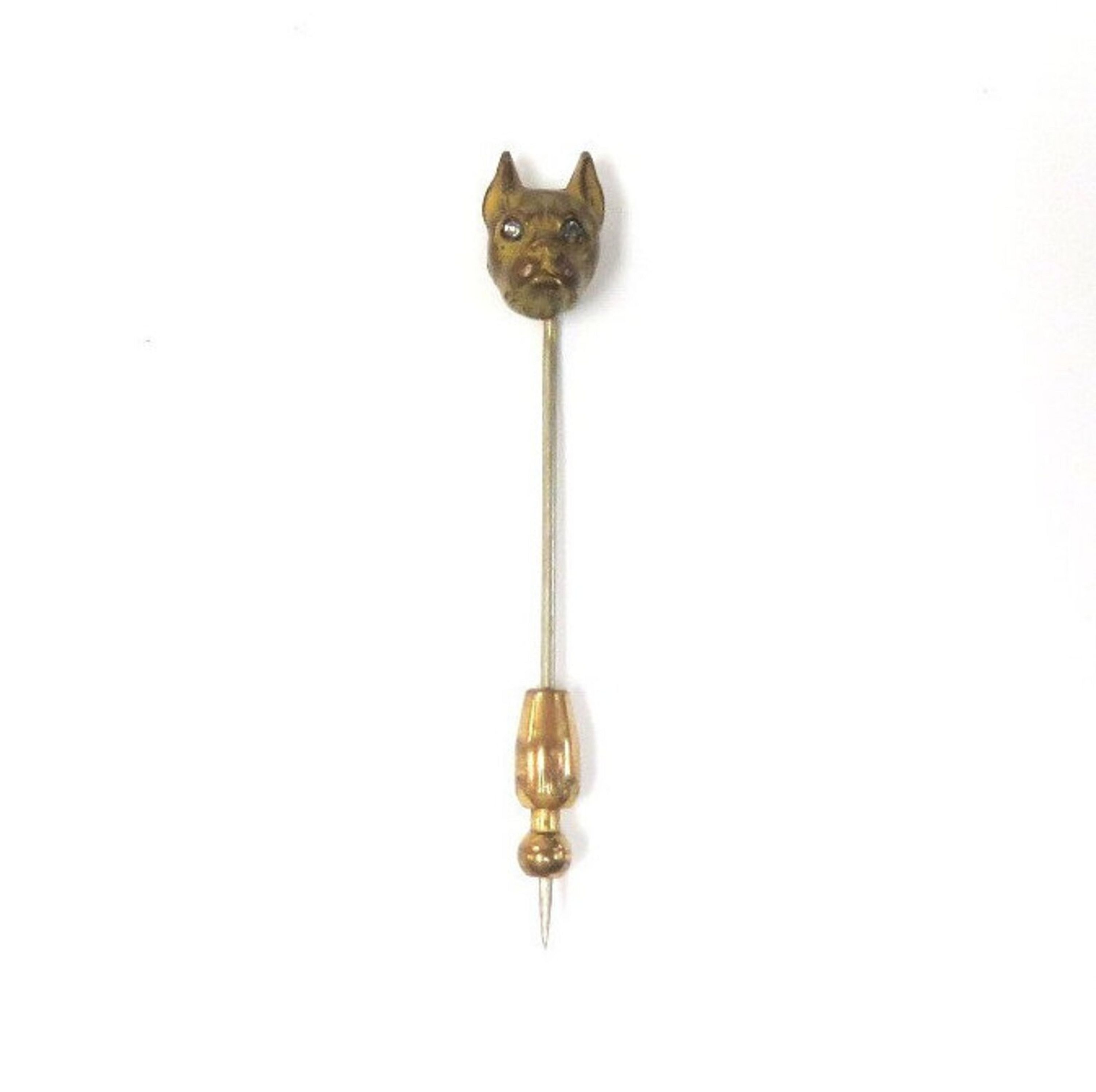 We're not sure if this very old bronze stick pin is a Boxer, a Bulldog, a Pug, or a Boston Terrier. We only know he's very cute and has sparkling rhinestone eyes. You decide! Weight: 3.5 Grams