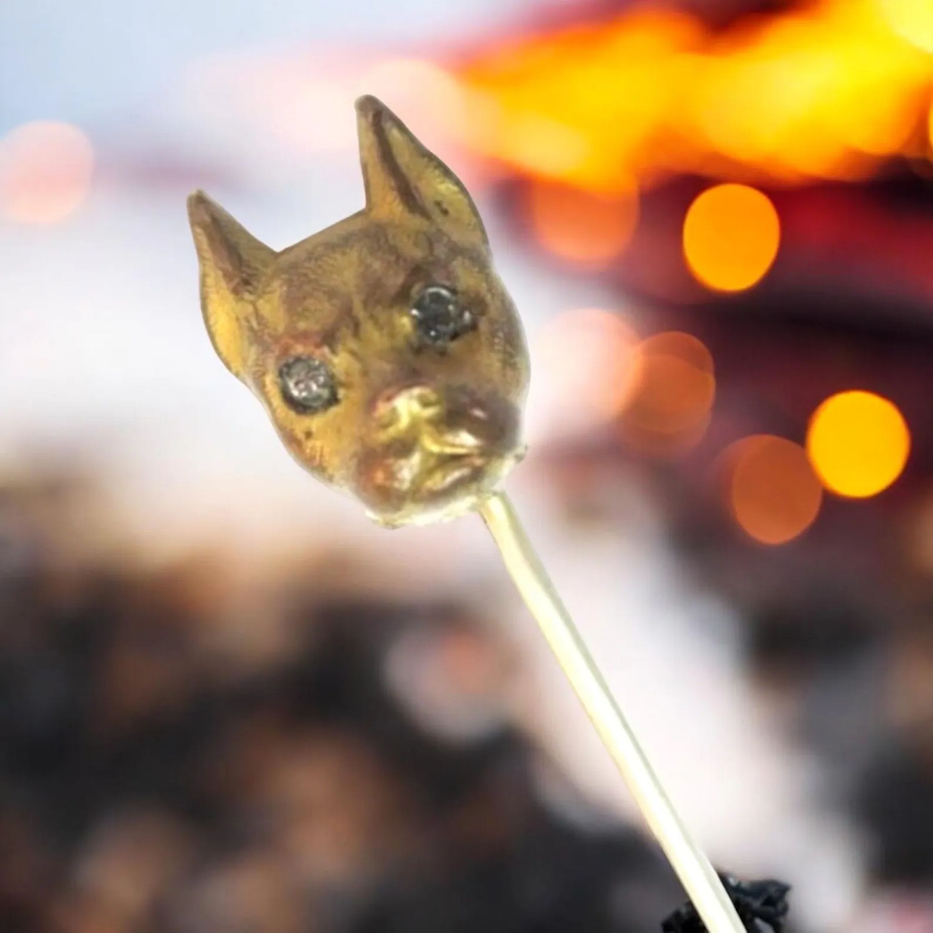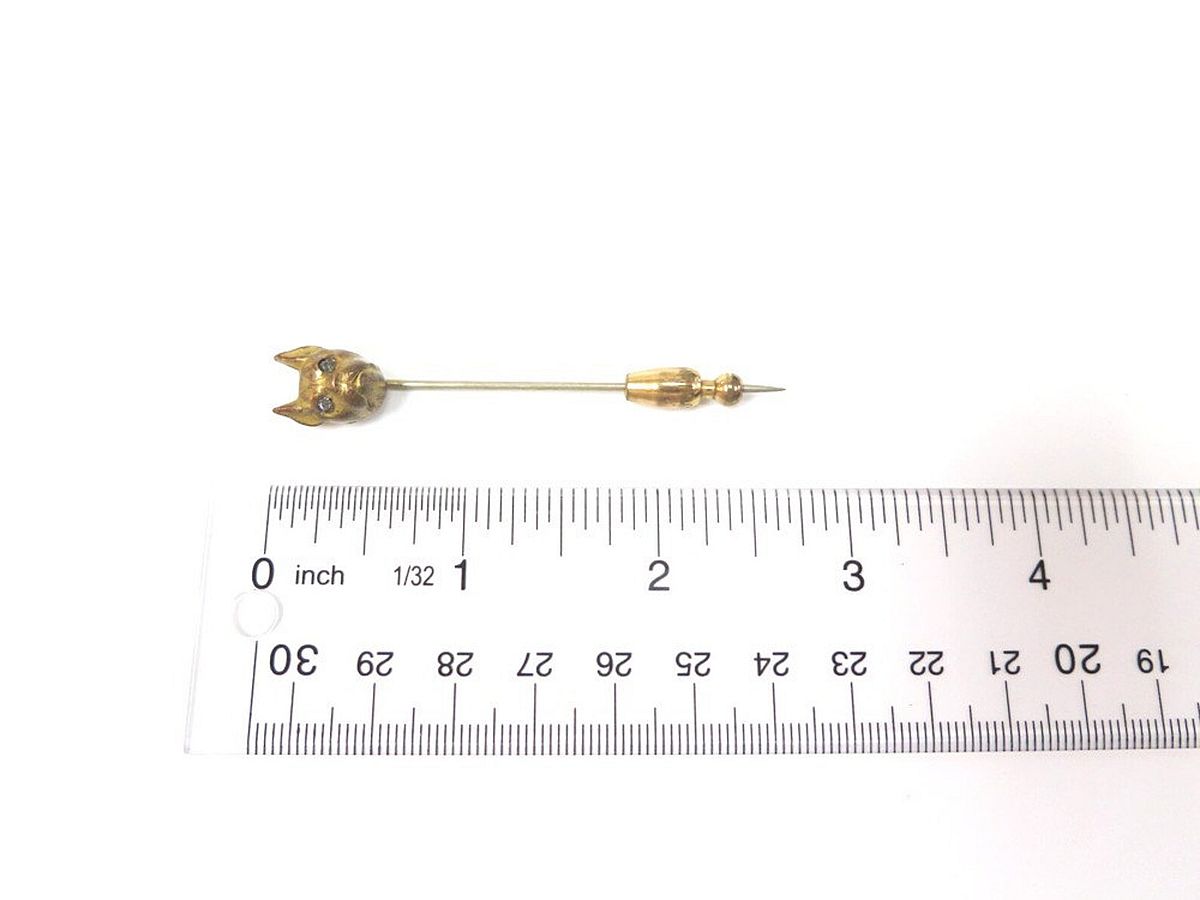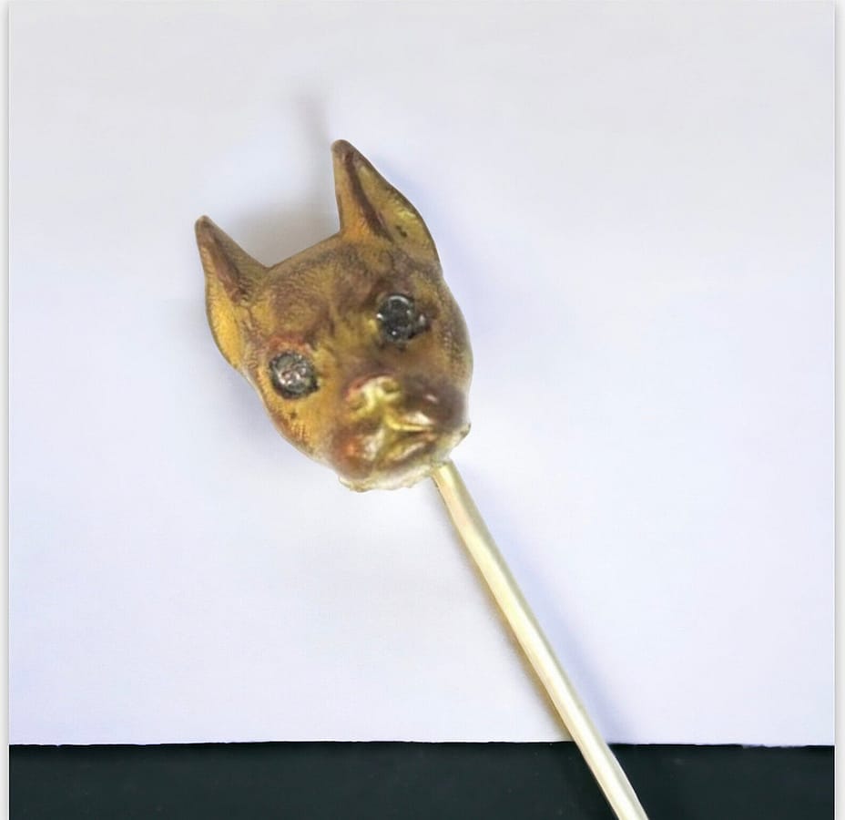 We're not sure if this very old bronze stick pin is a Boxer, a Bulldog, a Pug, or a Boston Terrier. We only know he's very cute and has sparkling rhinestone eyes. You decide! Weight: 3.5 Grams