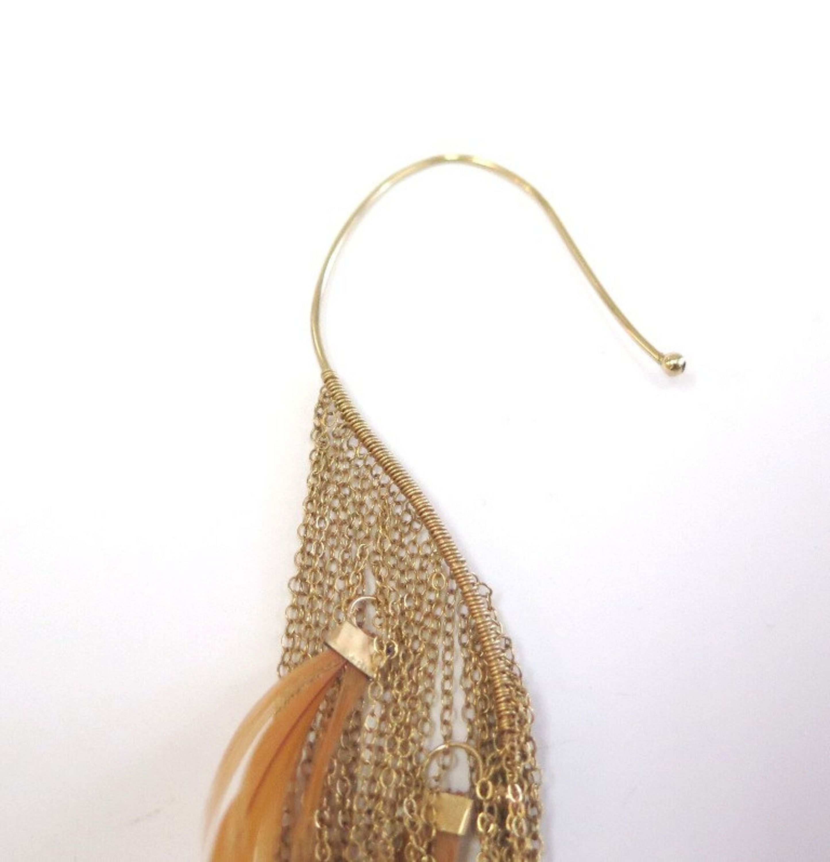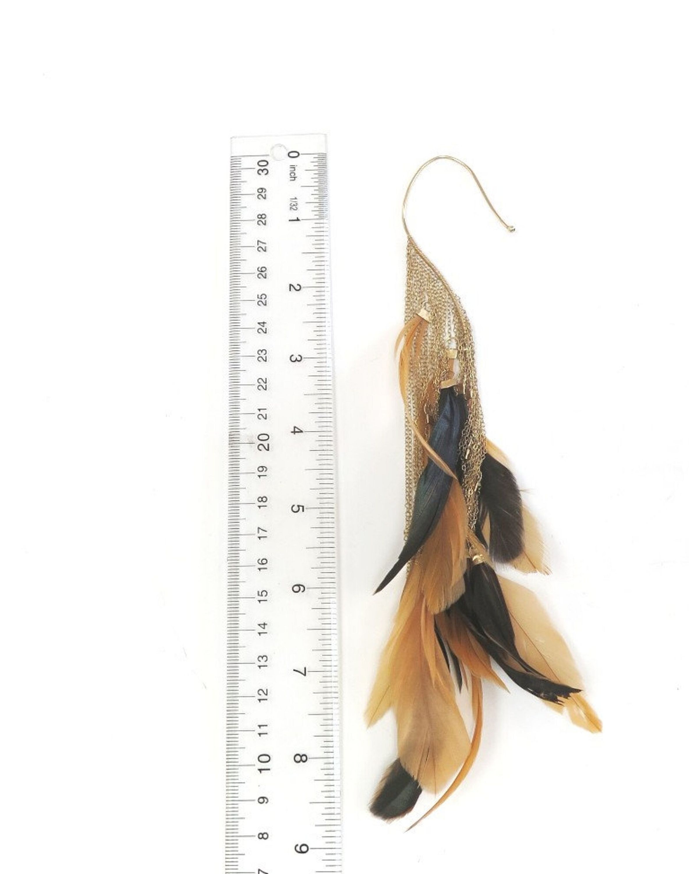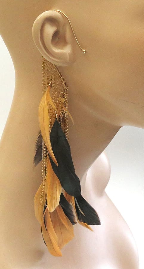 This single ear feather is a non pierced earring that dangles from the wire that goes over and around your ear. The dramatic look this gives you will make a statement. The black and orange feathers dangle from goldtone chains.
