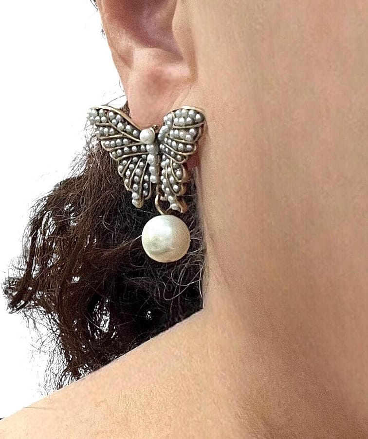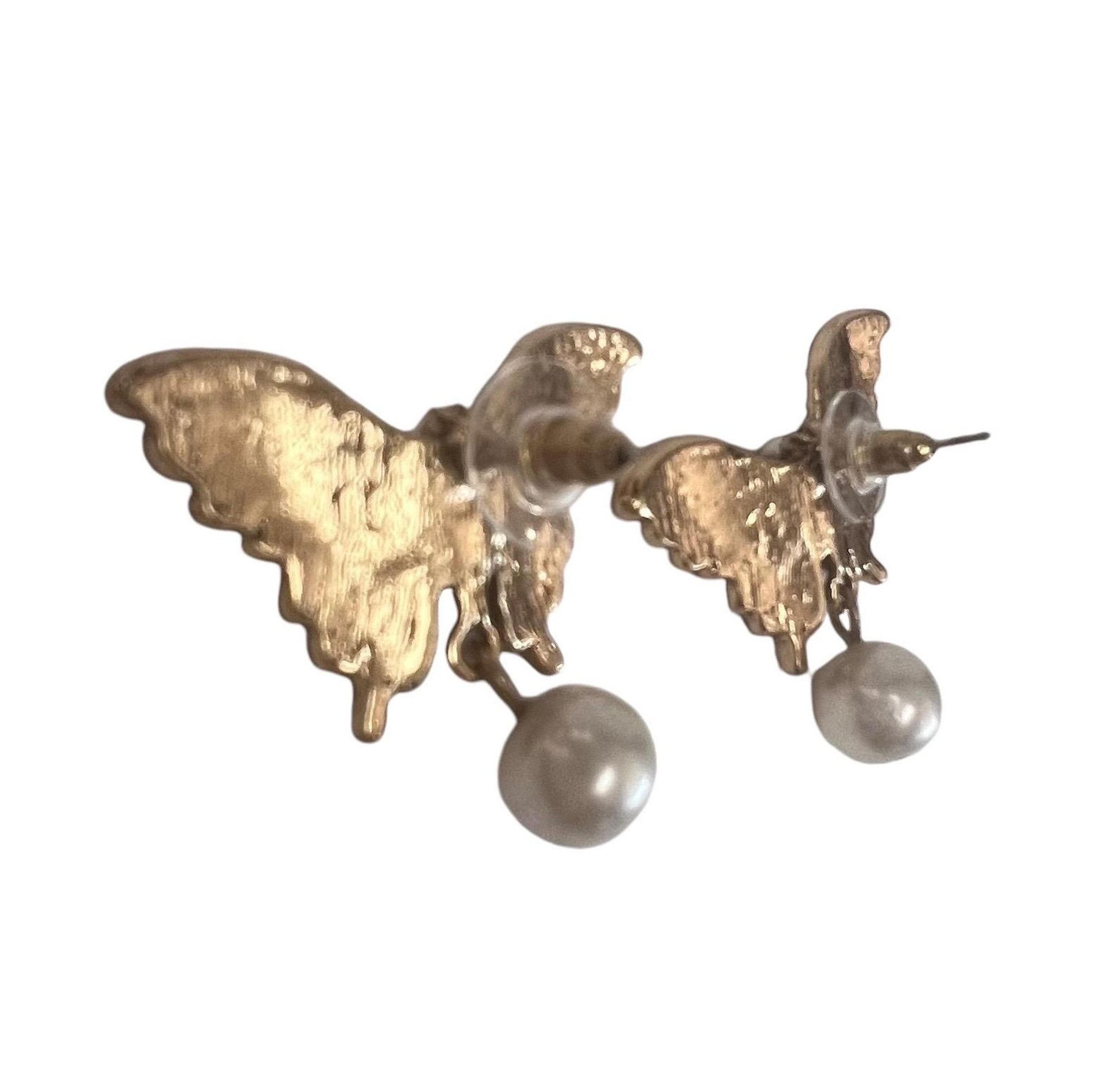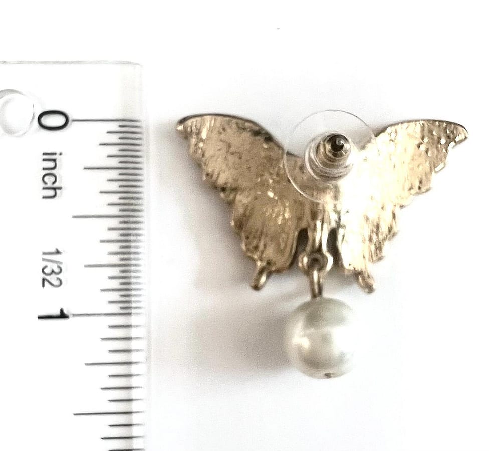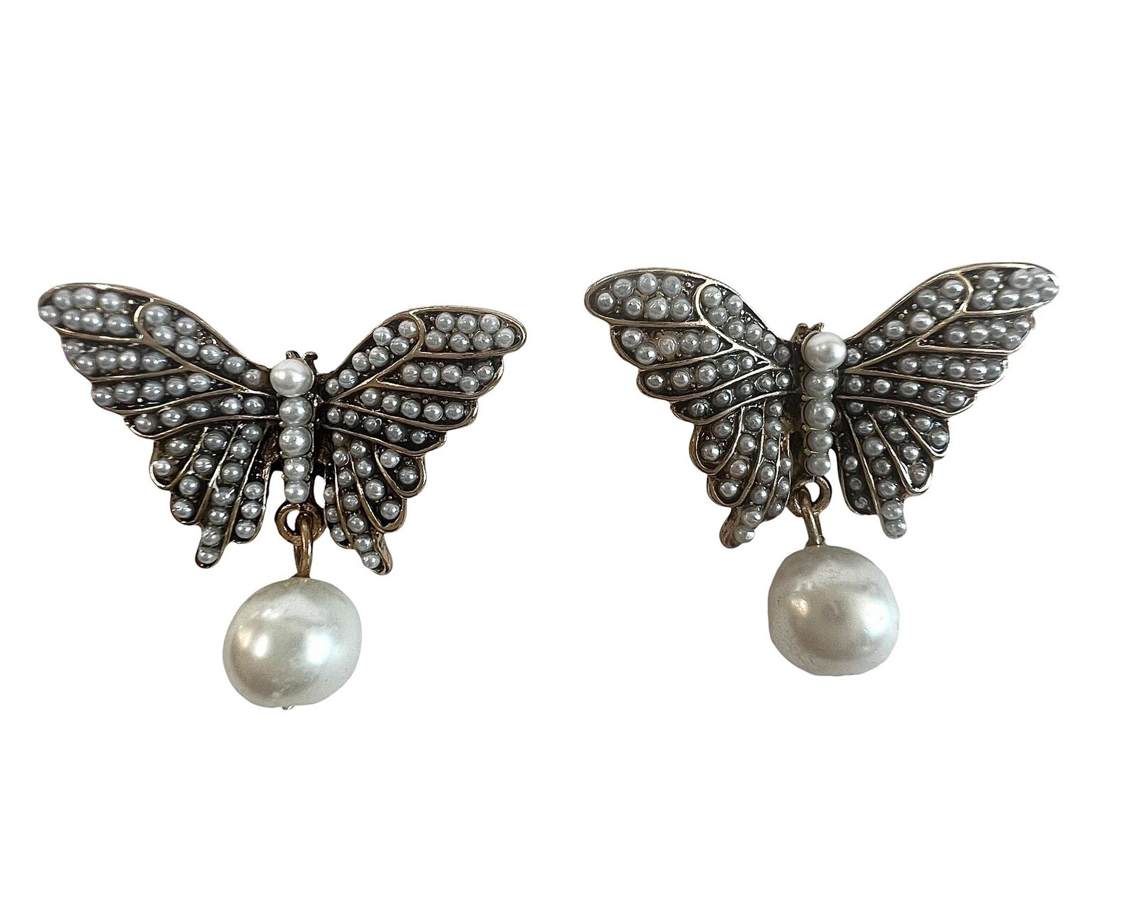 Butterflies are both elegant and graceful. These bold earrings feature pearl encrusted wings with a single pearl dangling drop. Take flight with these gorgeous butterfly earrings that close with a post backing.