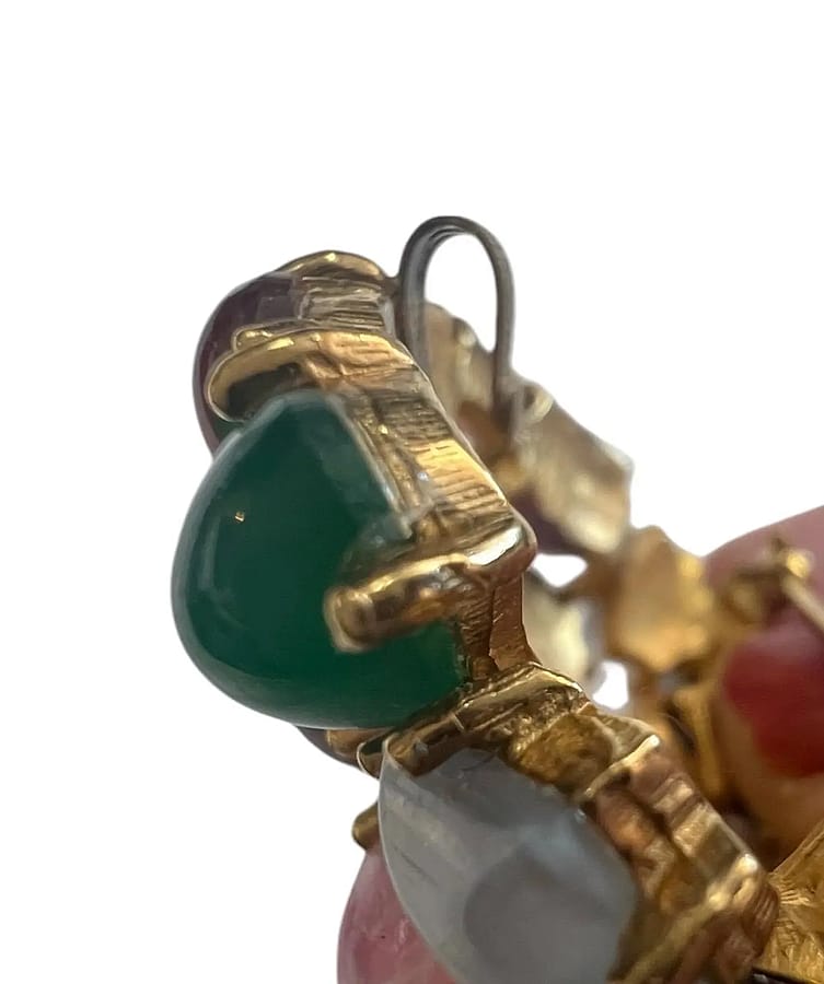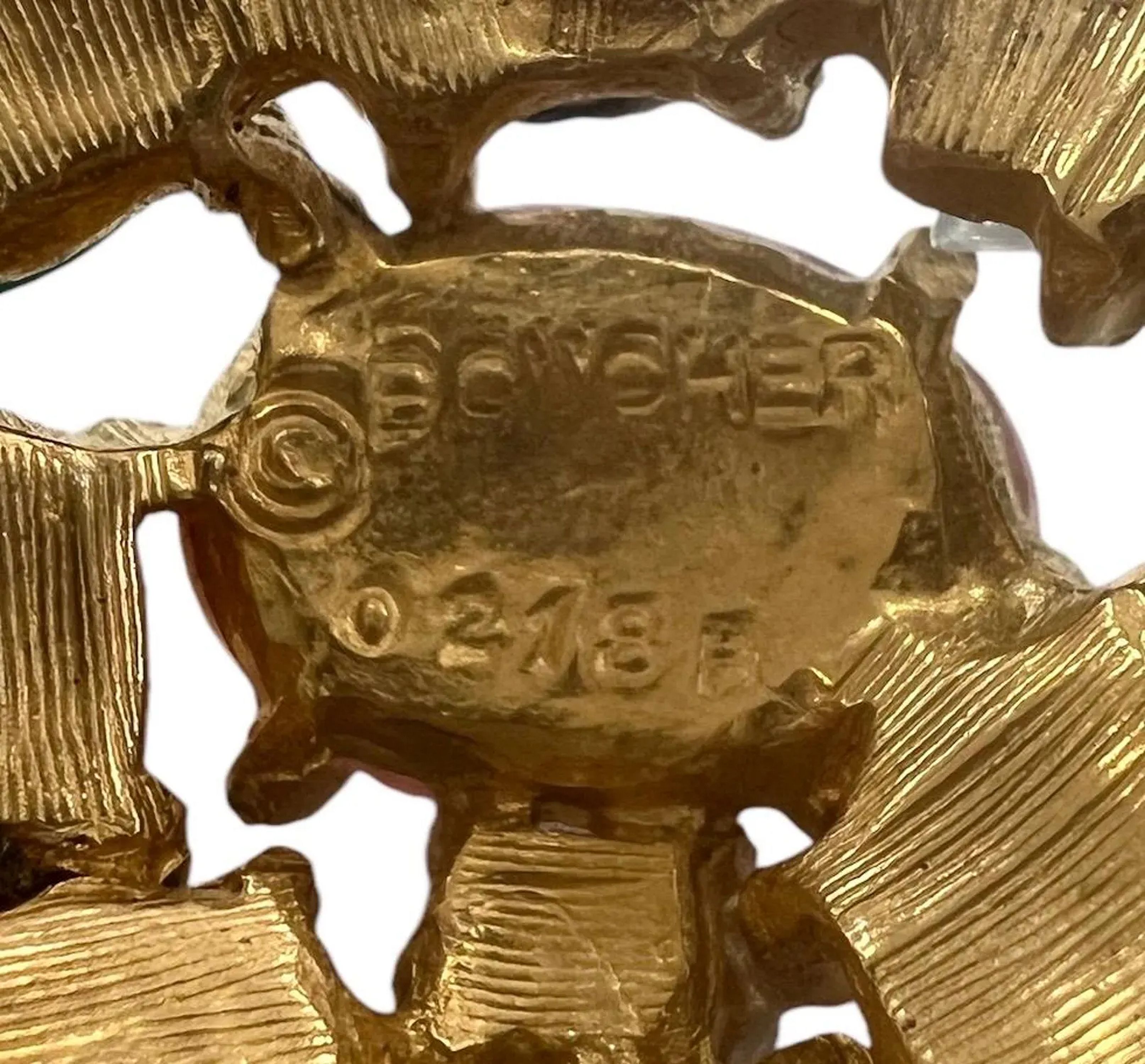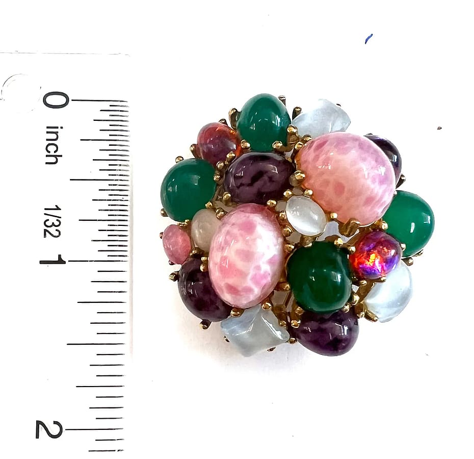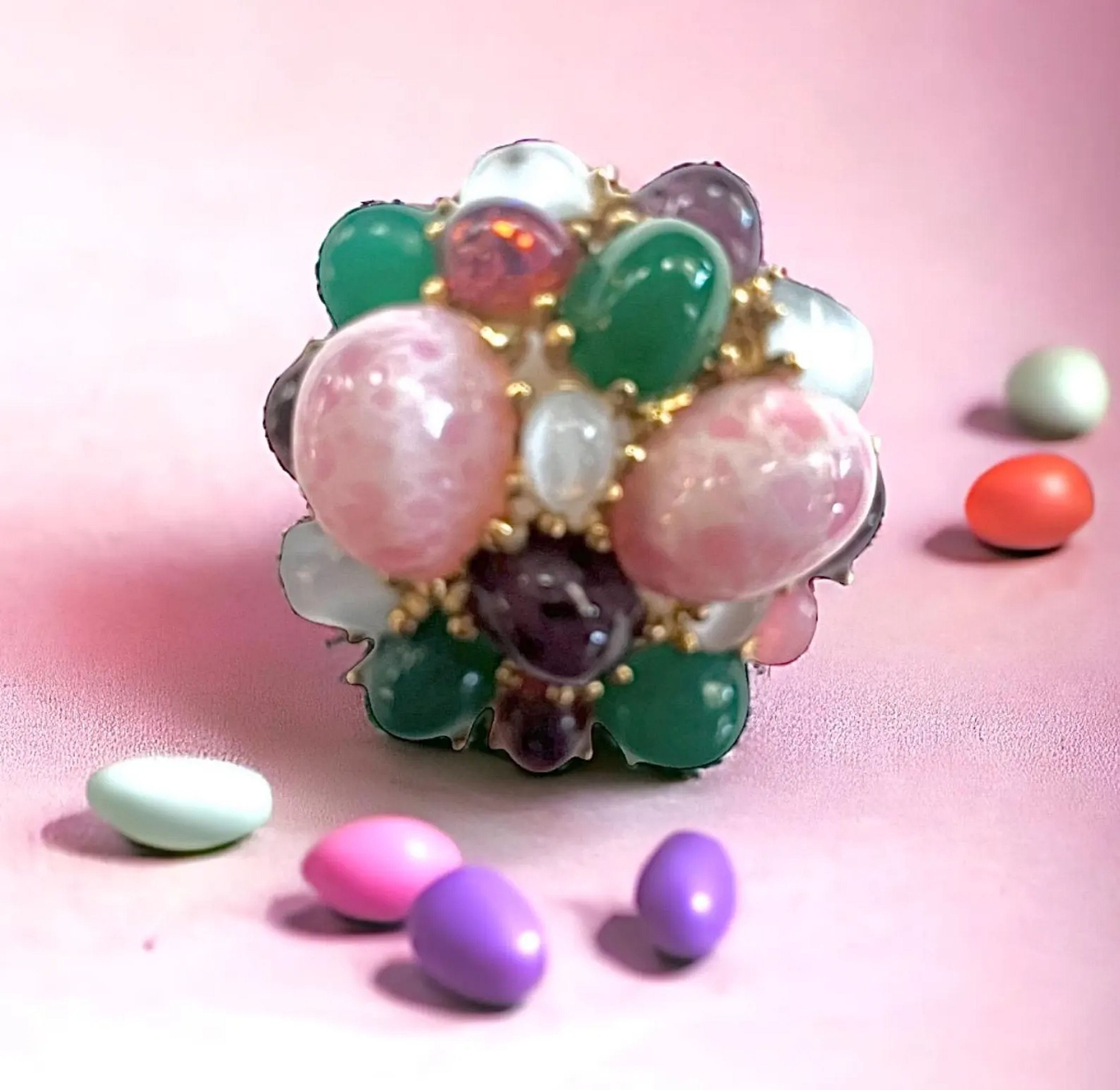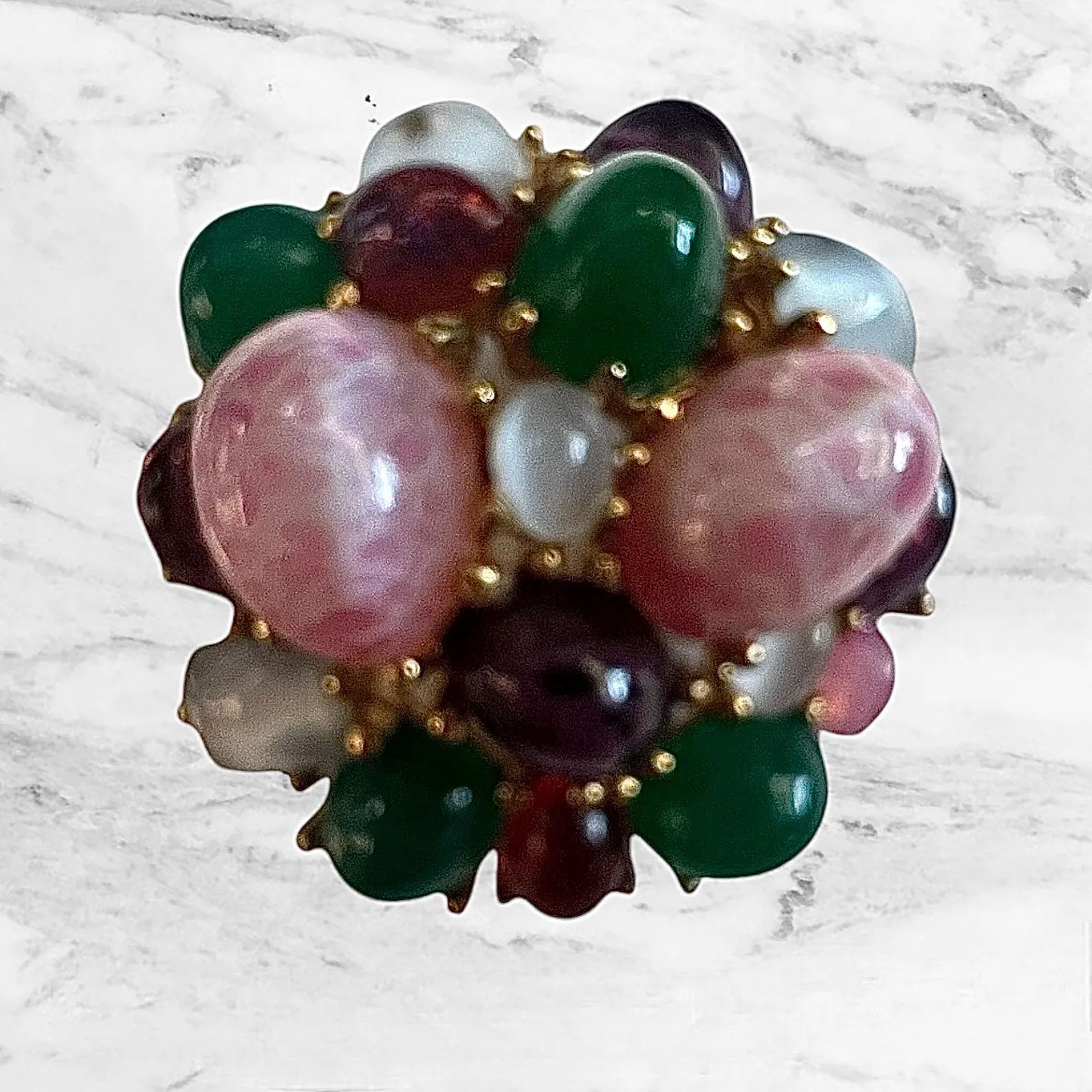 Signed and numbered Boucher Pin / Pendant. This pretty costume pin looks like it has genuine stones and real gold. You can wear it as a pin or a pendant. It has a juicy look as if there's jelly beans and fruit on it. 😊 Diameter: 1 1/2"