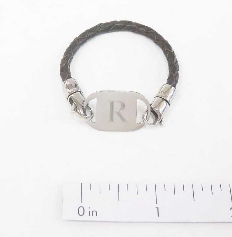 This adorable boys bracelet has a brown leather band with the initial "R" engraved on it. This makes a nice gift to any lucky boy with the "R" initial! Fits boys approx. 3 years old Weight: 8.0 Grams