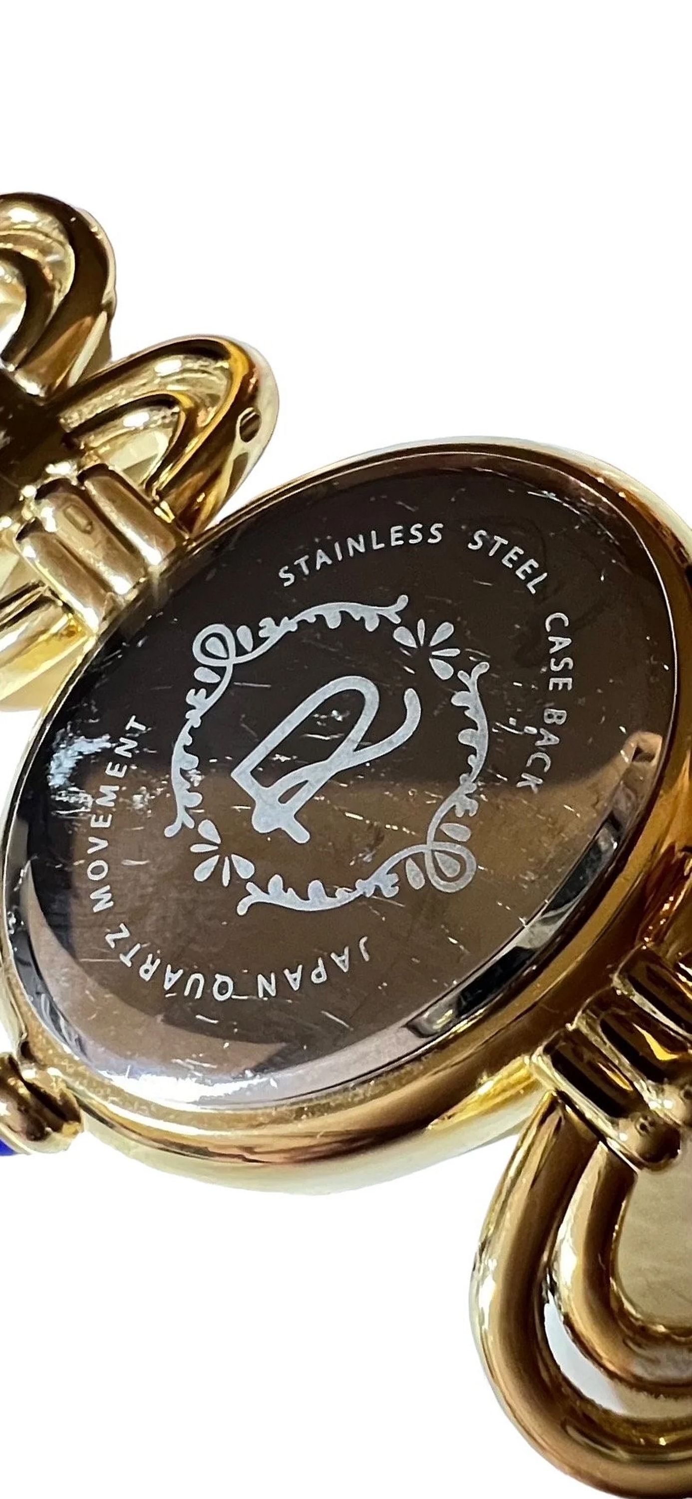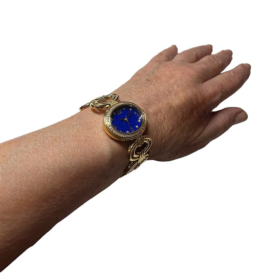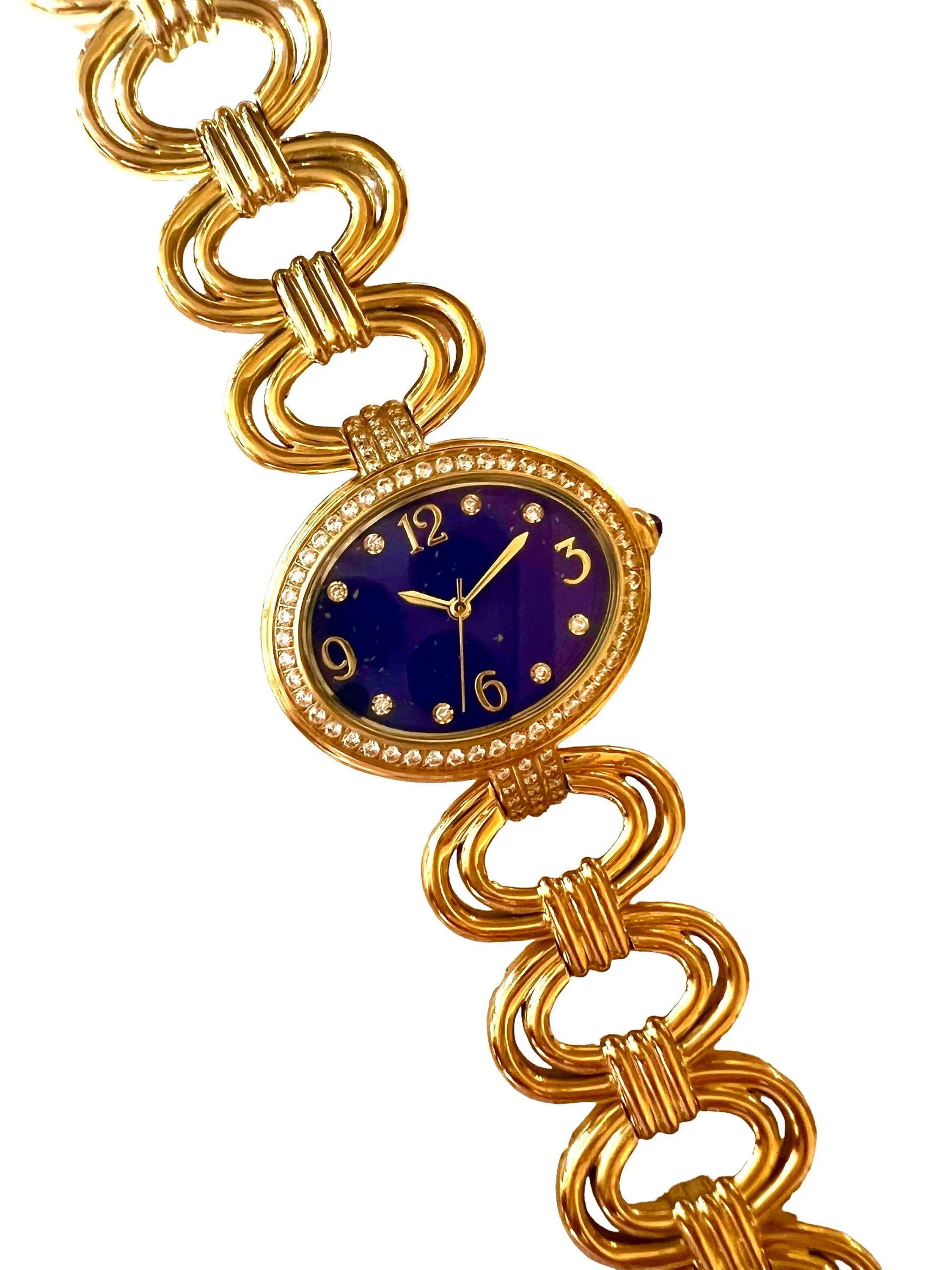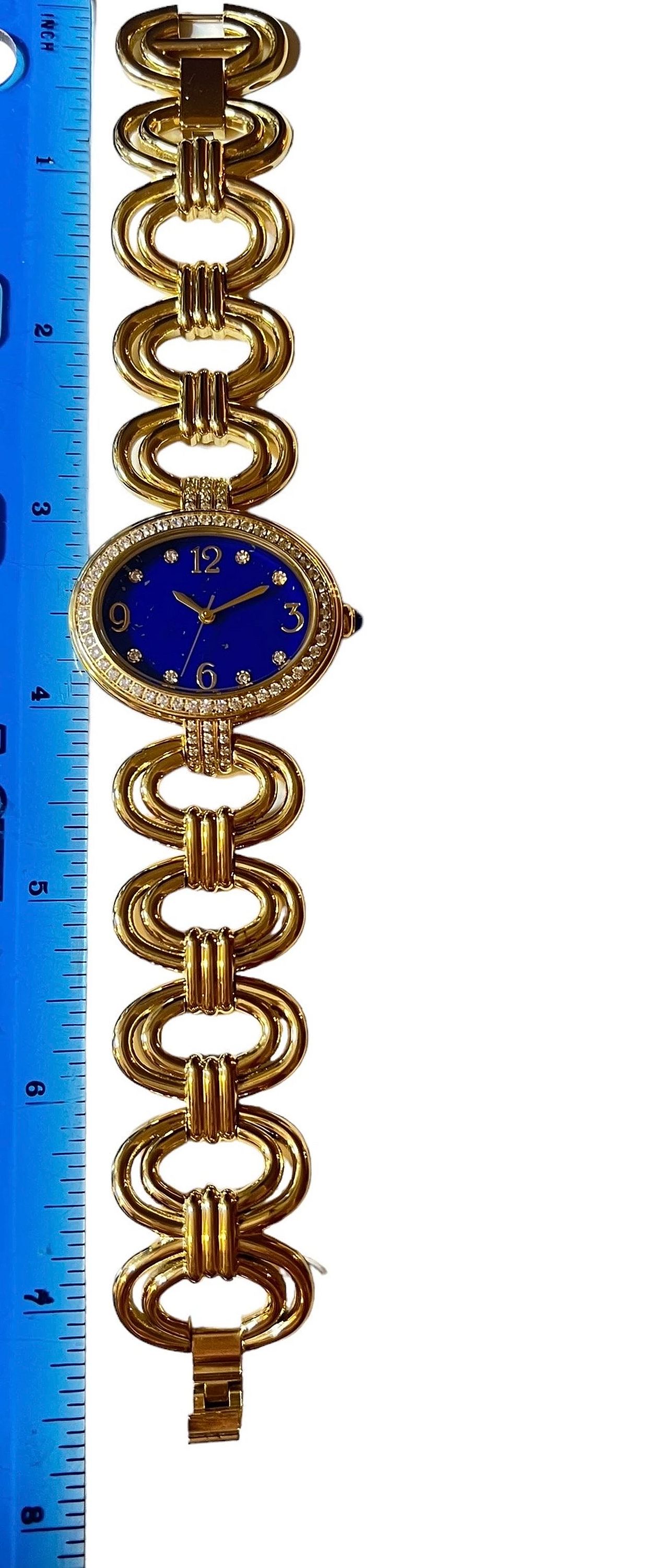 It has a Stainless steel gold-tone finish with Zircon markers, a quartz movement, a flat mineral crystal, and a Lapis cabochon crown. The oval bracelet links have a fold-over clasp with removable extender links.