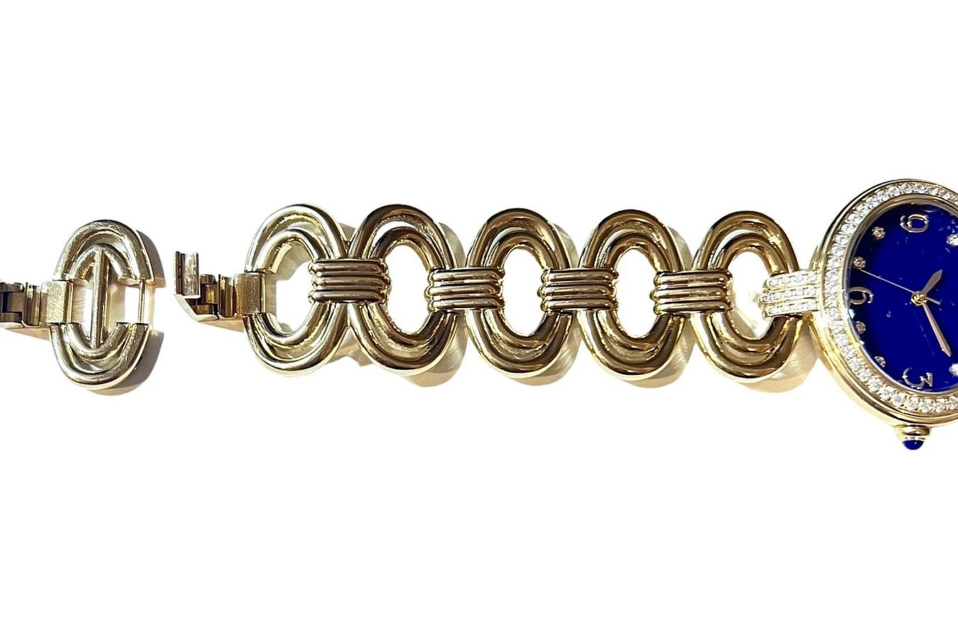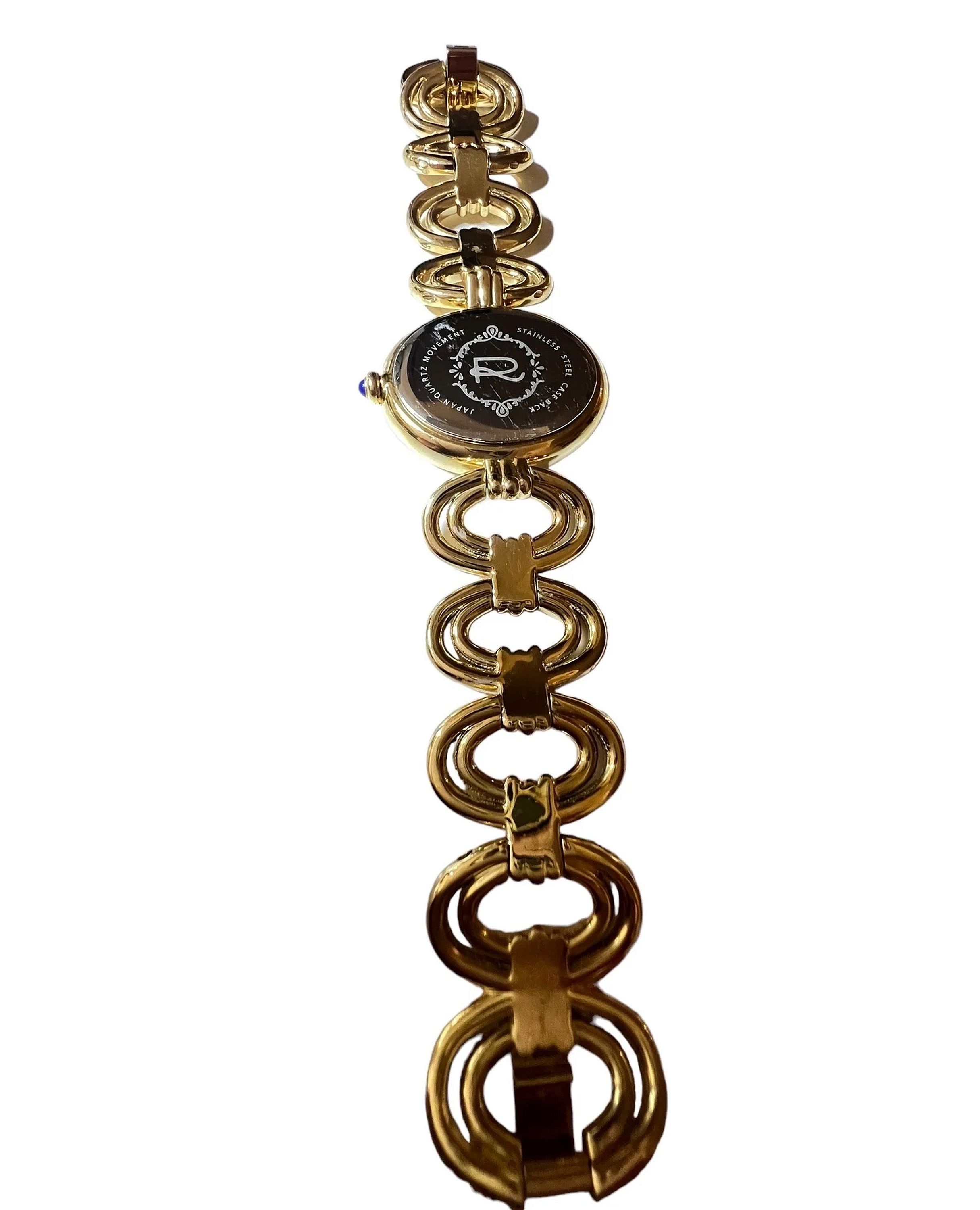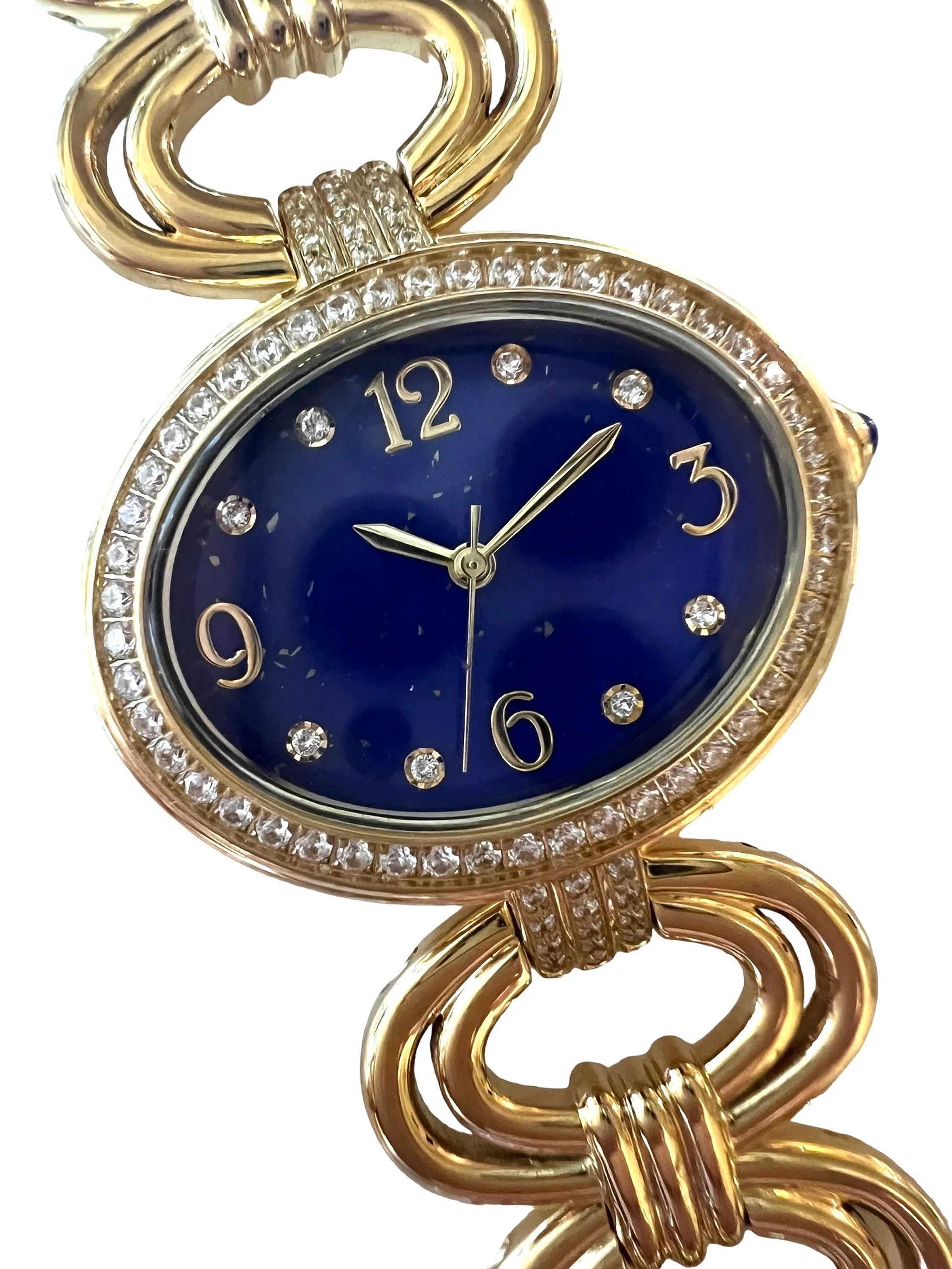 It has a Stainless steel gold-tone finish with Zircon markers, a quartz movement, a flat mineral crystal, and a Lapis cabochon crown. The oval bracelet links have a fold-over clasp with removable extender links.