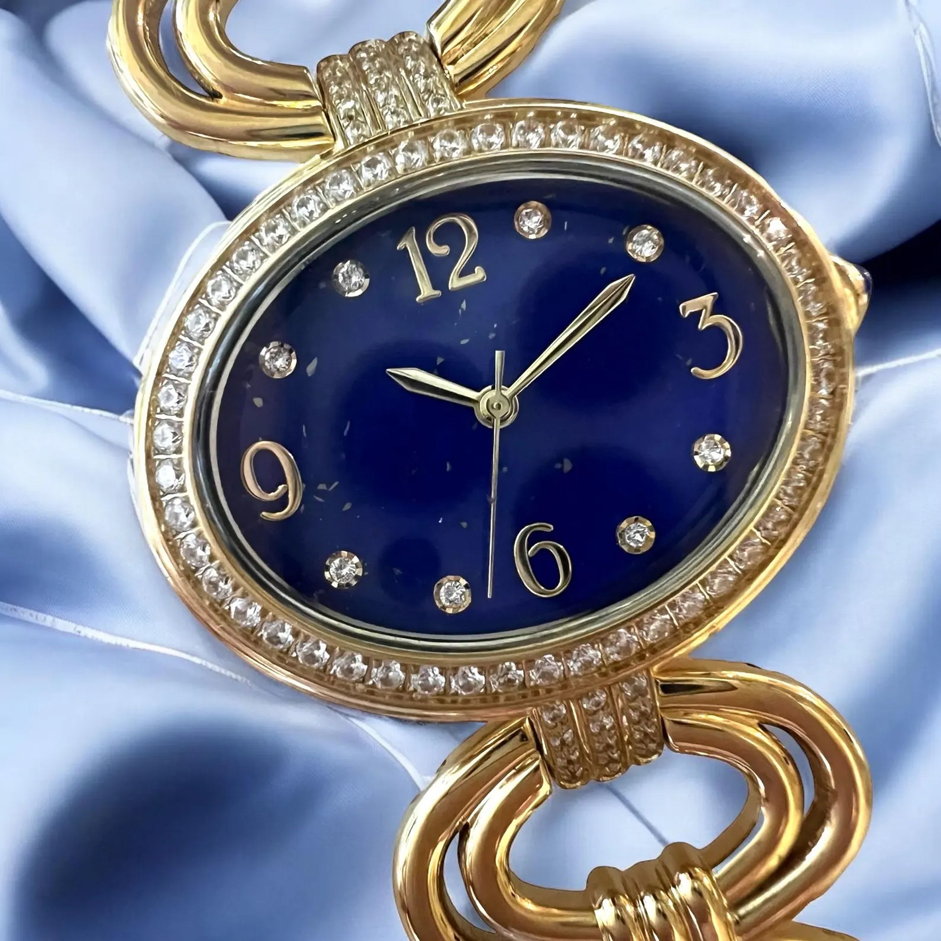is easy to adjust from (6" to 7-1/4") and just snaps off and on. The Lapis dial is accented by Cubic Zirconia (faux diamonds).