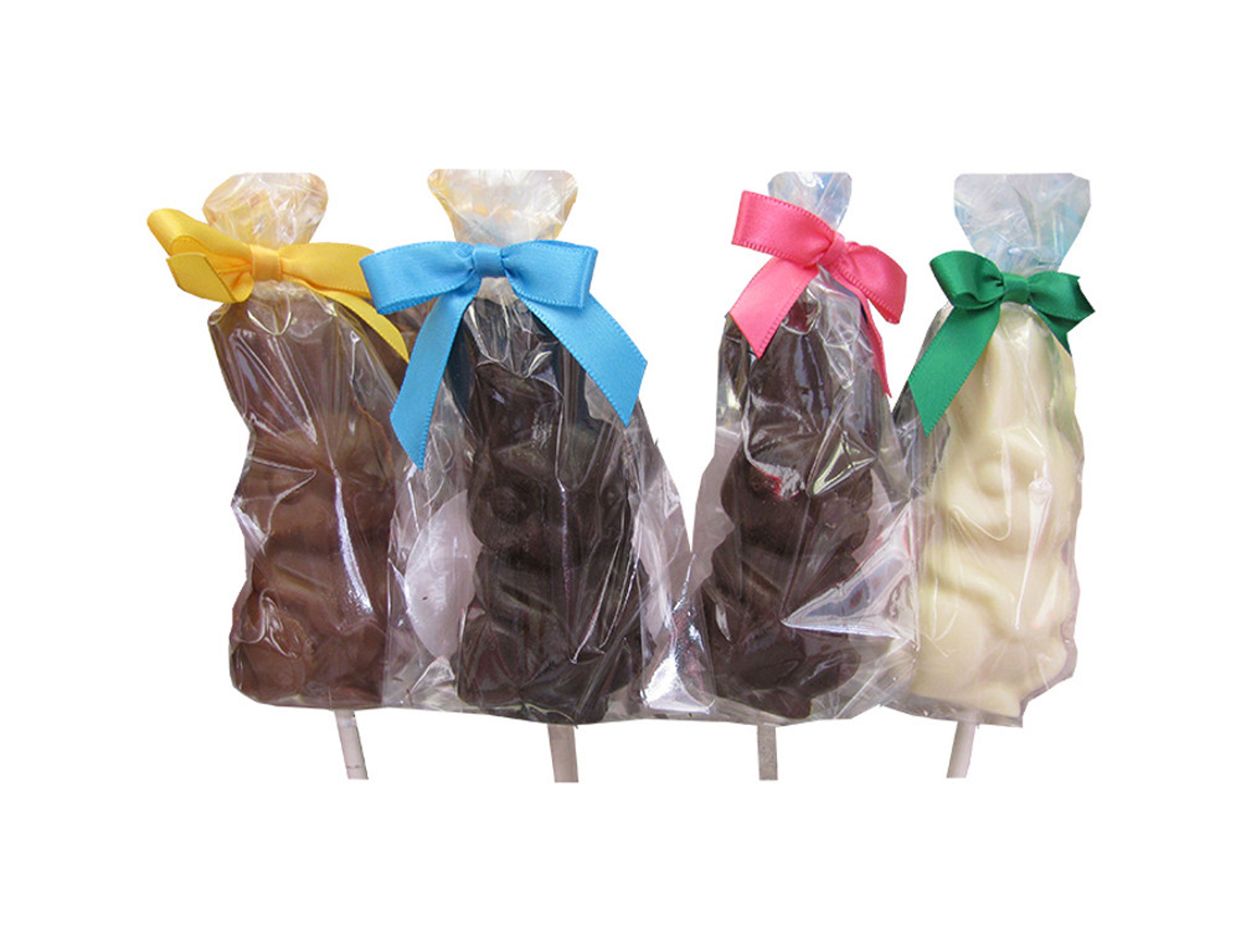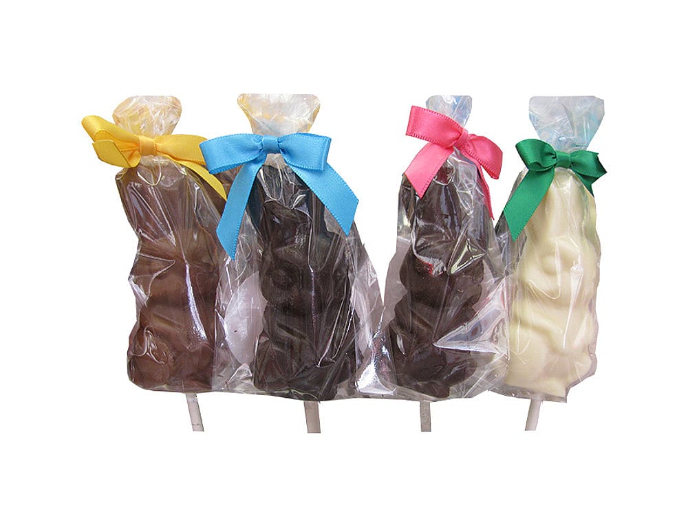 Solid premium chocolate Easter Bunny Lollipop, available in milk, dark or white chocolate. Decoration may vary. 1 oz. 3" x 1 1/2".