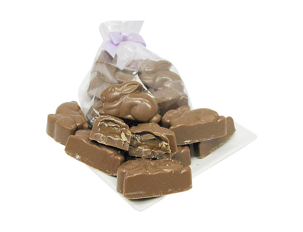 Caramel-filled Easter Bunnies in Milk Chocolate in bag with a ribbon. .23 lbs.