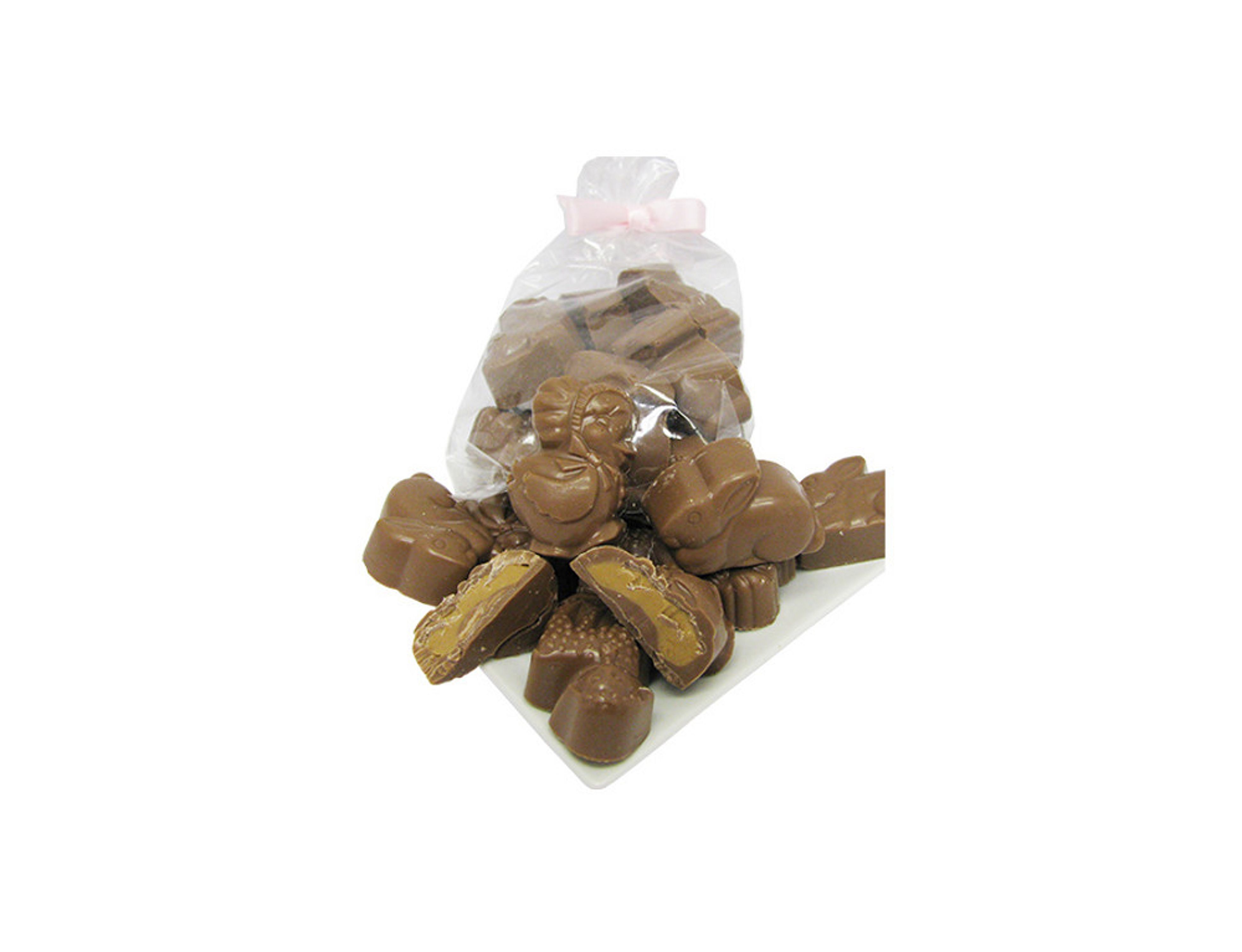 Peanut Butter-filled Easter Bunnies and Chicks in Milk Chocolate in a bag with a ribbon. .23 lbs.
