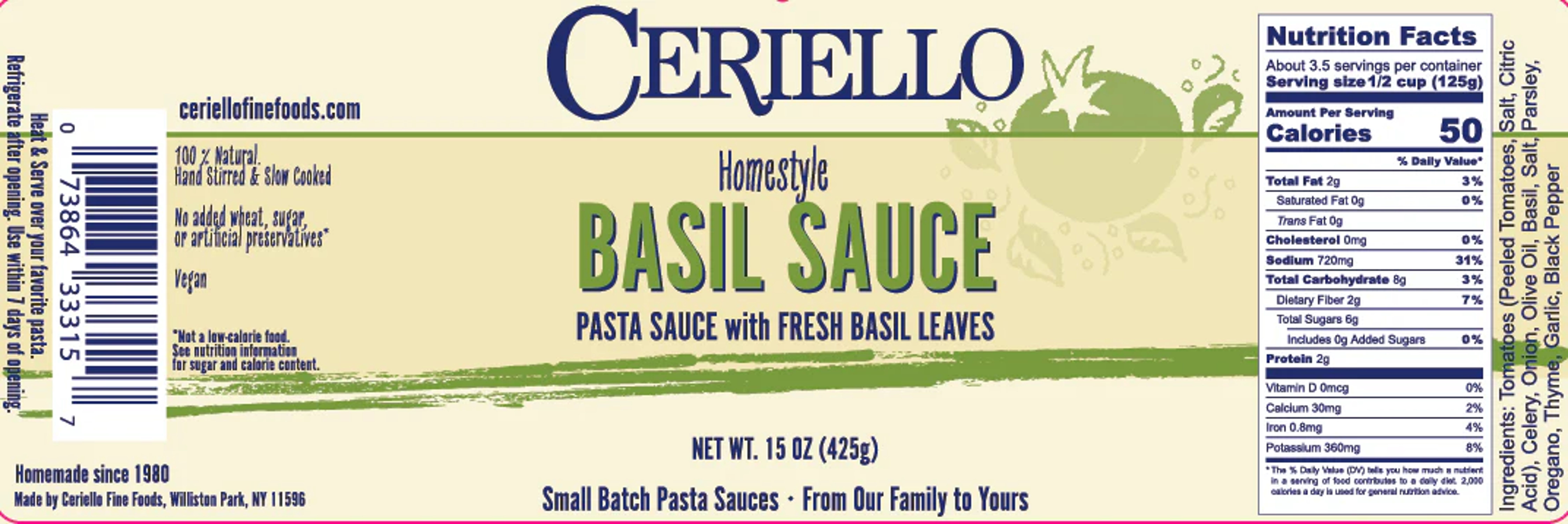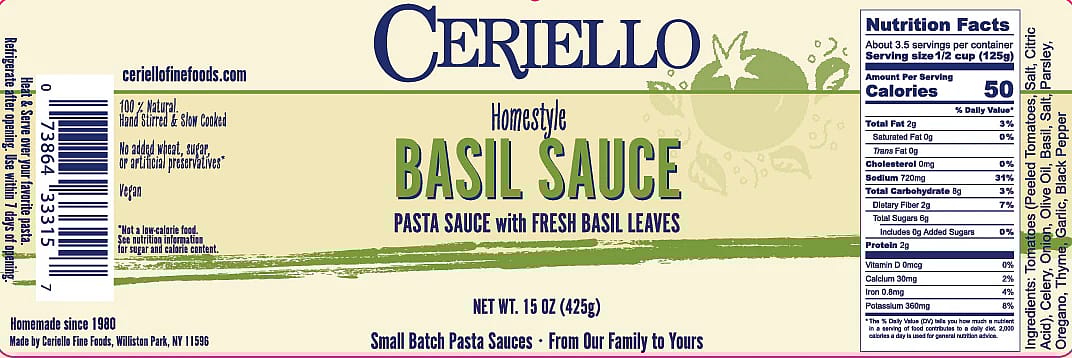 Our Tomato-based Basil Sauce is the perfect blend of chunky & strained tomatoes, this is a moderately thick sauce infused with the fragrant flavor of fresh basil. Serve it with shorter, chunkier cuts of fresh or dried pasta (like rigatoni). It's also great as a dressing on white fish, for veal pizzaiolo, or for slow-cooking pork tenderloin.